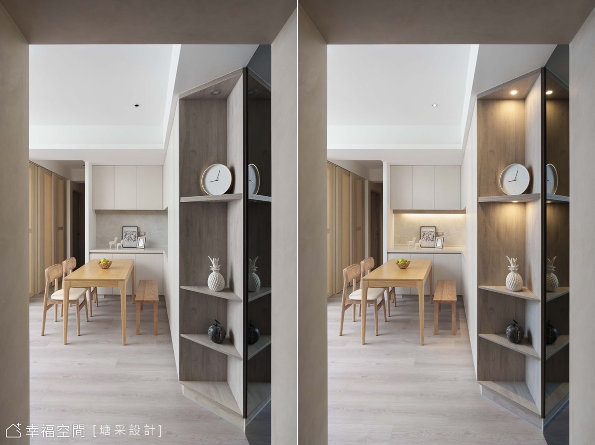 Một trong những điểm sáng sáng tạo nhất của dự án là việc tận dụng sự chênh lệch cao độ của trần nhà để thiết lập hệ thống lưu trữ trên cao. Thay vì để trống các khoảng trần, thiết kế đã biến chúng thành những ngăn chứa đồ kín đáo, giúp活 hóa (activate) tối đa công năng của ngôi nhà. Đây là giải pháp xử lý không gian theo chiều dọc đầy thông minh, giữ cho sàn nhà luôn thông thoáng mà vẫn đảm bảo khả năng lưu trữ khối lượng lớn vật dụng.