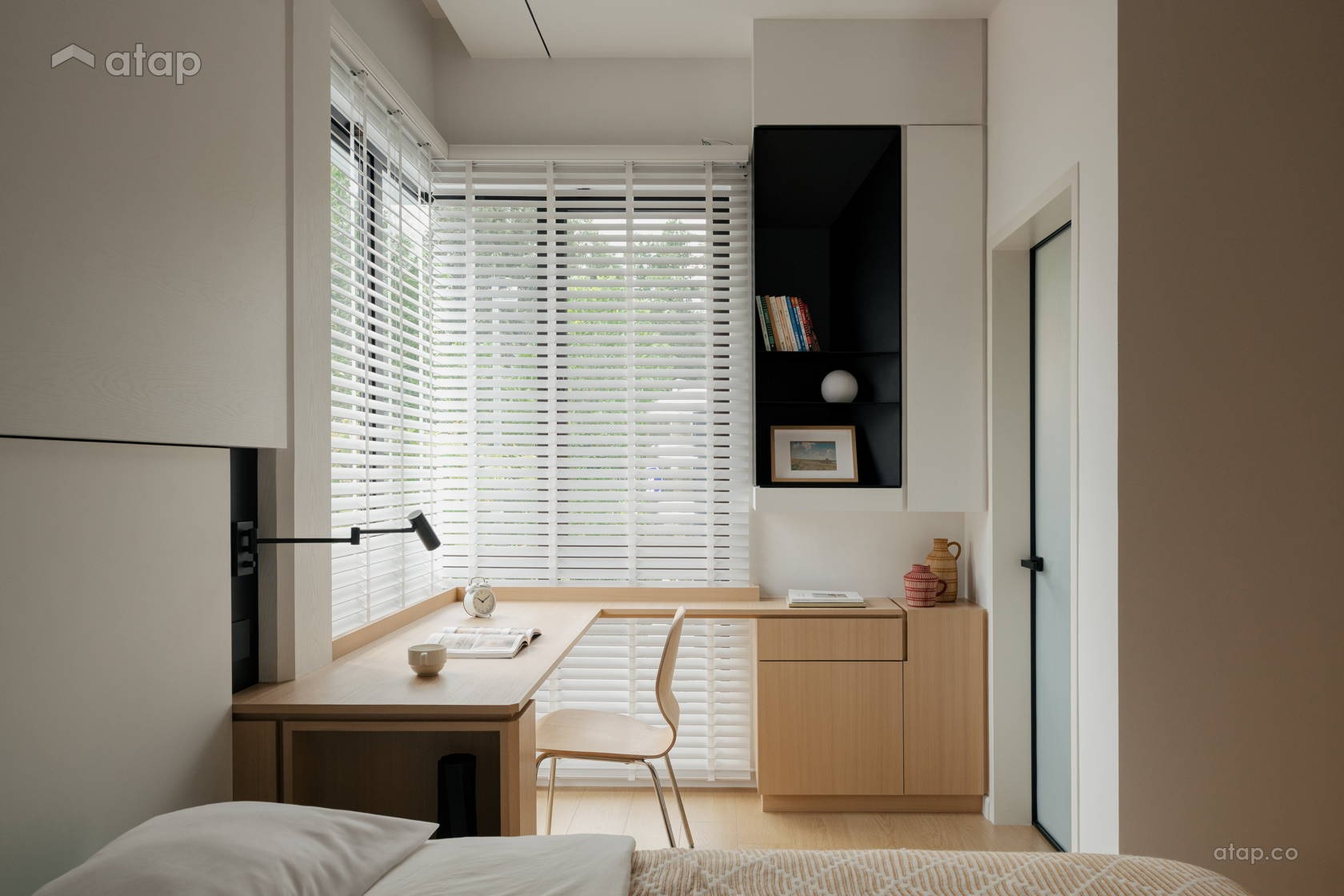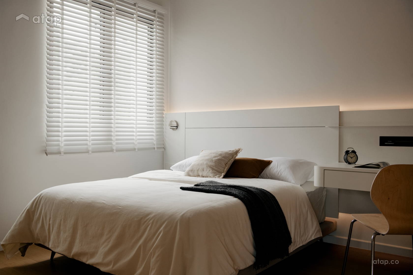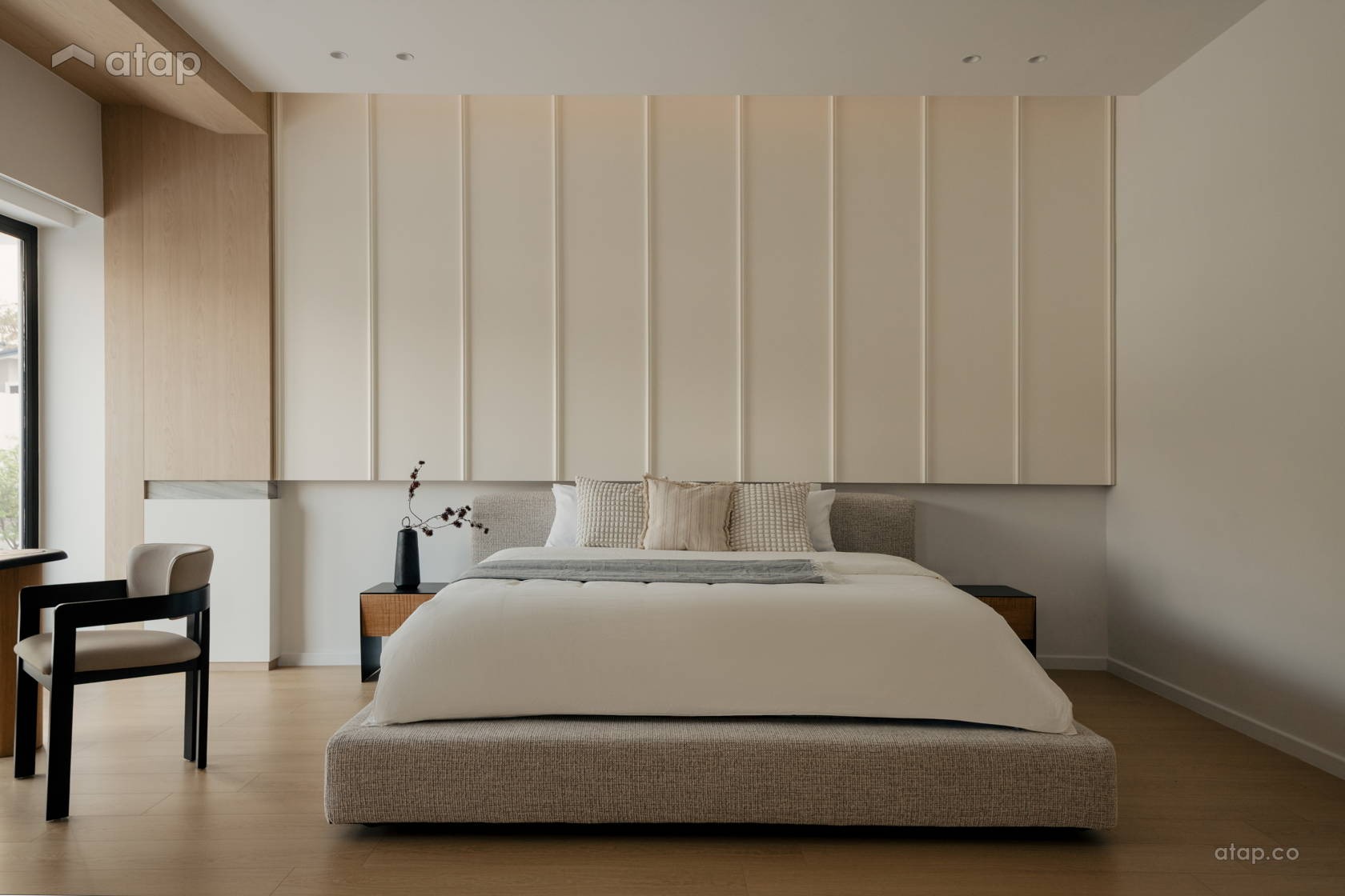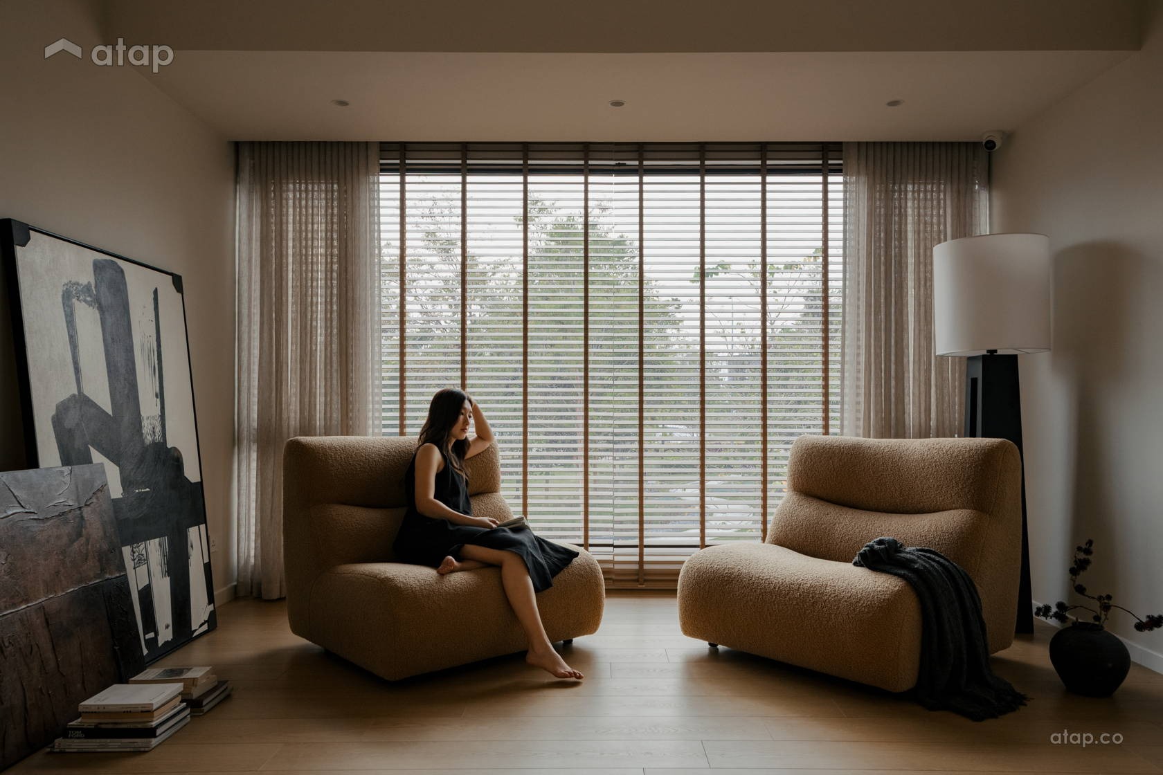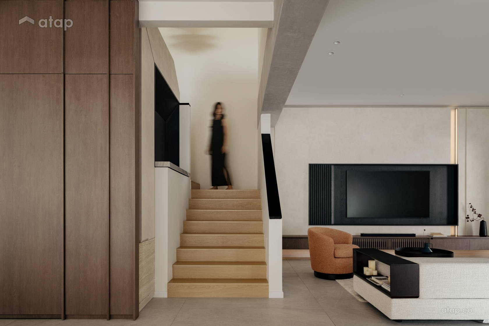 Sự sắc sảo của không gian được cân bằng một cách hoàn hảo nhờ chi tiết hệ dầm thô mộc lộ ra ngoài: