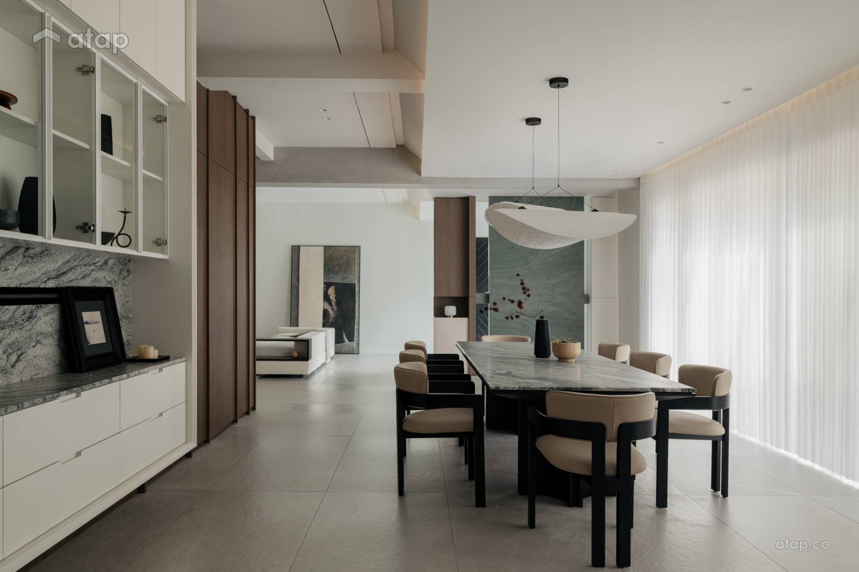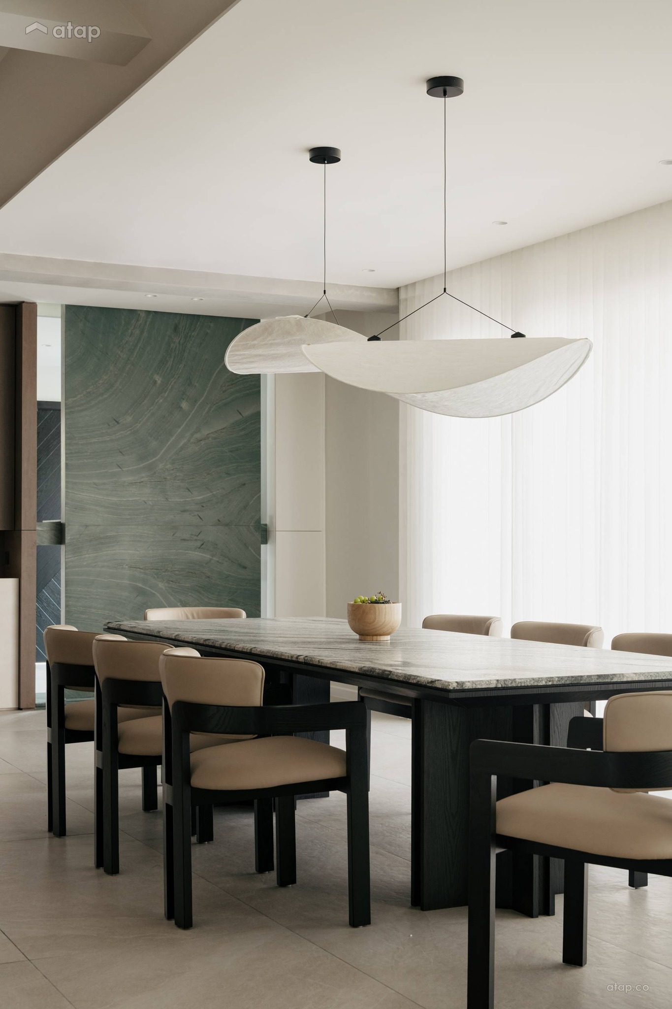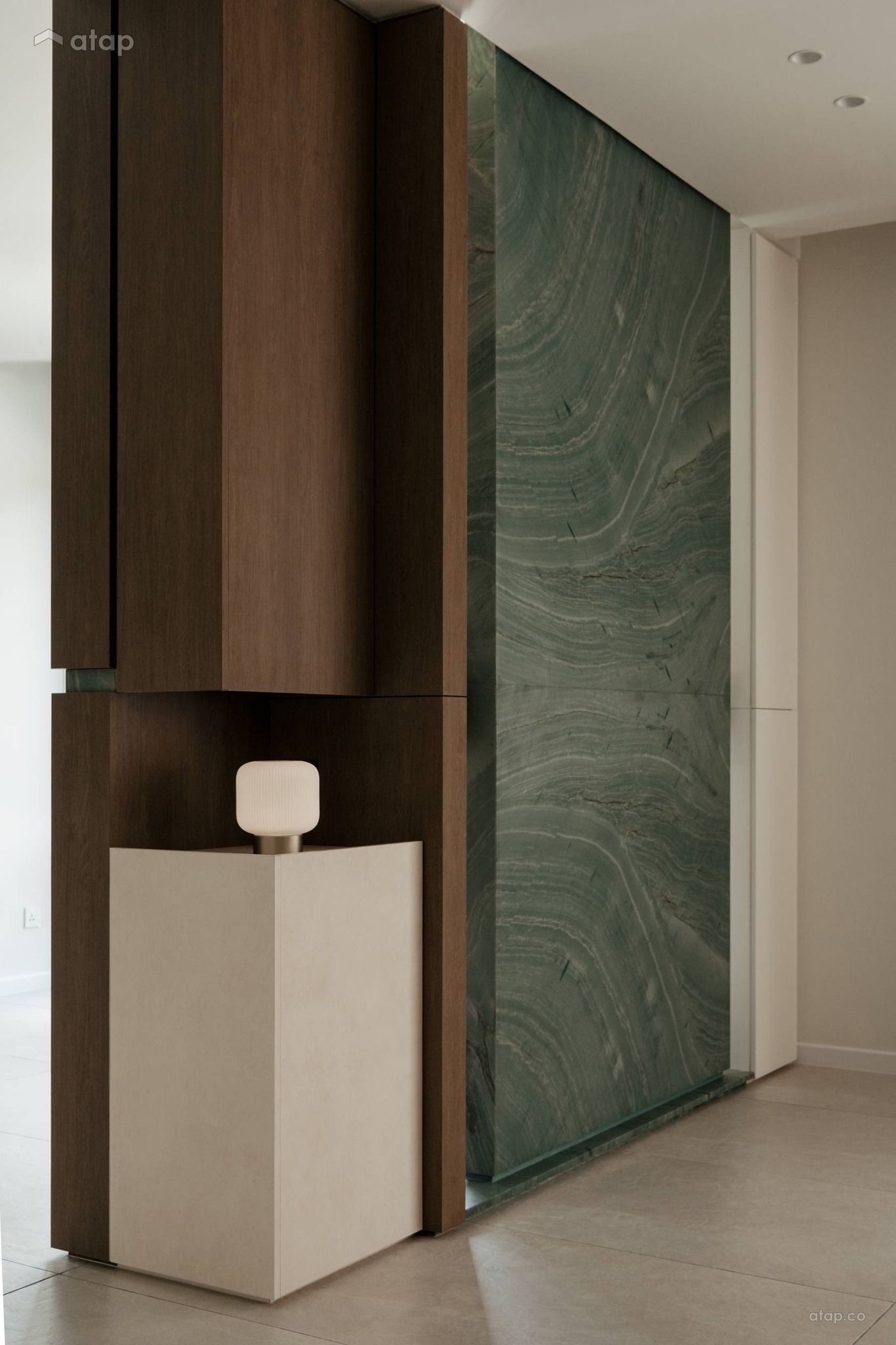 Điểm neo giữ toàn bộ không gian chính là bức tường đá cẩm thạch màu xanh ngọc lục bảo tuyệt đẹp. Bề mặt đá biến ảo linh hoạt dưới từng góc độ của ánh sáng, kết hợp cùng tông màu gỗ trầm ấm tạo nên một nền tảng vô cùng vững chãi và sang trọng. Tôi tin rằng, khi bước vào không gian này, bạn sẽ lập tức cảm nhận được một bầu không khí thư thái và sâu lắng.