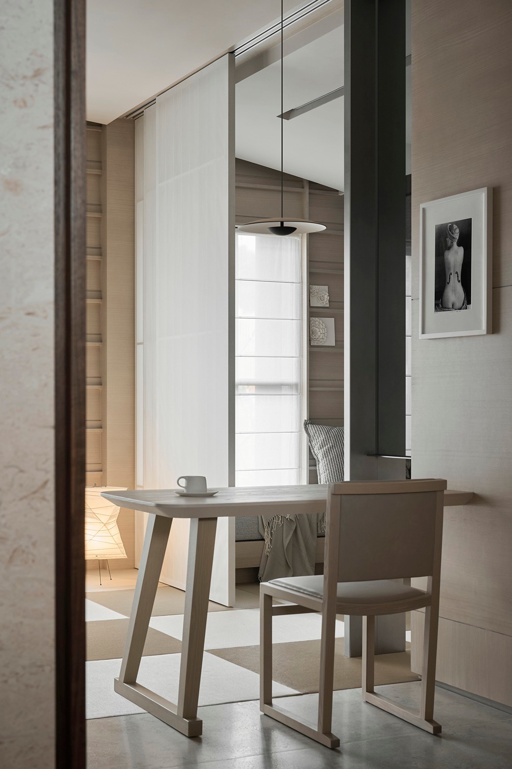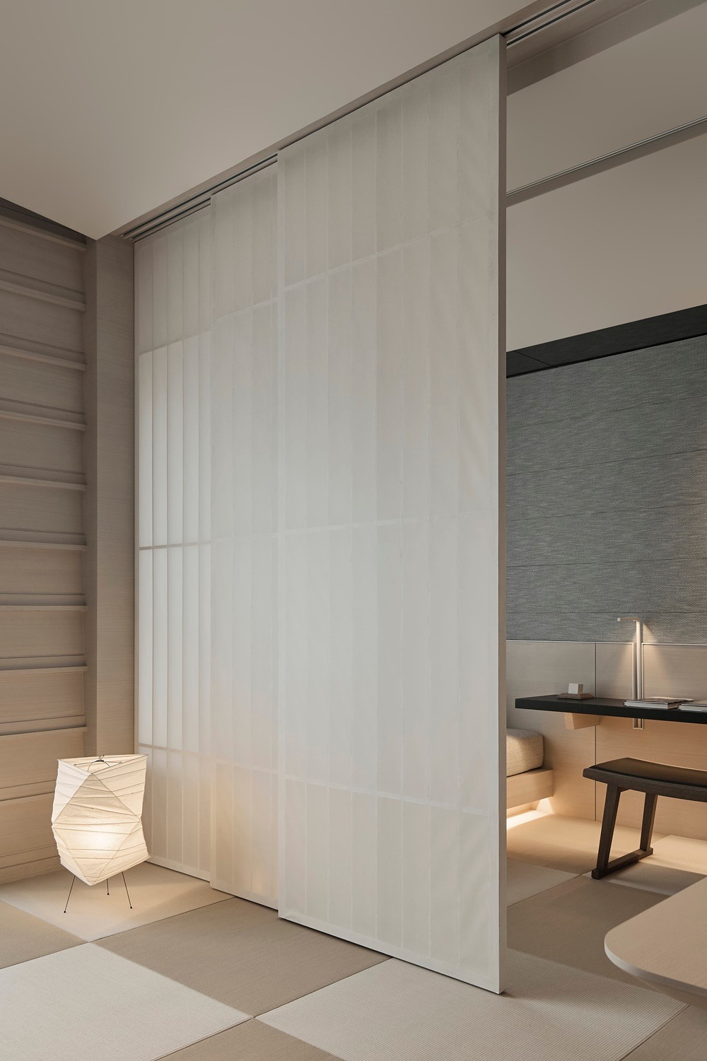 Điểm nhấn mang tính đột phá trong giải pháp mặt bằng là việc sử dụng hệ cửa trượt bằng giấy (Shoji). Thay vì những bức tường gạch ngăn cách biệt lập, cửa Shoji đóng vai trò là một lớp vỏ kiến trúc linh hoạt: