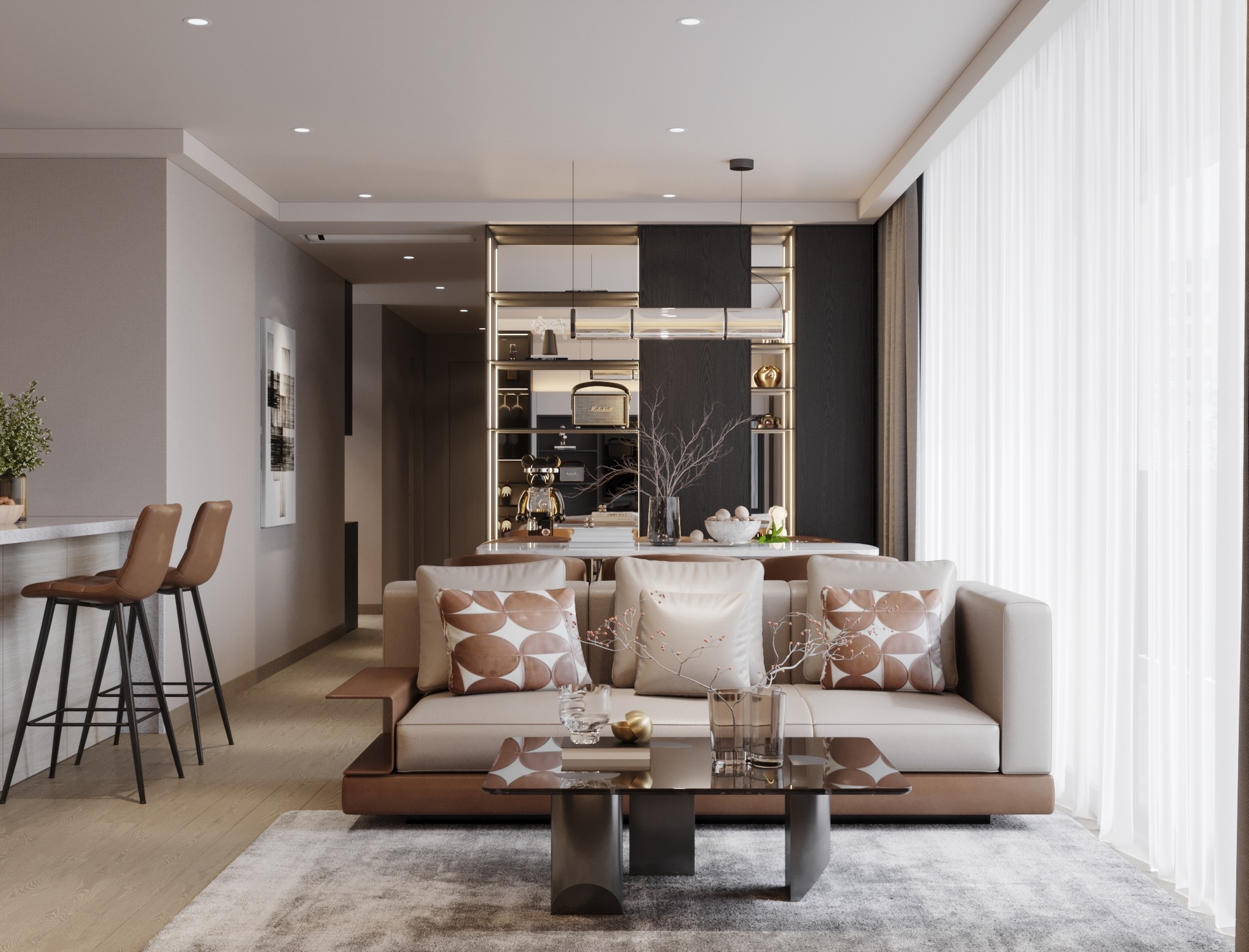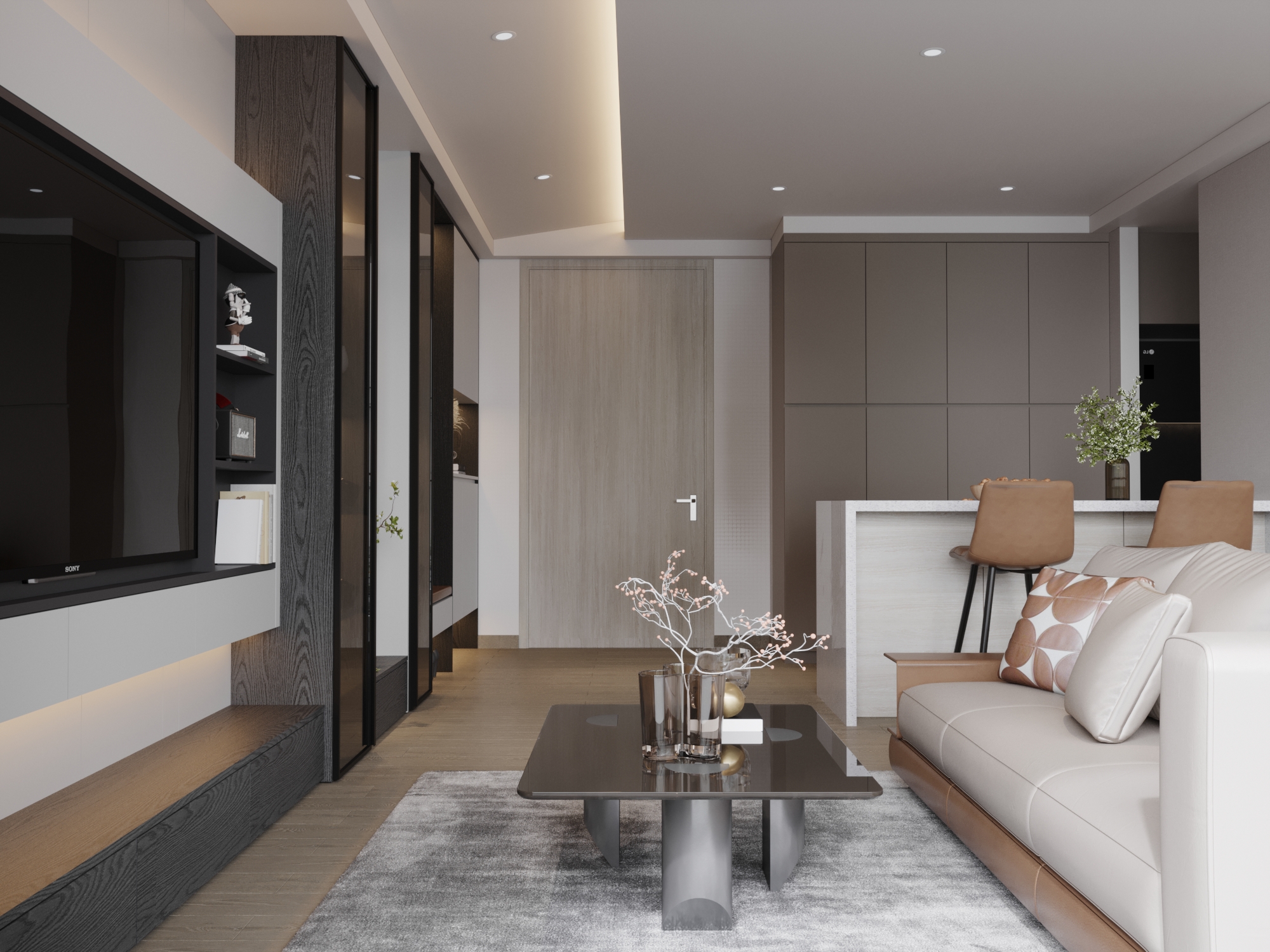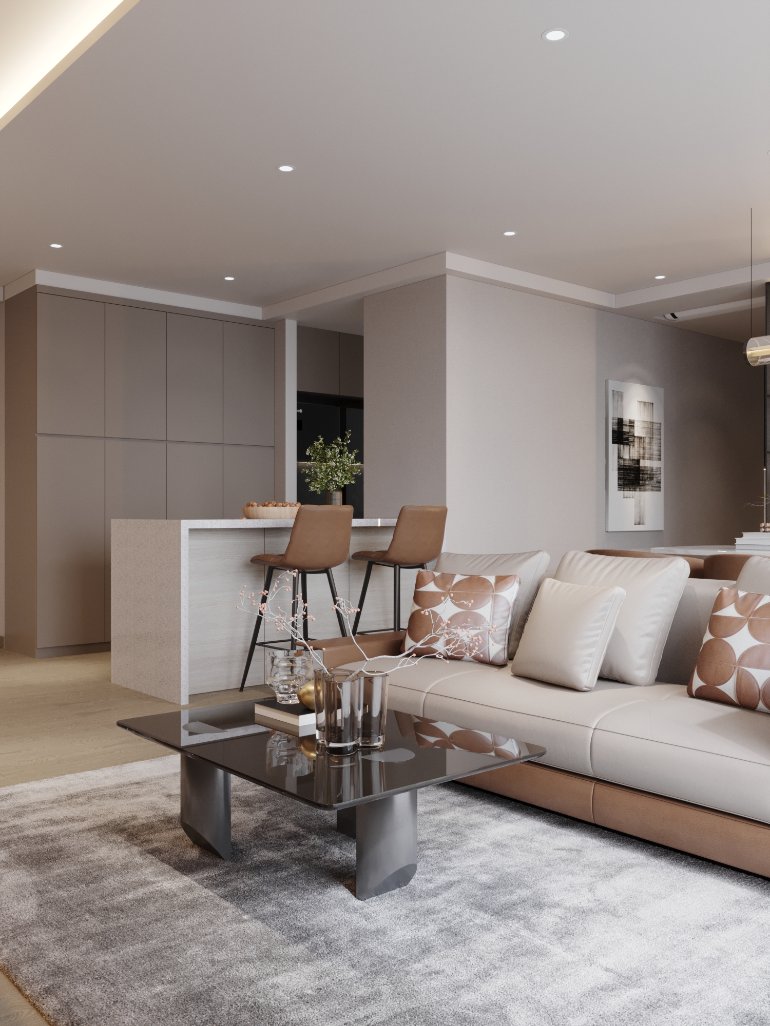 Căn hộ là một hình mẫu xuất sắc của phong cách Hiện đại (Modern) kết hợp cùng sự xa hoa của Modern Luxury. Sự sang trọng không đến từ các chi tiết rườm rà mà được khẳng định qua bảng màu trung tính đẳng cấp (xám, be, trắng) và cách điều phối các mảng nhấn màu nâu da bò, đen tối màu đầy quyền lực. Toàn bộ không gian là một dòng chảy kiến trúc mạch lạc, nơi tính nghệ thuật và công năng ứng dụng được đẩy lên mức cao nhất.