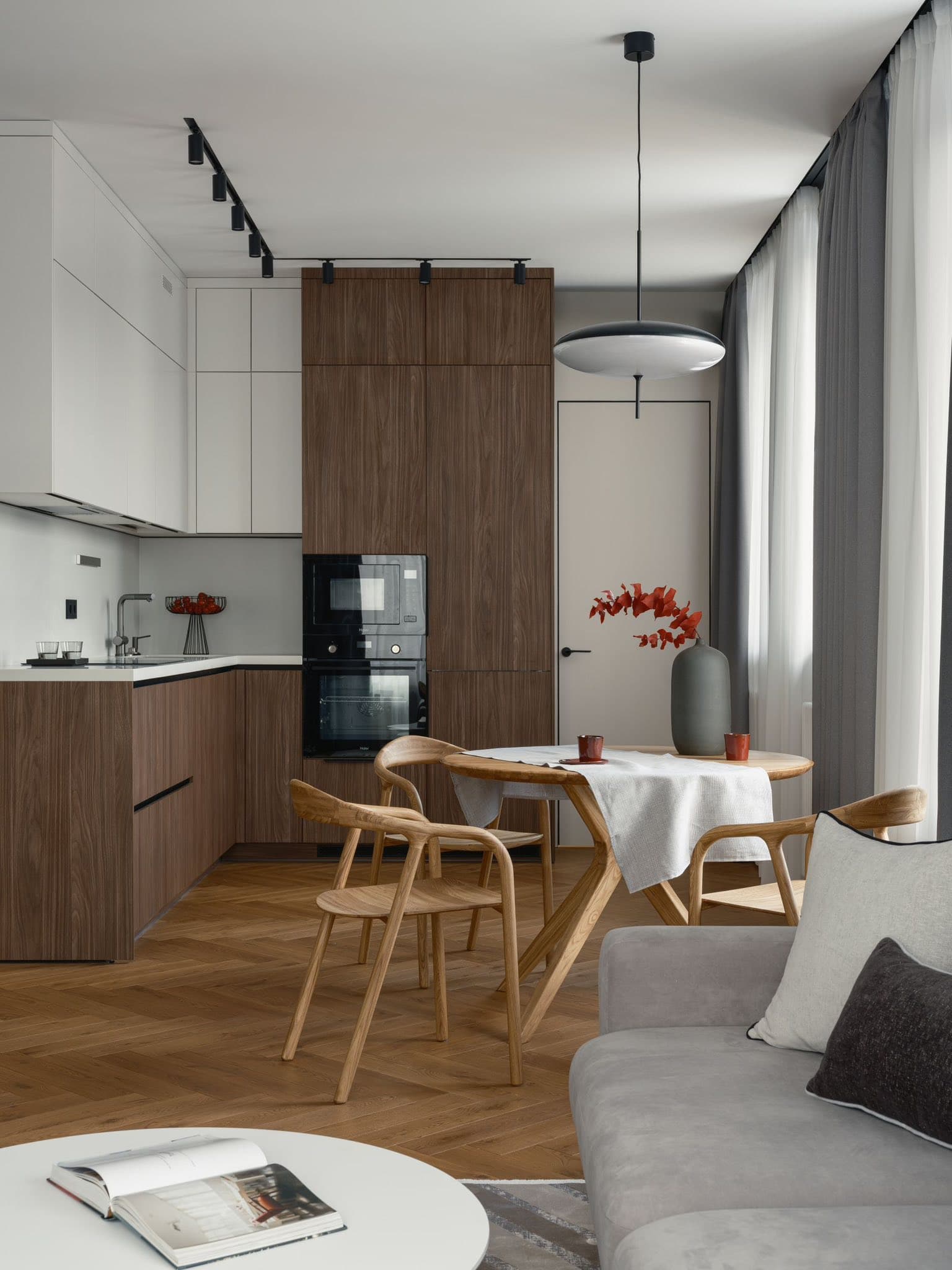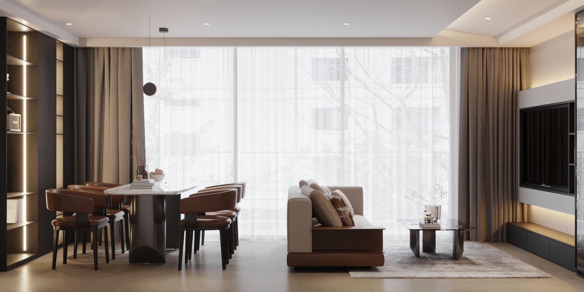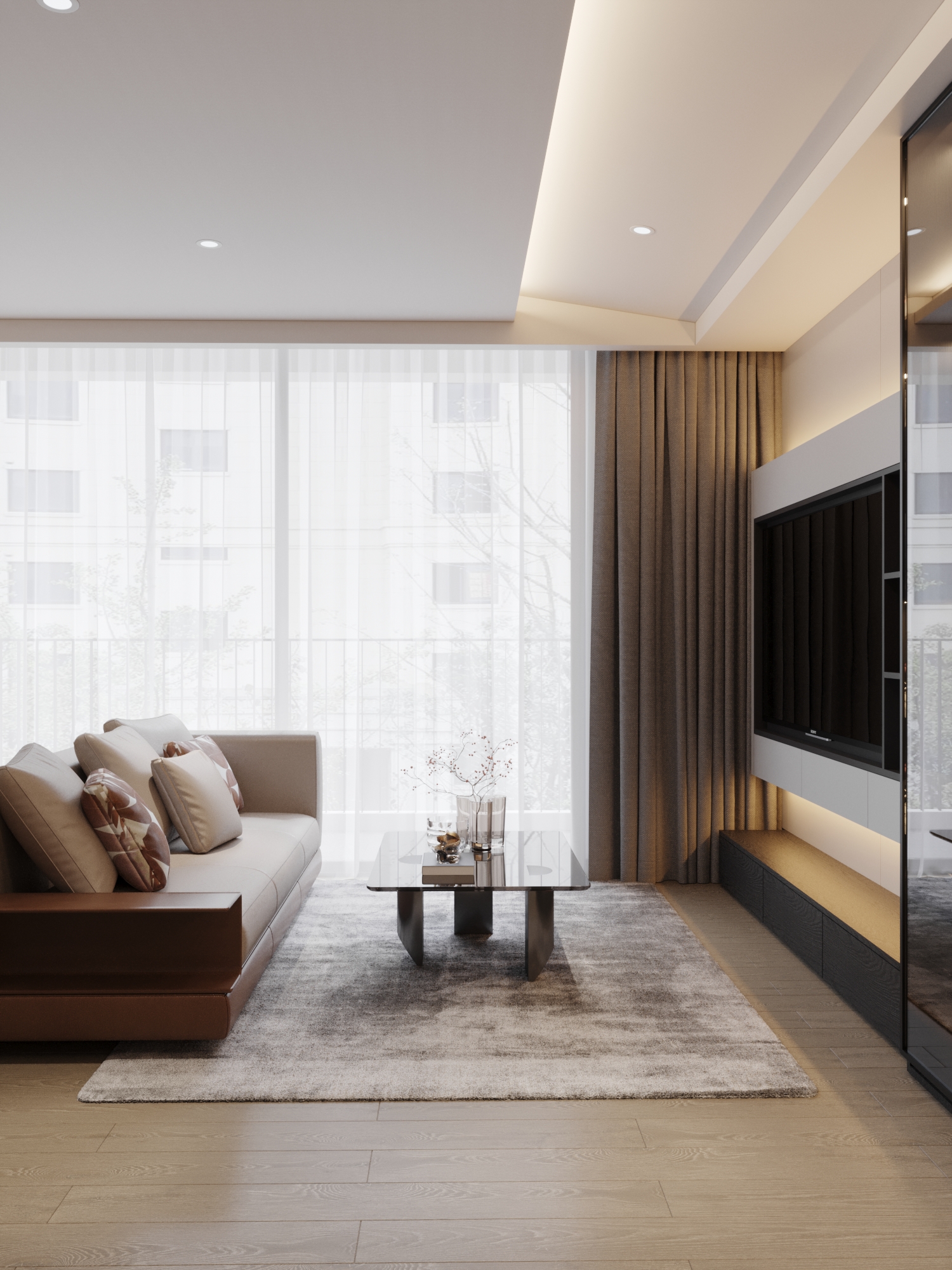 Căn hộ là một hình mẫu xuất sắc của phong cách Hiện đại (Modern) kết hợp cùng sự xa hoa của Modern Luxury. Sự sang trọng không đến từ các chi tiết rườm rà mà được khẳng định qua bảng màu trung tính đẳng cấp (xám, be, trắng) và cách điều phối các mảng nhấn màu nâu da bò, đen tối màu đầy quyền lực. Toàn bộ không gian là một dòng chảy kiến trúc mạch lạc, nơi tính nghệ thuật và công năng ứng dụng được đẩy lên mức cao nhất.