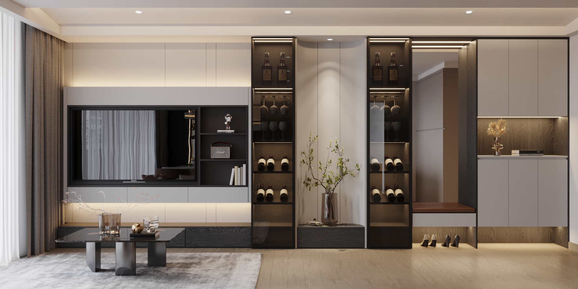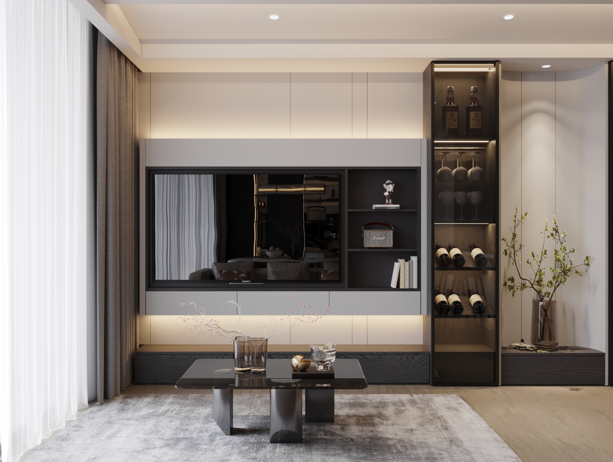 Hệ vách TV và Tủ rượu: Sự kết hợp giữa các mảng tường phẳng màu sáng và hệ tủ rượu kính cường lực tối màu tạo nên sự tương phản mạnh mẽ. Đèn LED hắt sáng viền không chỉ tôn vinh bộ sưu tập rượu mà còn tạo ra chiều sâu thị giác, biến hệ tủ thành một tác phẩm sắp đặt ánh sáng.