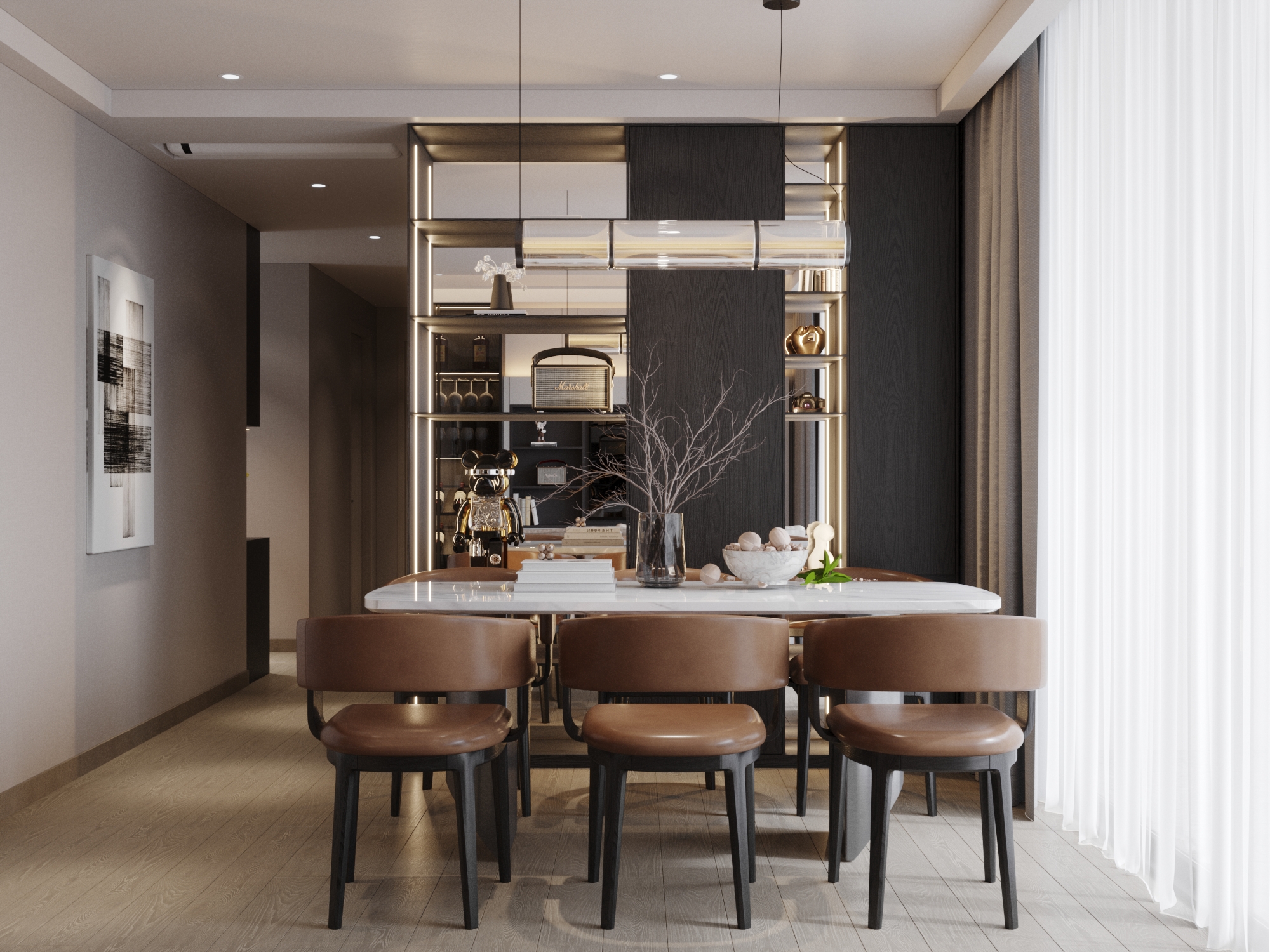 Góc Decor nghệ thuật: Hệ tủ trang trí kịch trần bằng gỗ tối màu phía sau bàn ăn là nơi trưng bày các món đồ chơi nghệ thuật (Bearbrick) và bình hoa, được tôn vinh bởi hệ thống đèn LED chuyên dụng.