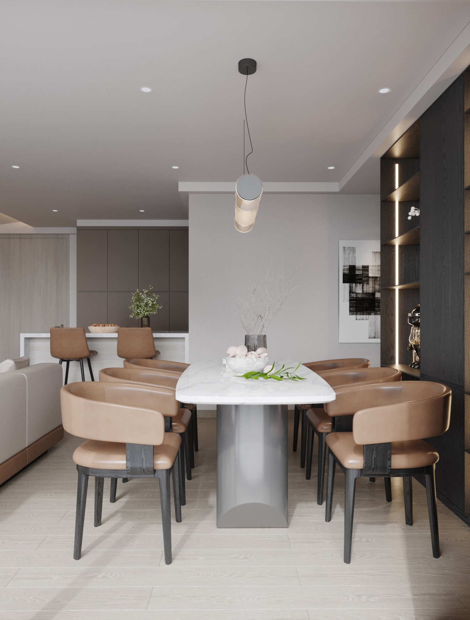 Bàn ăn điêu khắc: Bàn ăn mặt đá cẩm thạch trắng bo góc mềm mại, kết hợp cùng ghế ăn bọc da màu nâu đồng điệu với sofa phòng khách, tạo sự thống nhất trong ngôn ngữ thiết kế. Chiếc đèn thả hình trụ đương đại phía trên đóng vai trò là điểm nhấn kết thúc cho phân khu này.