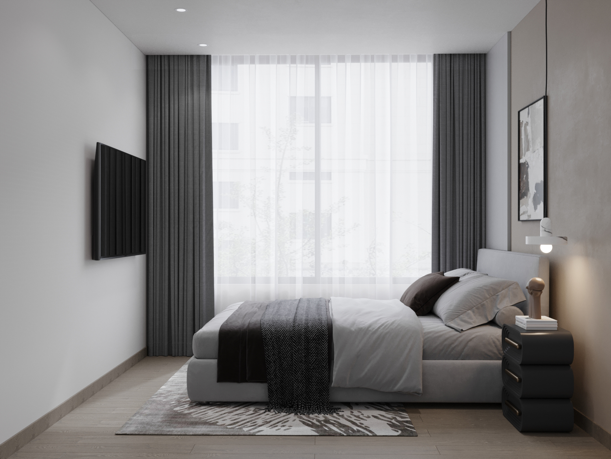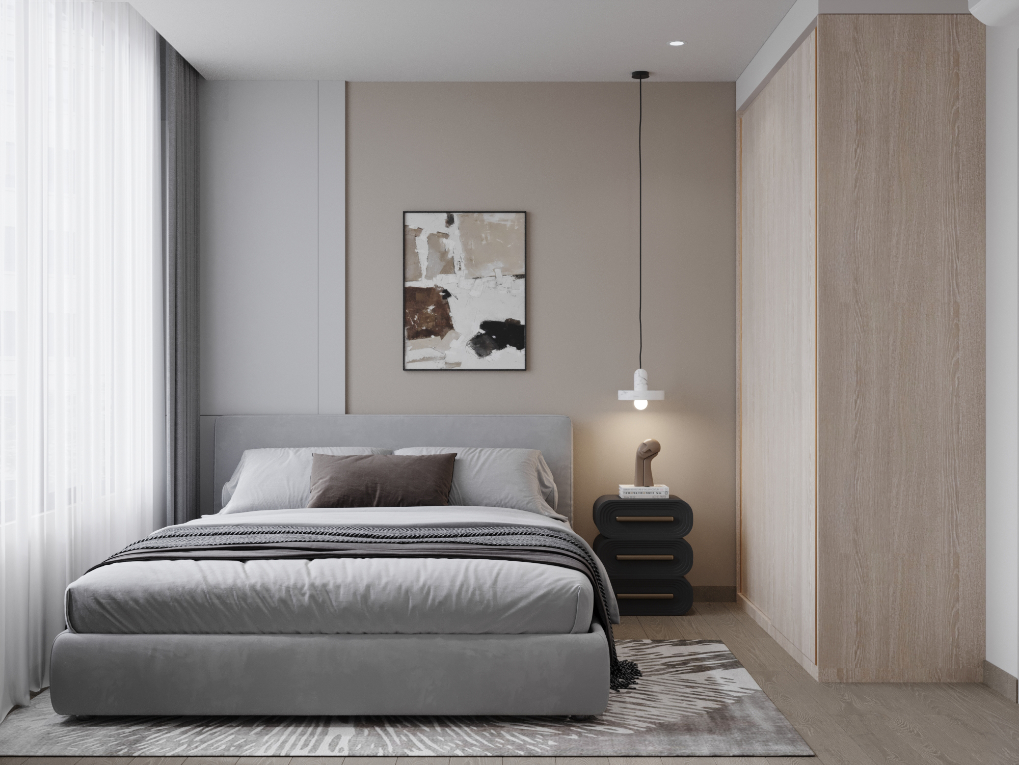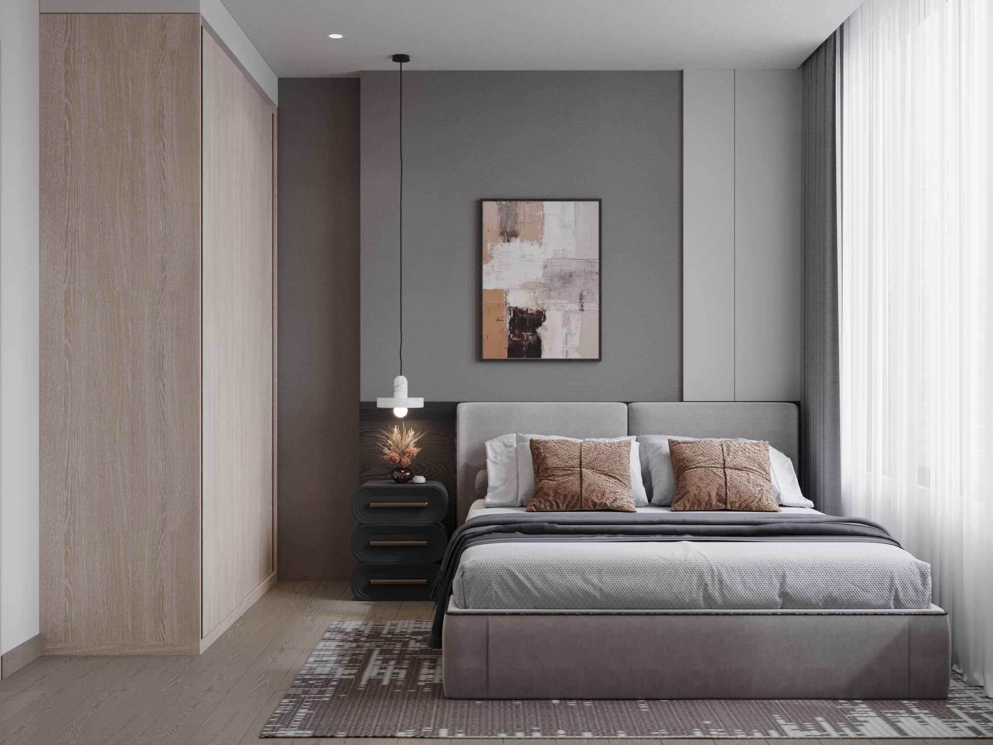 Giường ngủ nguyên khối: Chiếc giường bọc nỉ xám bồng bềnh là tâm điểm của căn phòng, mang lại cảm giác an tâm và dễ chịu.