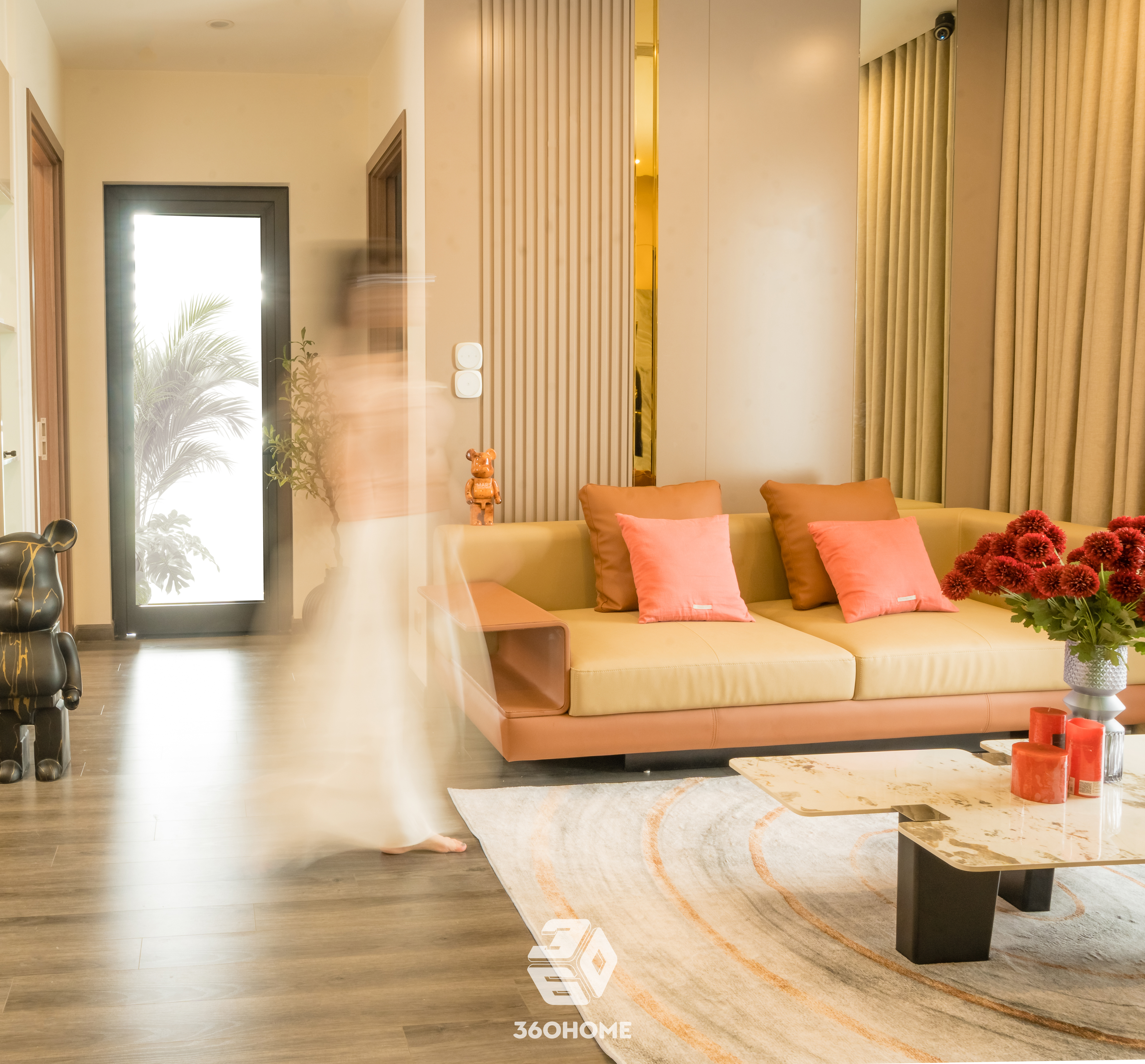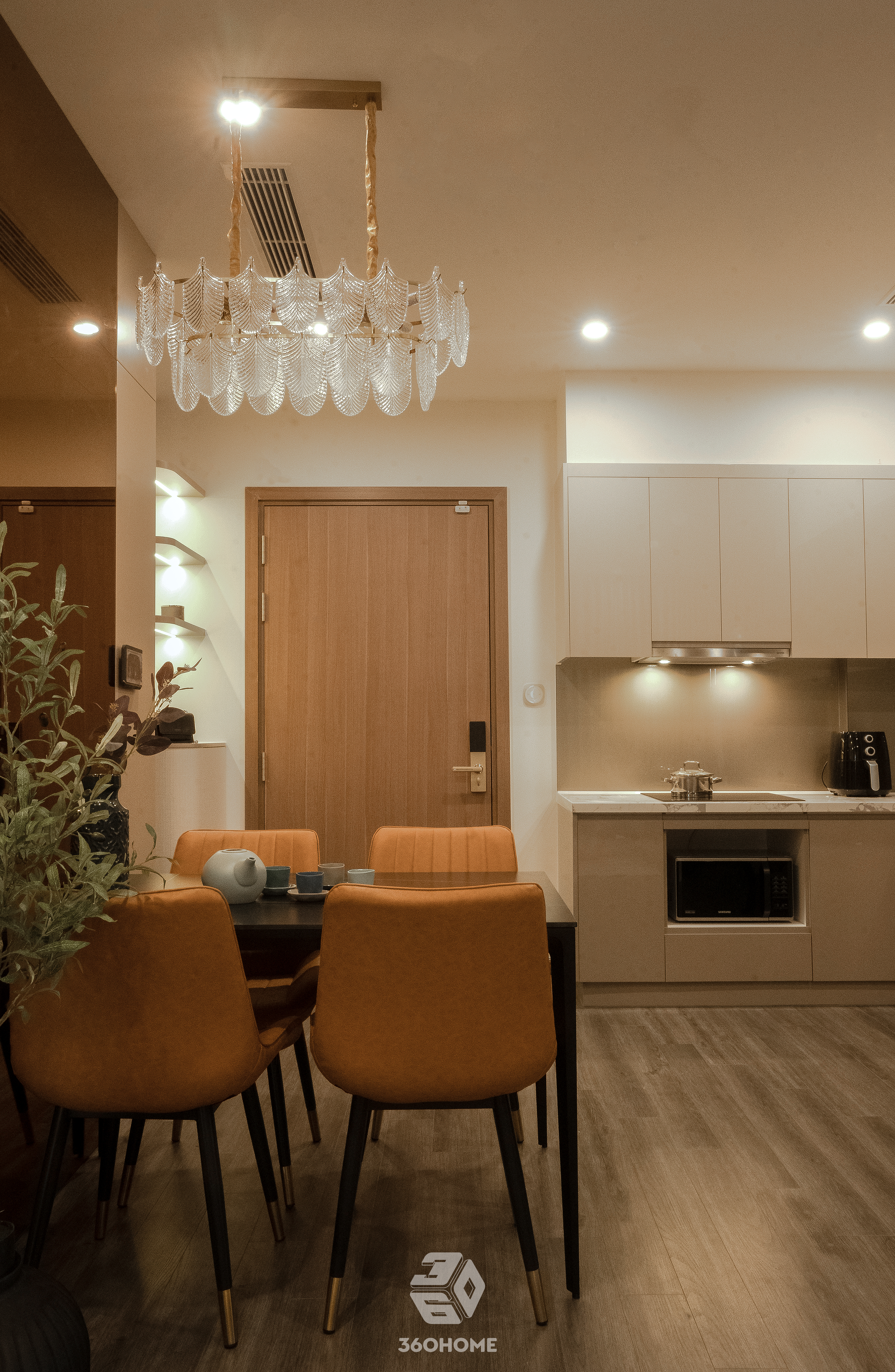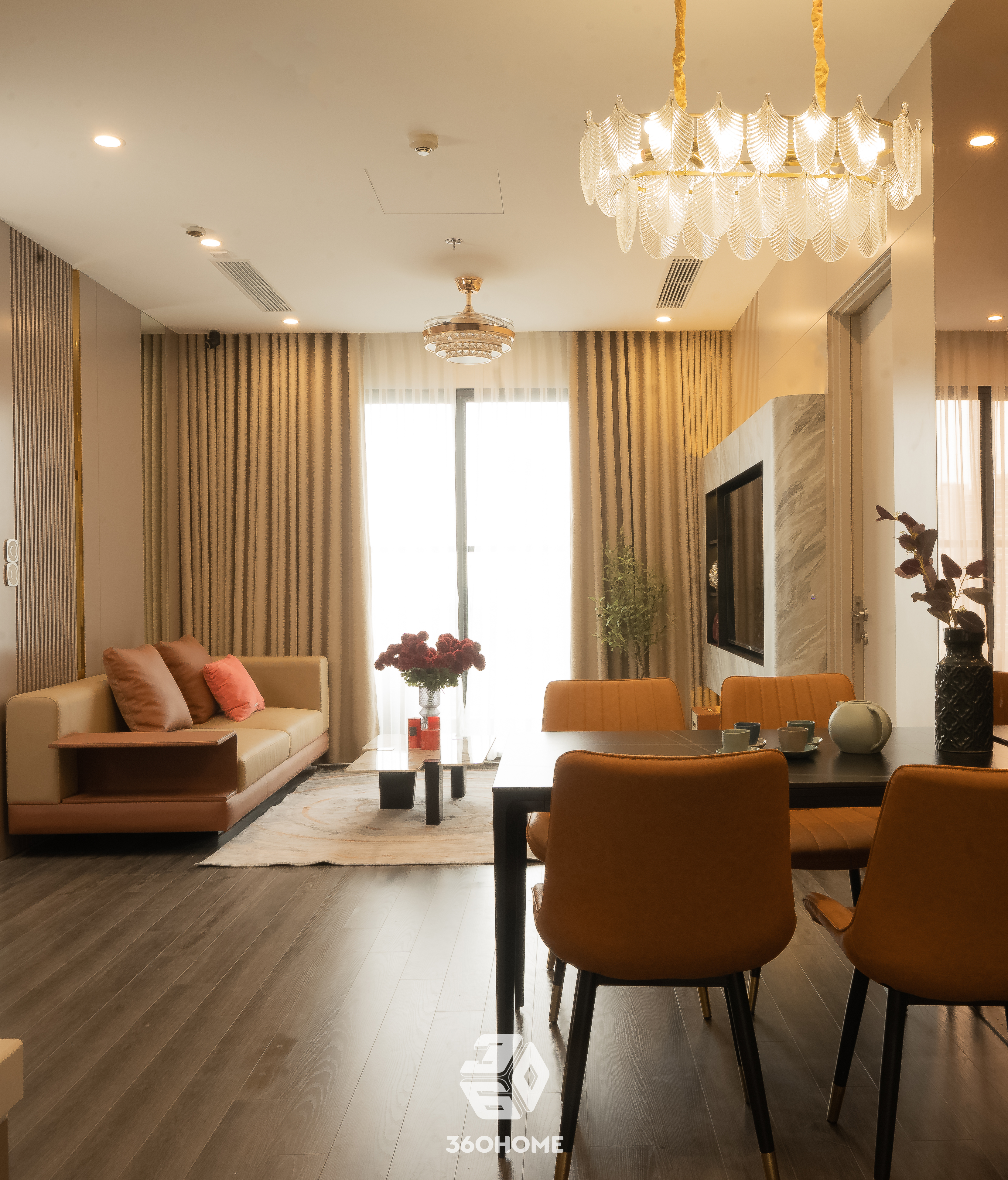 Bước vào không gian này, thị giác ngay lập tức được xoa dịu bởi vẻ đẹp thời thượng của phong cách Modern Luxury, nơi sự xa hoa không hề xa cách mà lại vô cùng gần gũi. Bảng màu trung tính với be, kem và nâu gỗ sáng làm nền tảng hoàn hảo để tôn vinh những điểm nhấn màu cam đất (terracotta) nồng nàn, kiến tạo nên một tổng thể vừa đẳng cấp, vừa ấm áp.