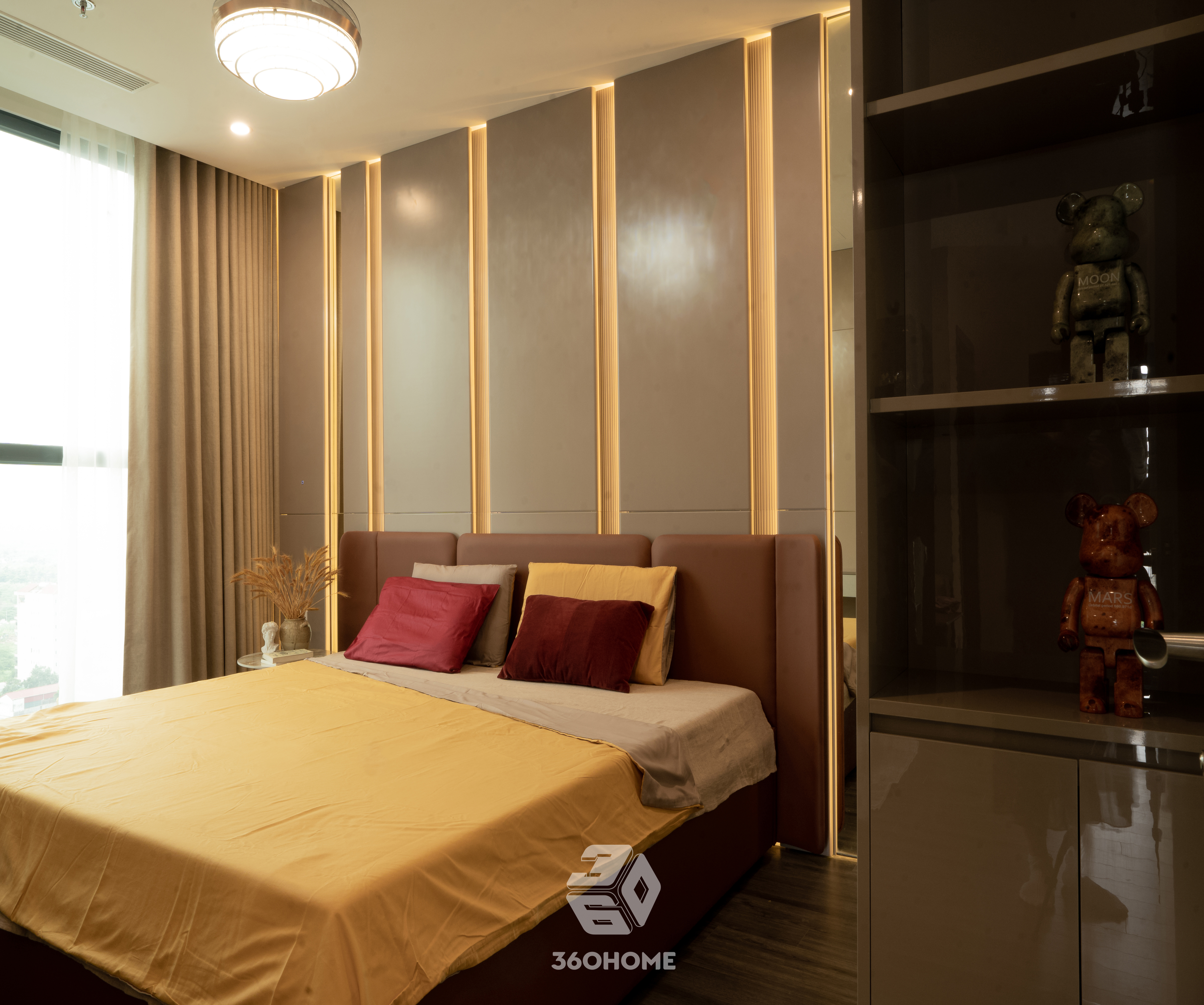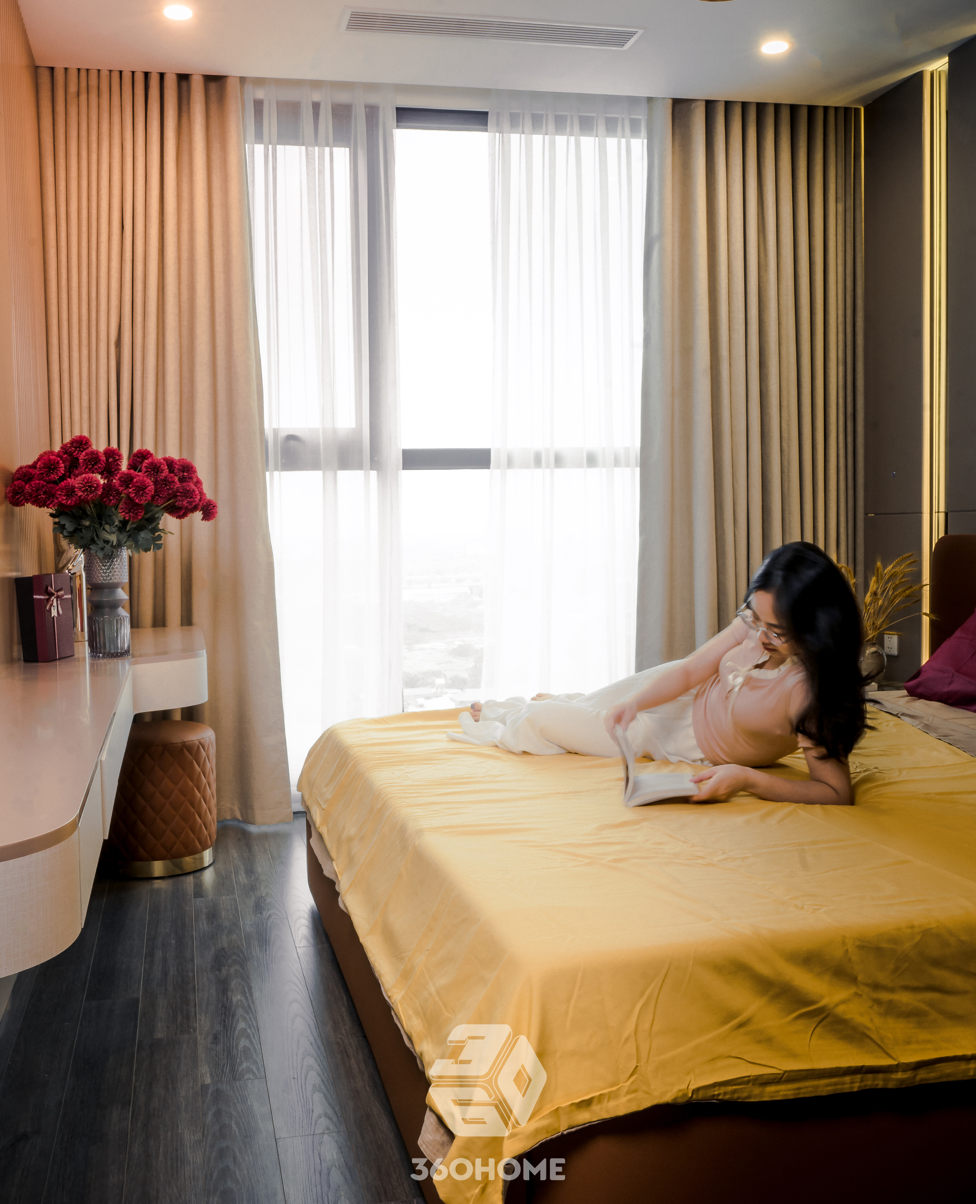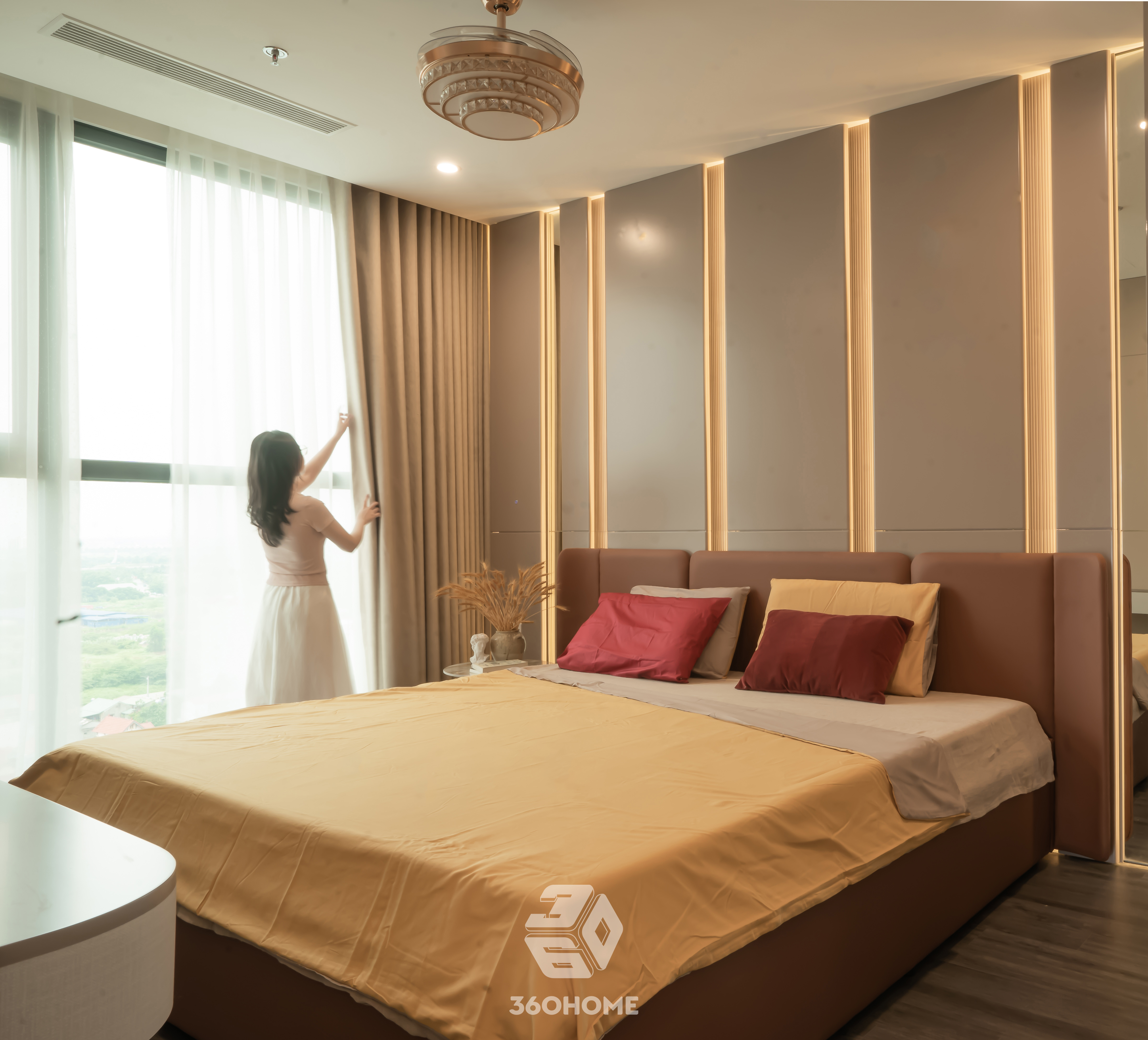 Bước vào không gian này, thị giác ngay lập tức được xoa dịu bởi vẻ đẹp thời thượng của phong cách Modern Luxury, nơi sự xa hoa không hề xa cách mà lại vô cùng gần gũi. Bảng màu trung tính với be, kem và nâu gỗ sáng làm nền tảng hoàn hảo để tôn vinh những điểm nhấn màu cam đất (terracotta) nồng nàn, kiến tạo nên một tổng thể vừa đẳng cấp, vừa ấm áp.