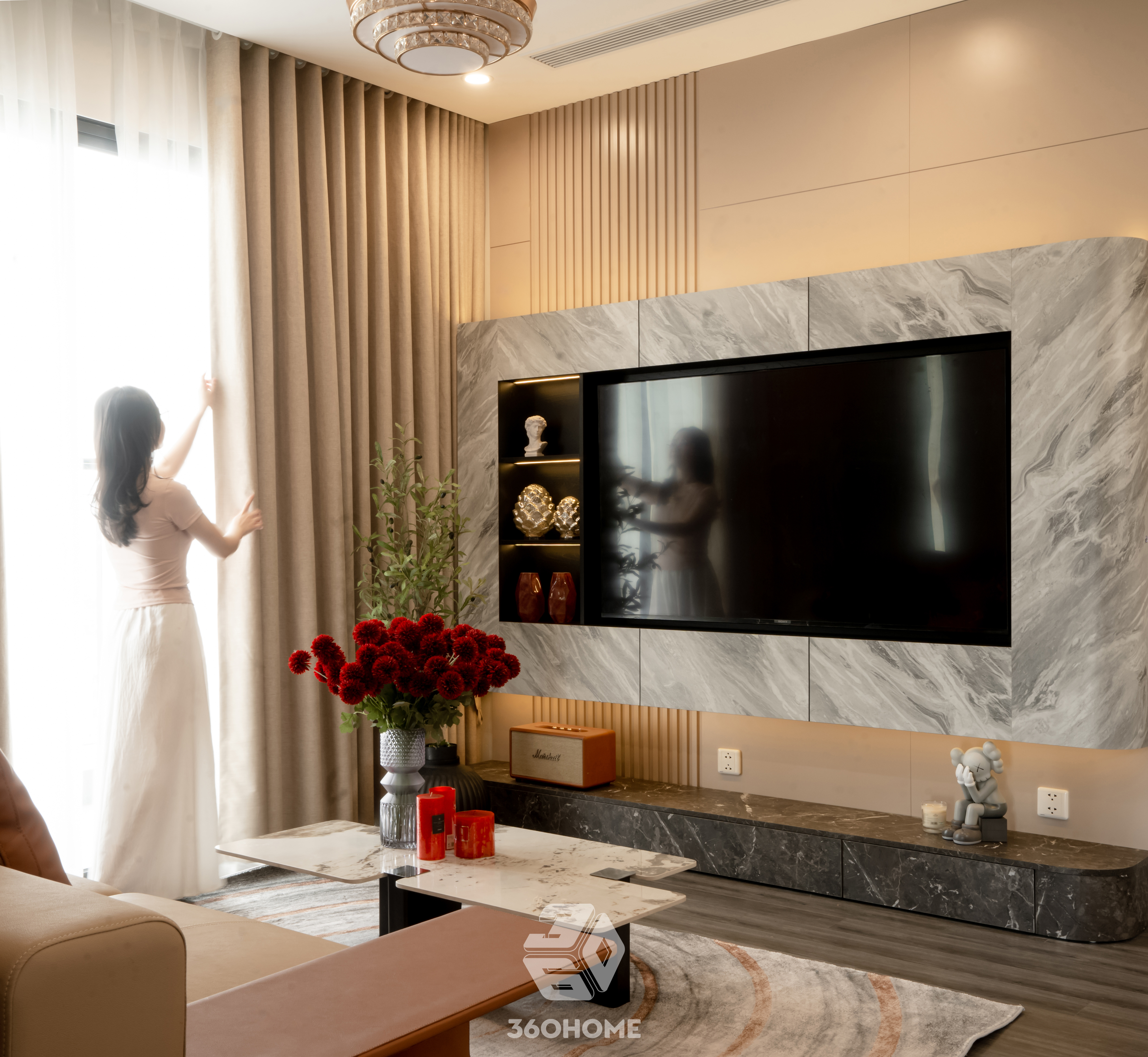 Tại phòng khách, tâm điểm thu hút mọi ánh nhìn chính là bộ sofa da phối màu kem – cam nâu đầy cuốn hút, được đặt nổi bật trên thảm trải sàn họa tiết trừu tượng và bàn trà mặt đá vân mây tinh tế. Bức tường sau TV không đơn thuần là một vách ngăn, mà là một màn trình diễn vật liệu ấn tượng: sự vững chãi của đá khổ lớn, nét mộc mạc của nan gỗ và vẻ kiêu sa của nẹp kim loại mạ vàng. Không gian càng trở nên lung linh hơn nhờ nghệ thuật chiếu sáng đa tầng: ánh sáng tự nhiên dịu nhẹ qua lớp voan trắng hòa quyện cùng ánh vàng ấm áp từ chiếc đèn chùm pha lê dáng lá và hệ thống LED hắt điểm, làm bừng sáng những món decor cá tính như tượng Bearbrick hay bình hoa cúc đỏ.