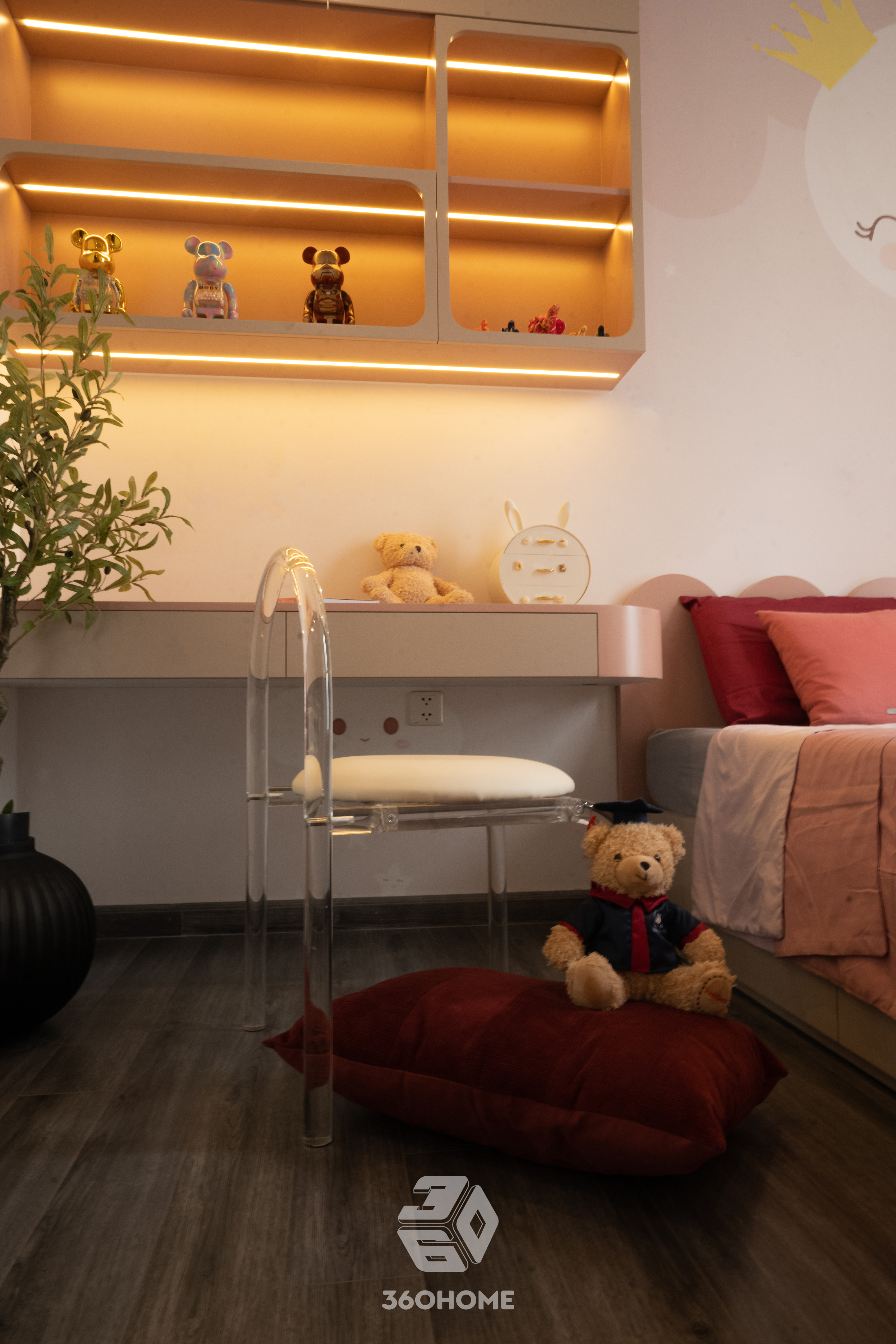 Bước vào chốn nghỉ ngơi của gia chủ, sự thư thái và chiều sâu được ưu tiên hàng đầu. Vách đầu giường ốp nệm da êm ái kết hợp cùng những mảng gương xen kẽ đèn LED dọc giúp mở rộng không gian đầy ngoạn mục, làm nền cho chiếc giường phủ ga màu vàng mù tạt nổi bật. Trái ngược với vẻ trưởng thành ấy, phòng ngủ trẻ em lại mở ra một thế giới cổ tích ngọt ngào với tông hồng pastel. Từ những chi tiết trăng sao trên tường, hệ tủ kệ cong mềm mại đến góc học tập với chiếc ghế trong suốt, tất cả đều được chăm chút tỉ mỉ để nuôi dưỡng tâm hồn và trí tưởng tượng bay bổng cho con trẻ.