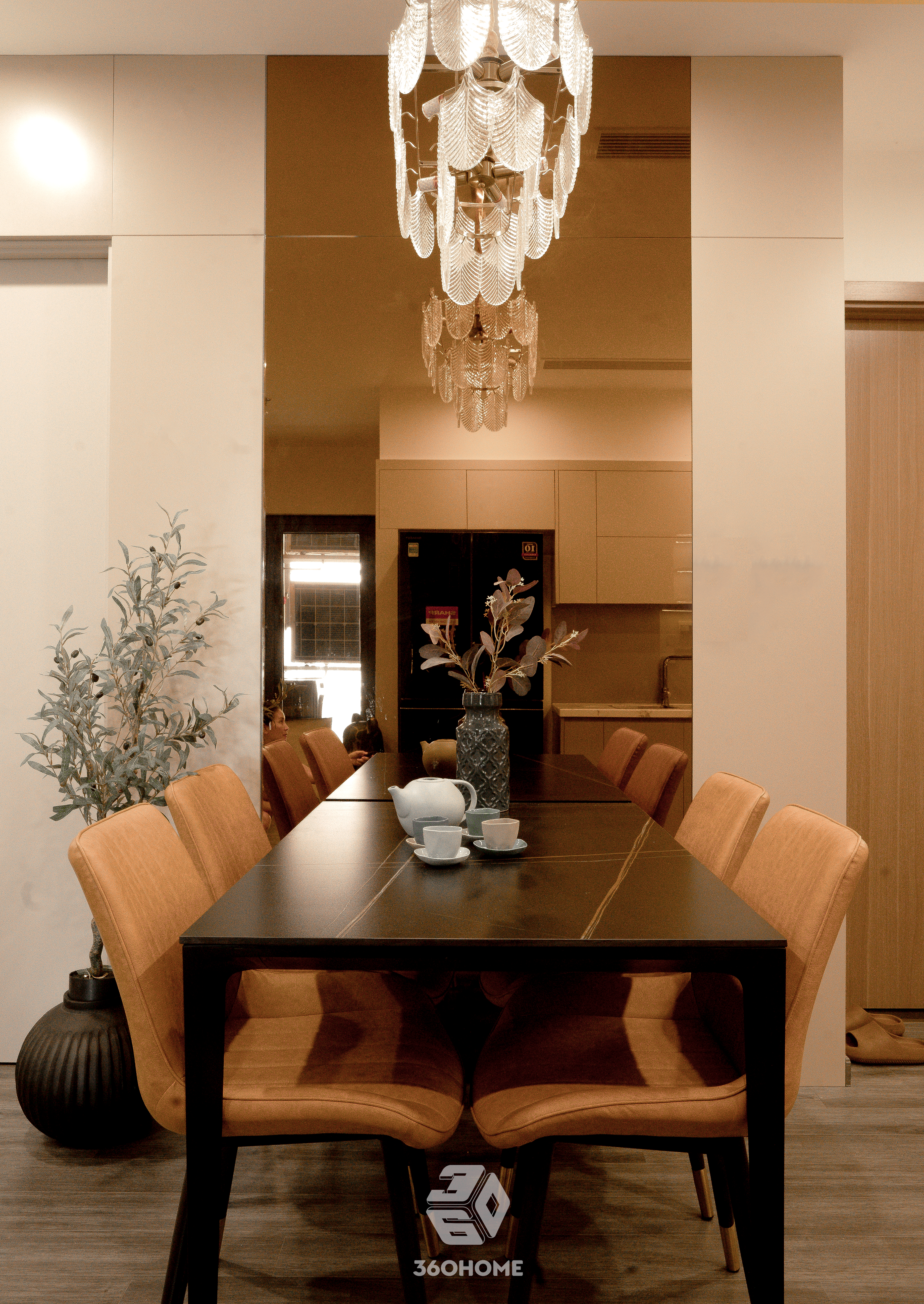 Sự liền mạch trong ngôn ngữ thiết kế dẫn lối mượt mà sang khu vực bếp – ăn. Sự lặp lại của chất liệu da và tông màu chủ đạo trên bộ ghế ăn tạo nên tính đồng bộ thị giác chặt chẽ, nằm gọn gàng bên hệ tủ bếp kịch trần màu be phẳng lì và mảng tường kính phản chiếu lung linh.