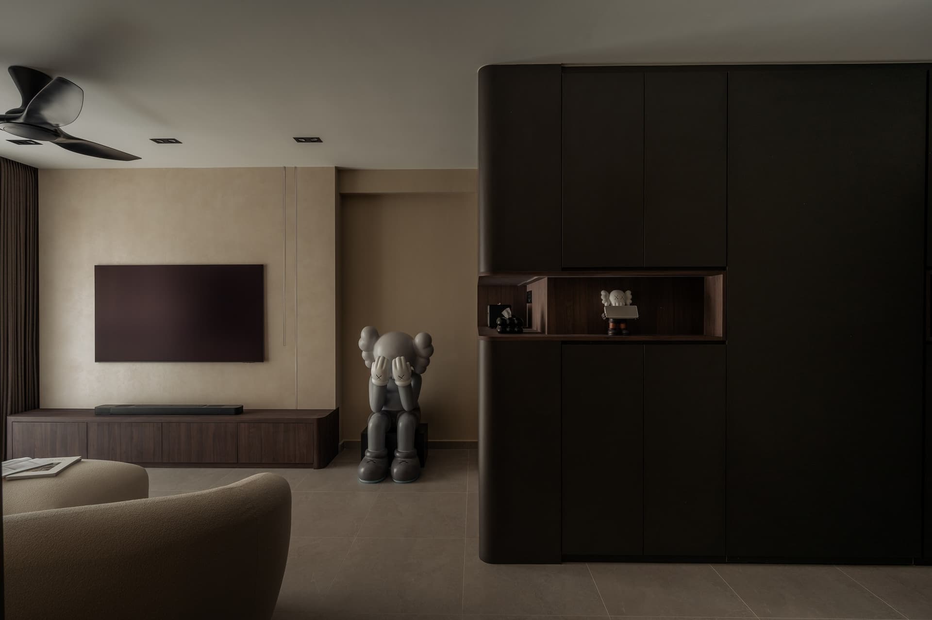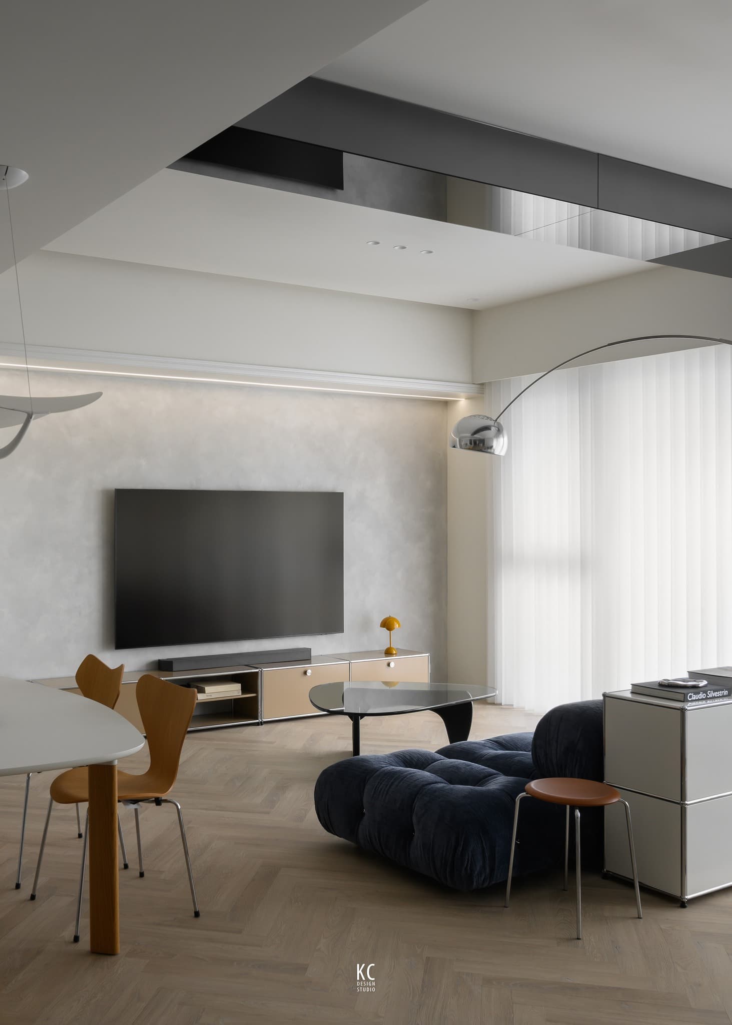 Để duy trì tinh thần tối giản, các khu vực làm việc và thư giãn đều ưu tiên hệ tủ kịch trần phẳng phiu. Toàn bộ thiết bị điện tử và vật dụng cá nhân được che giấu khéo léo, trả lại sự ngăn nắp tuyệt đối và vẻ đẹp thuần khiết cho các diện tường.