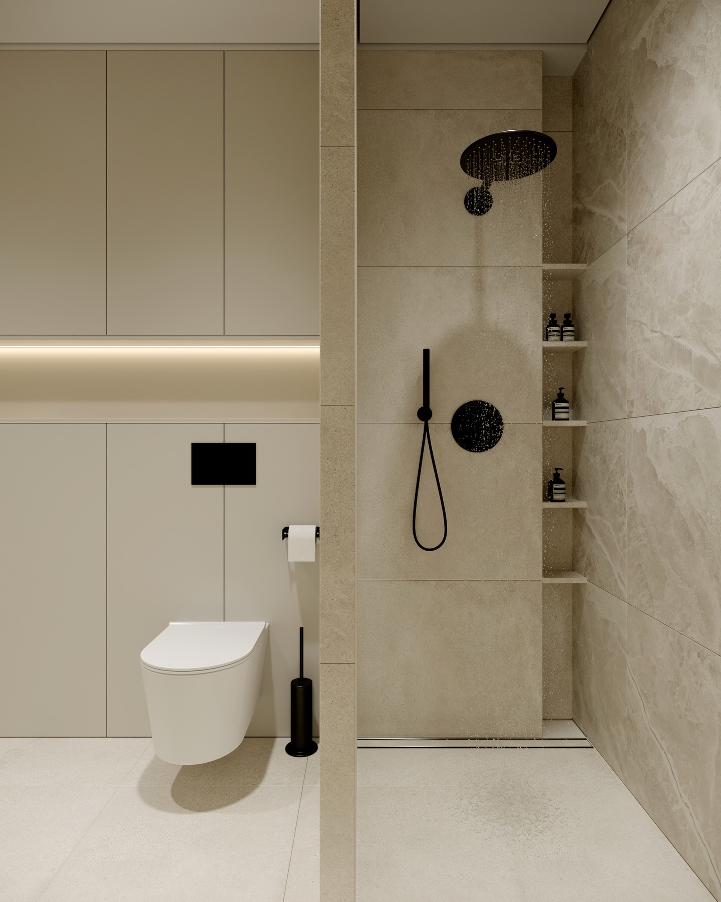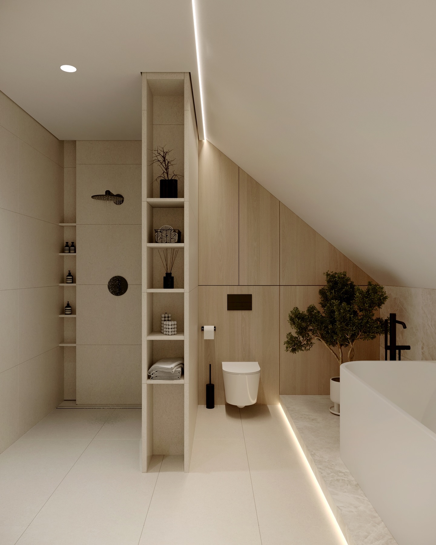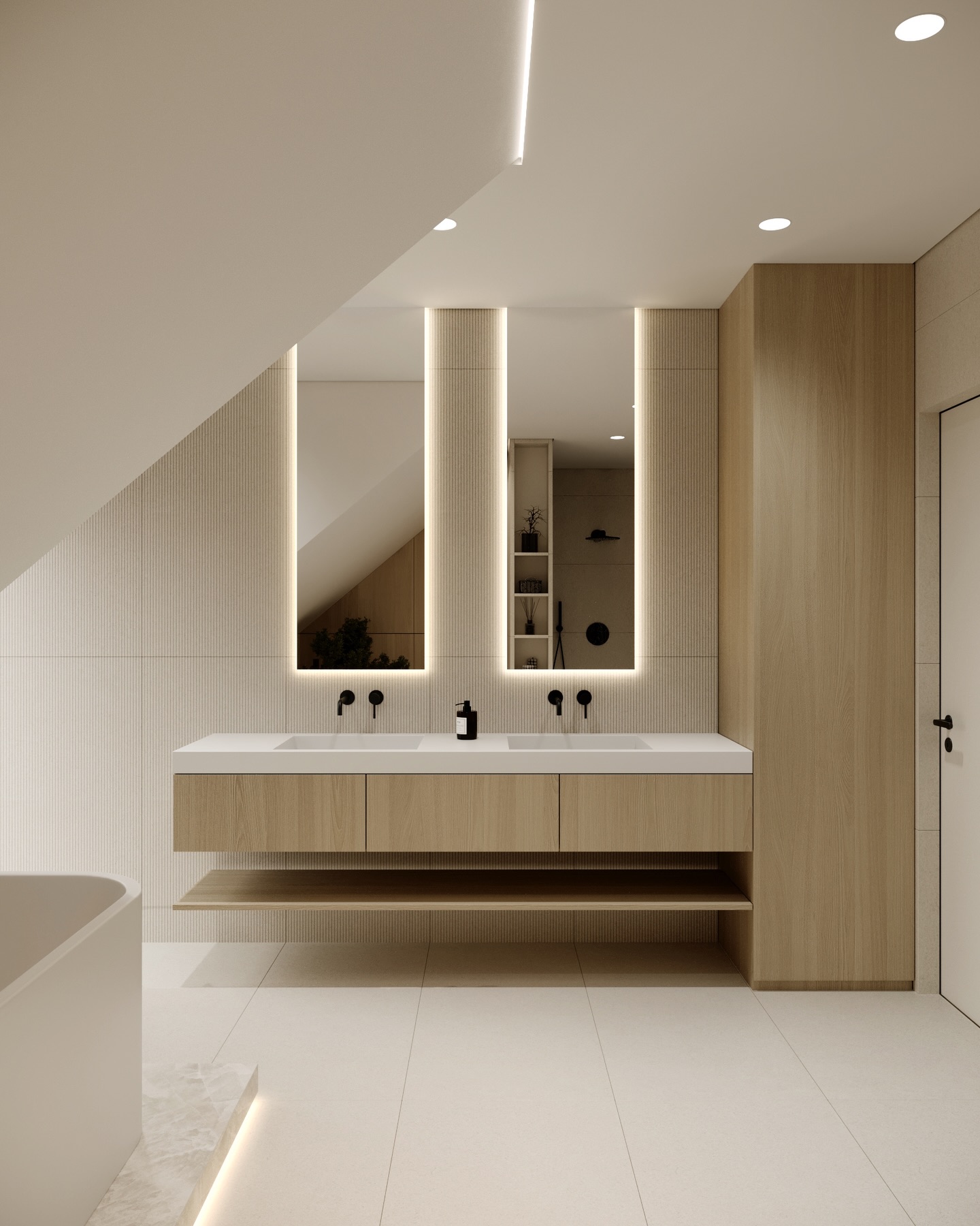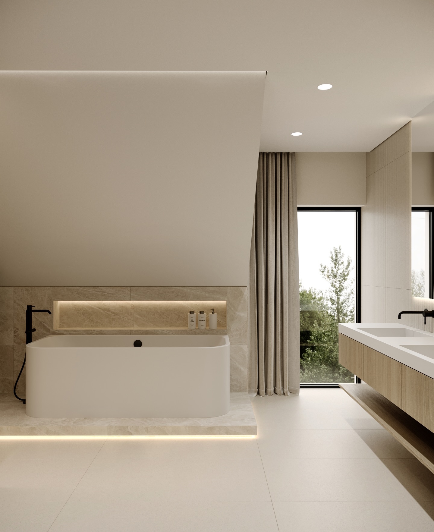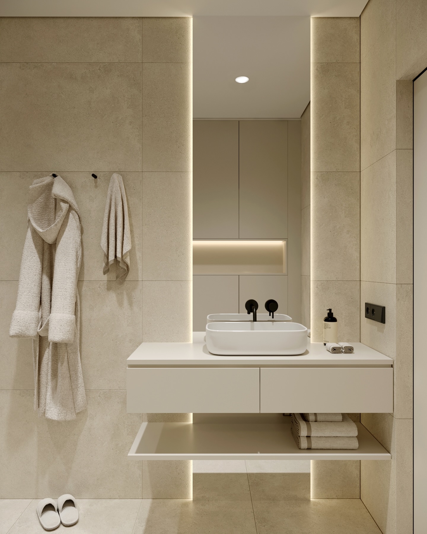 Không gian phòng tắm tiếp nối ngôn ngữ thiết kế chung với sự sang trọng và tĩnh lặng. Bồn tắm độc lập đặt trên bệ đá có đèn hắt chân trở thành tiêu điểm thư giãn. Sự đối lập mạnh mẽ giữa các phụ kiện đen matte và nền tường đá travertine trung tính tạo nên chiều sâu thẩm mỹ. Hệ gương đôi với đèn LED bao quanh không chỉ hỗ trợ công năng mà còn khuếch tán ánh sáng, mang lại bầu không khí nghỉ dưỡng đẳng cấp, nơi sự yên bình được đặt lên hàng đầu.