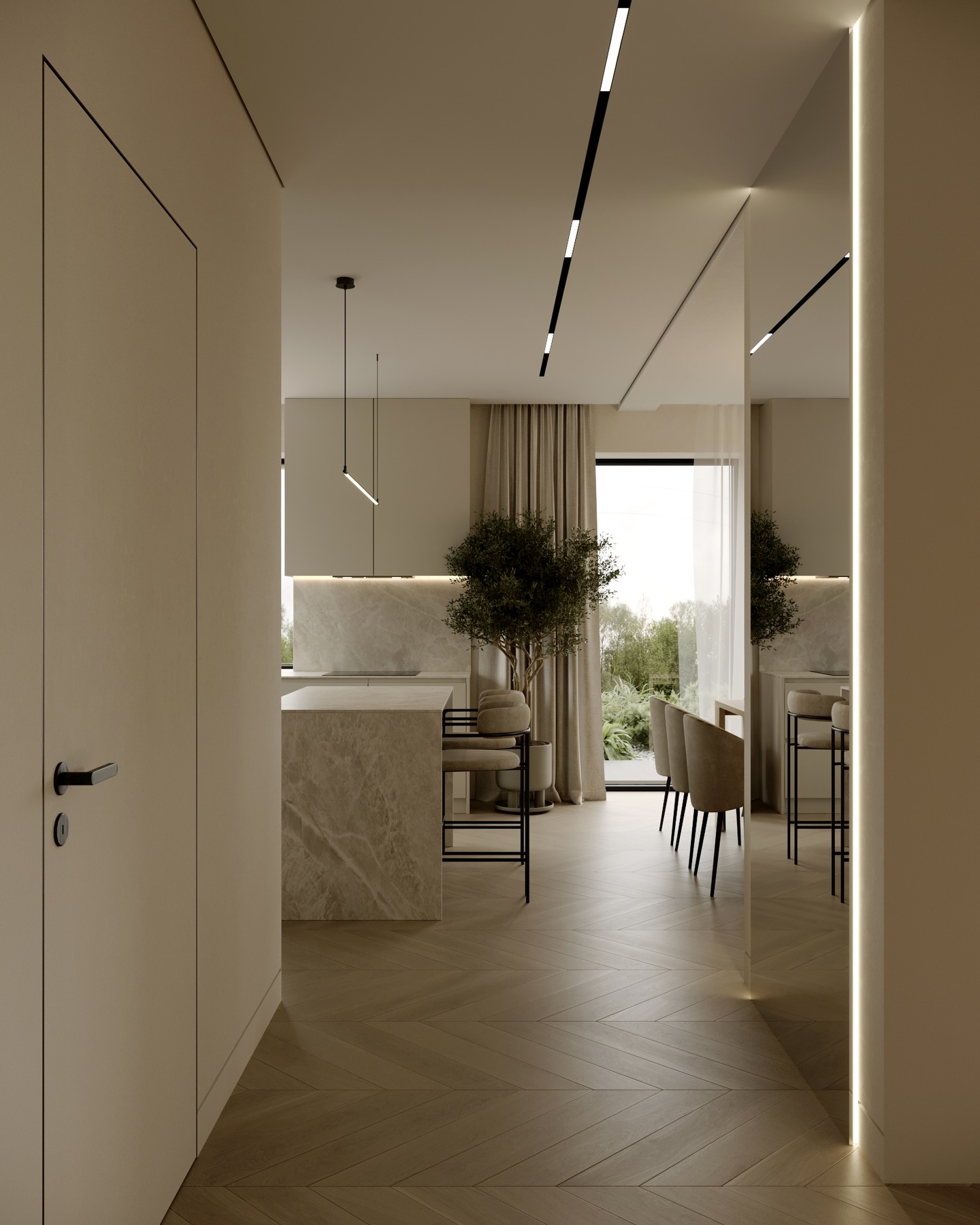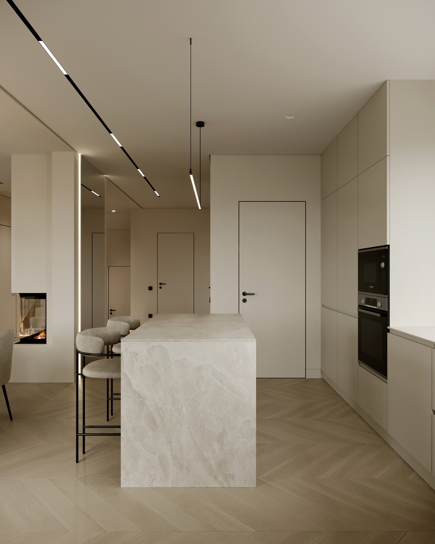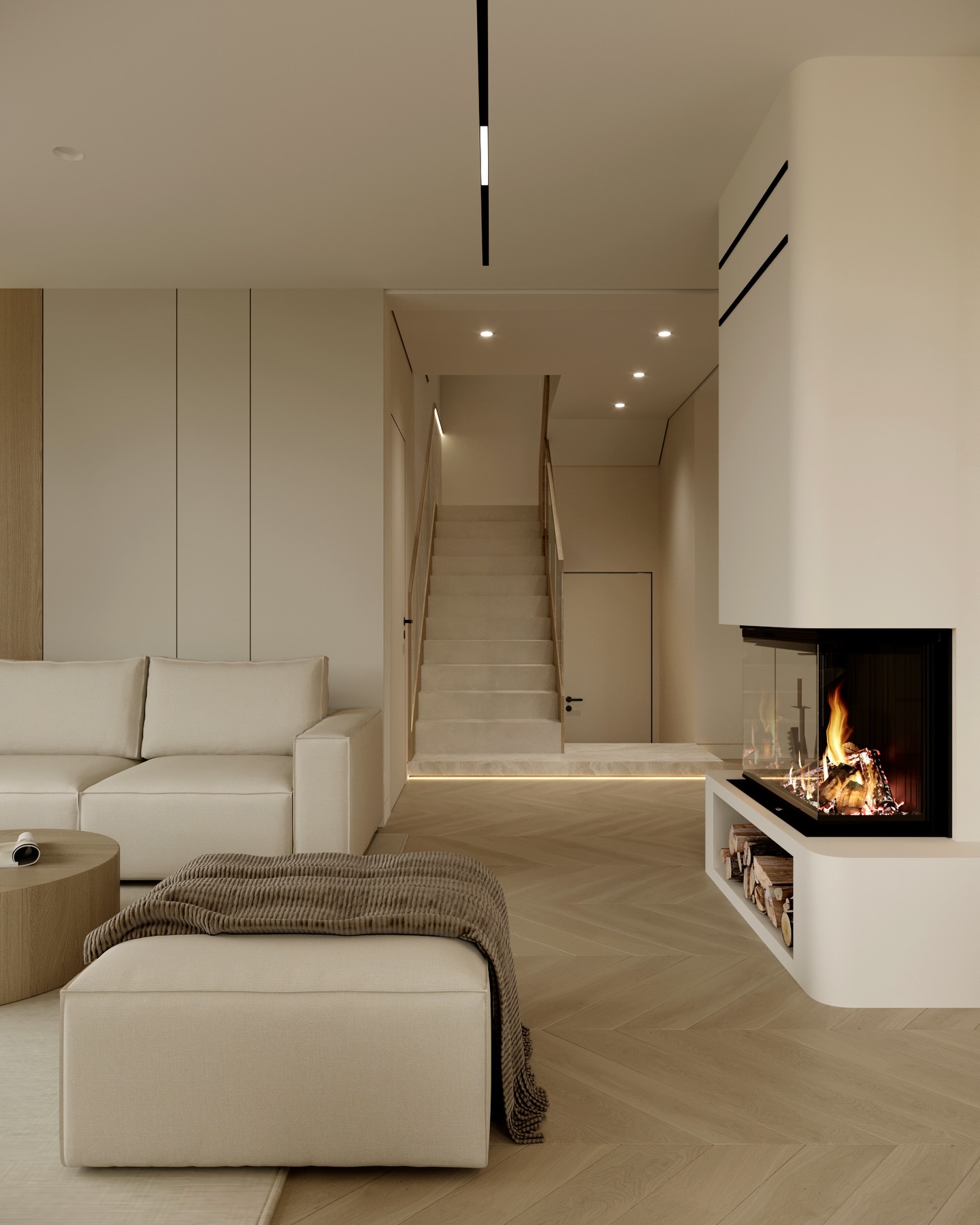 Từ khóa: Thiết kế nội thất Modern Minimalism, lò sưởi ba mặt kính, sàn gỗ xương cá, cầu thang marble hiện đại, đèn ray nam châm, nội thất tông beige.