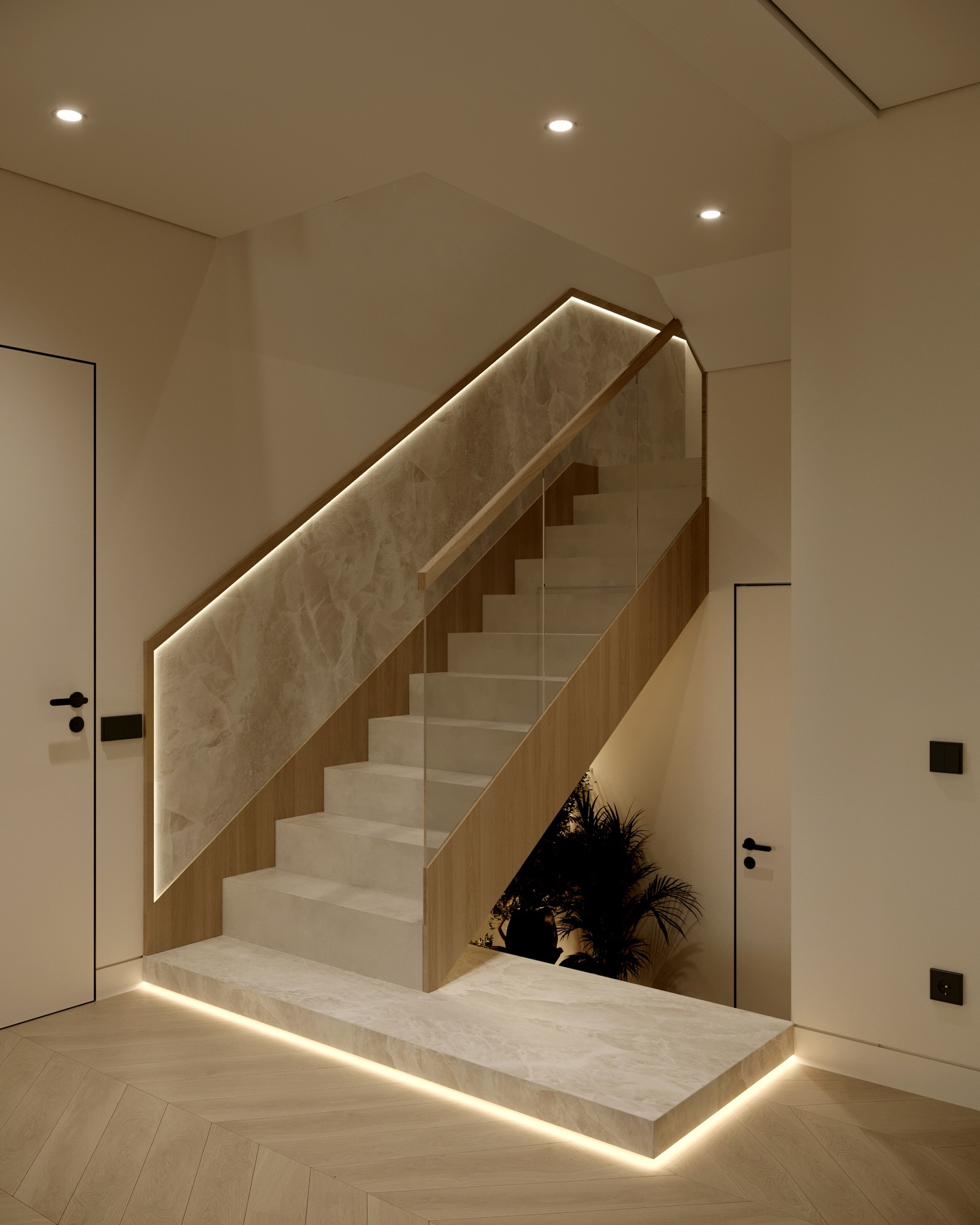 Sự chuyển tiếp giữa các tầng được xử lý khéo léo để tối ưu hóa diện tích thị giác. Hệ cầu thang ốp đá marble vân mây được nâng tầm nhờ hệ thống đèn LED âm sàn chạy dọc chân tường, tạo nên hiệu ứng ánh sáng dẫn hướng đầy mê hoặc.