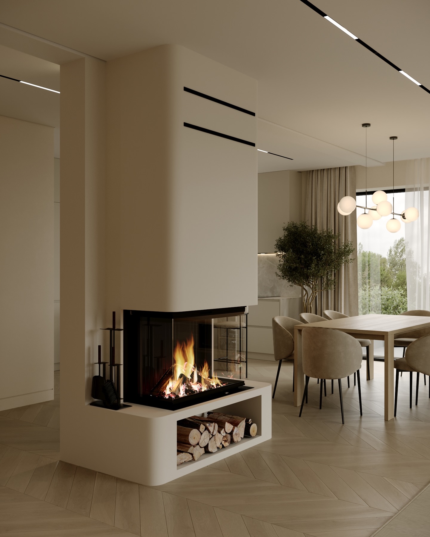 Giải pháp này không chỉ đóng vai trò phân chia không gian giữa phòng khách và khu vực ăn uống một cách ước lệ mà còn tạo ra một luồng nhiệt và ánh sáng ấm áp lan tỏa khắp mặt sàn gỗ xương cá (herringbone) tinh xảo. Đây là sự kết hợp nhuần nhuyễn giữa yếu tố kỹ thuật và thẩm mỹ, biến một chi tiết công năng thành một tác phẩm điêu khắc tại trung tâm ngôi nhà.
