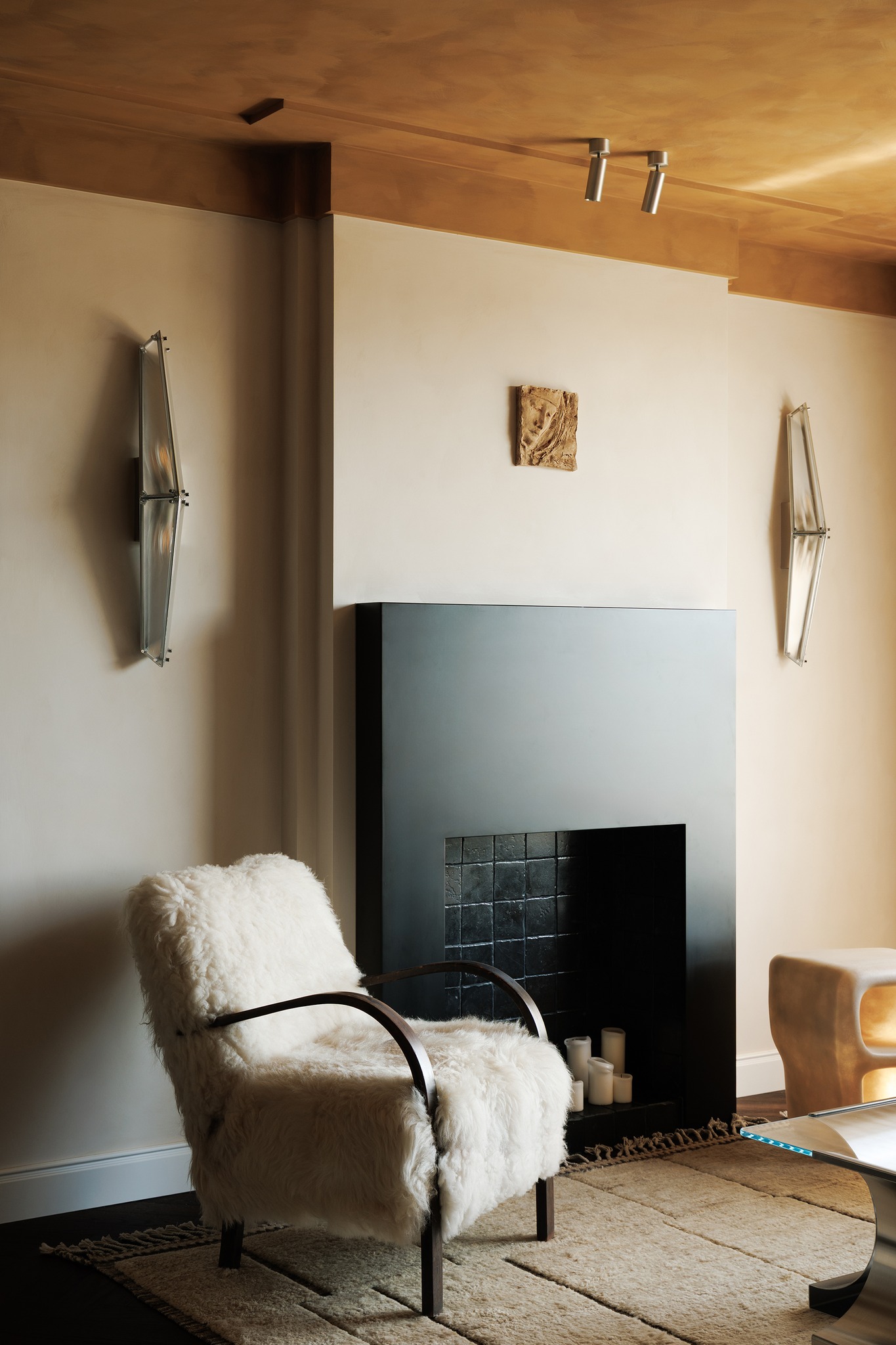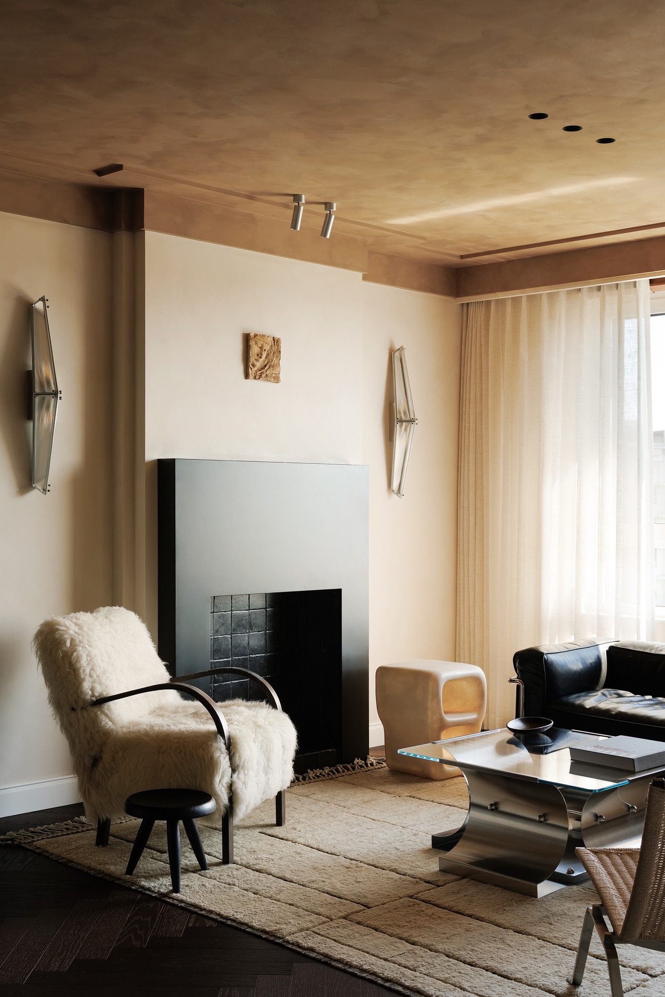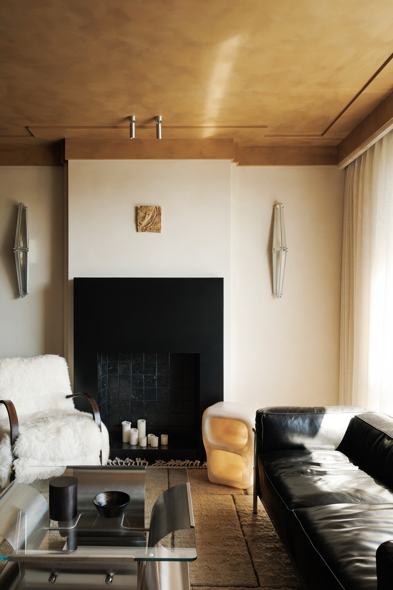 Điểm nhấn lò sưởi: Sử dụng gỗ đen kết hợp đá mài (Horseshoe stone), lò sưởi trở thành tiêu điểm thị giác thâm trầm và tĩnh lặng.