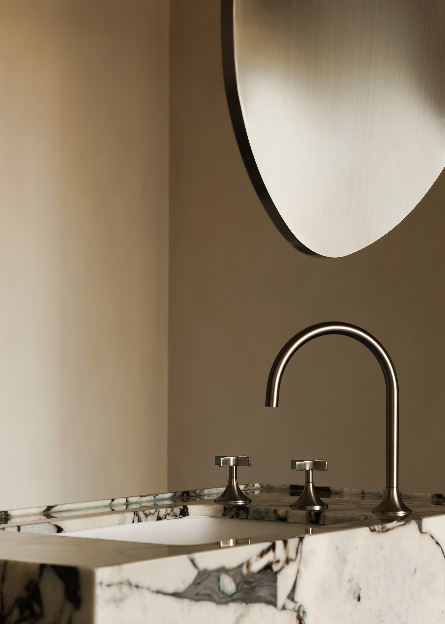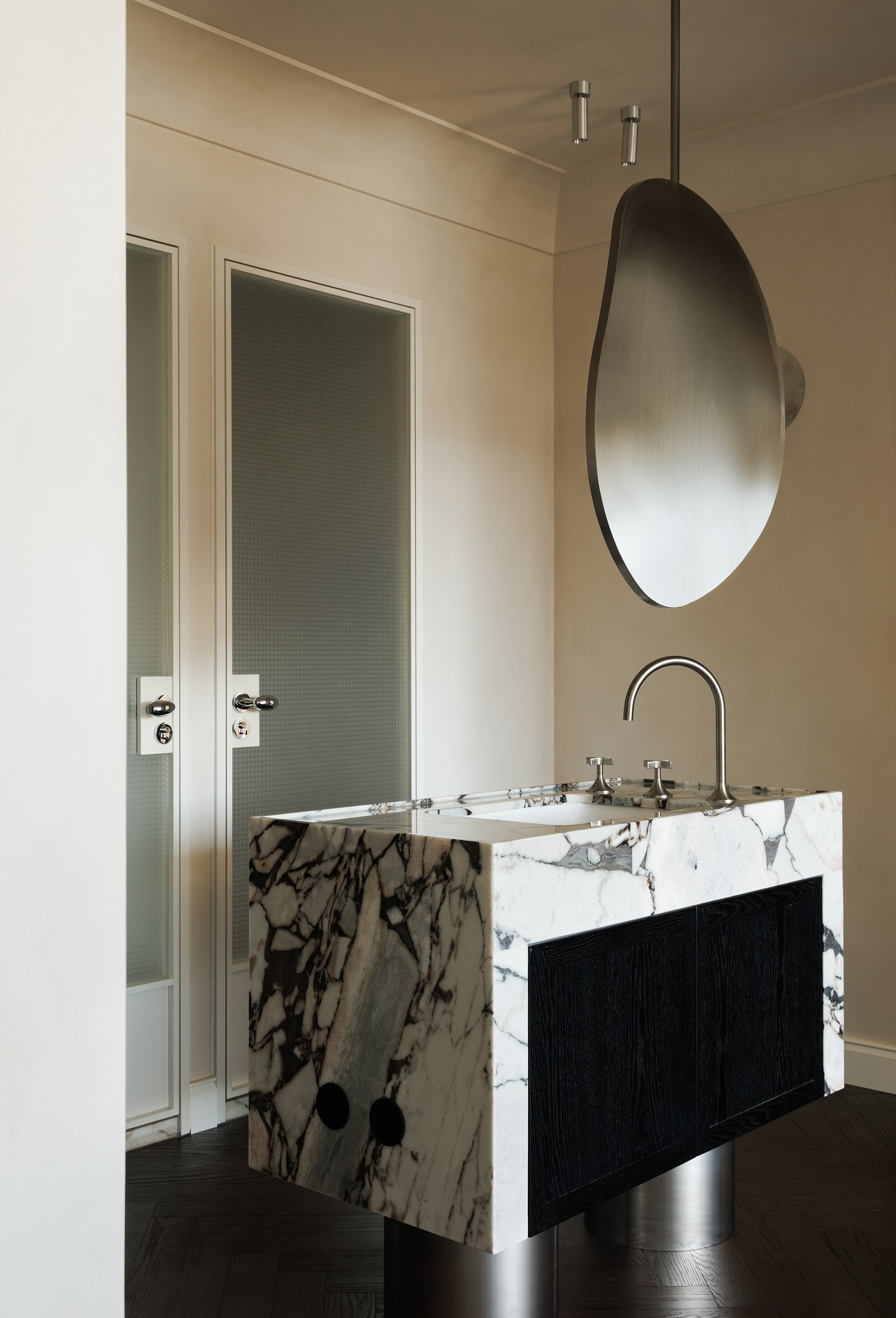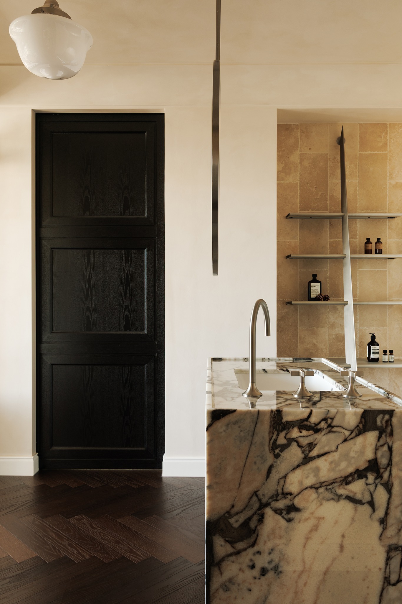 Không gian được xây dựng trên một hệ thống chất liệu đặc trưng bao gồm gỗ tự nhiên, đá, kim loại và da, kết hợp với các chi tiết khảm kim loại tinh xảo.