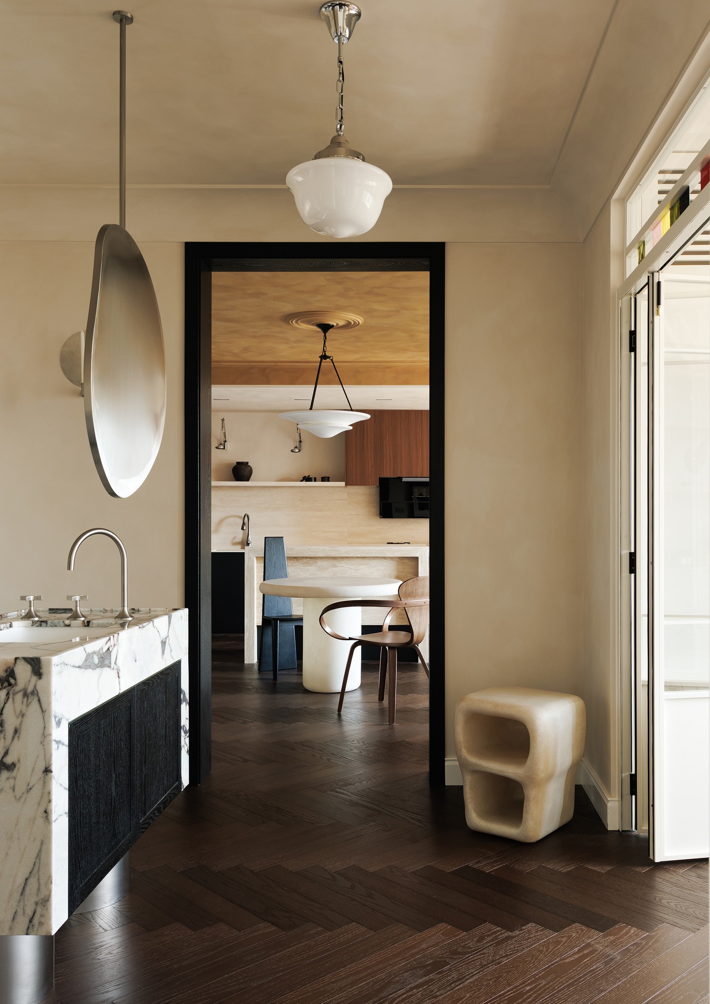 Từ khóa: Thiết kế nội thất phong cách New Money, sơn hiệu ứng Lime wash thủ công, đá Travertine và gỗ óc chó, không gian sống đối xứng Art Deco, nội thất chiết trung thế hệ 95.