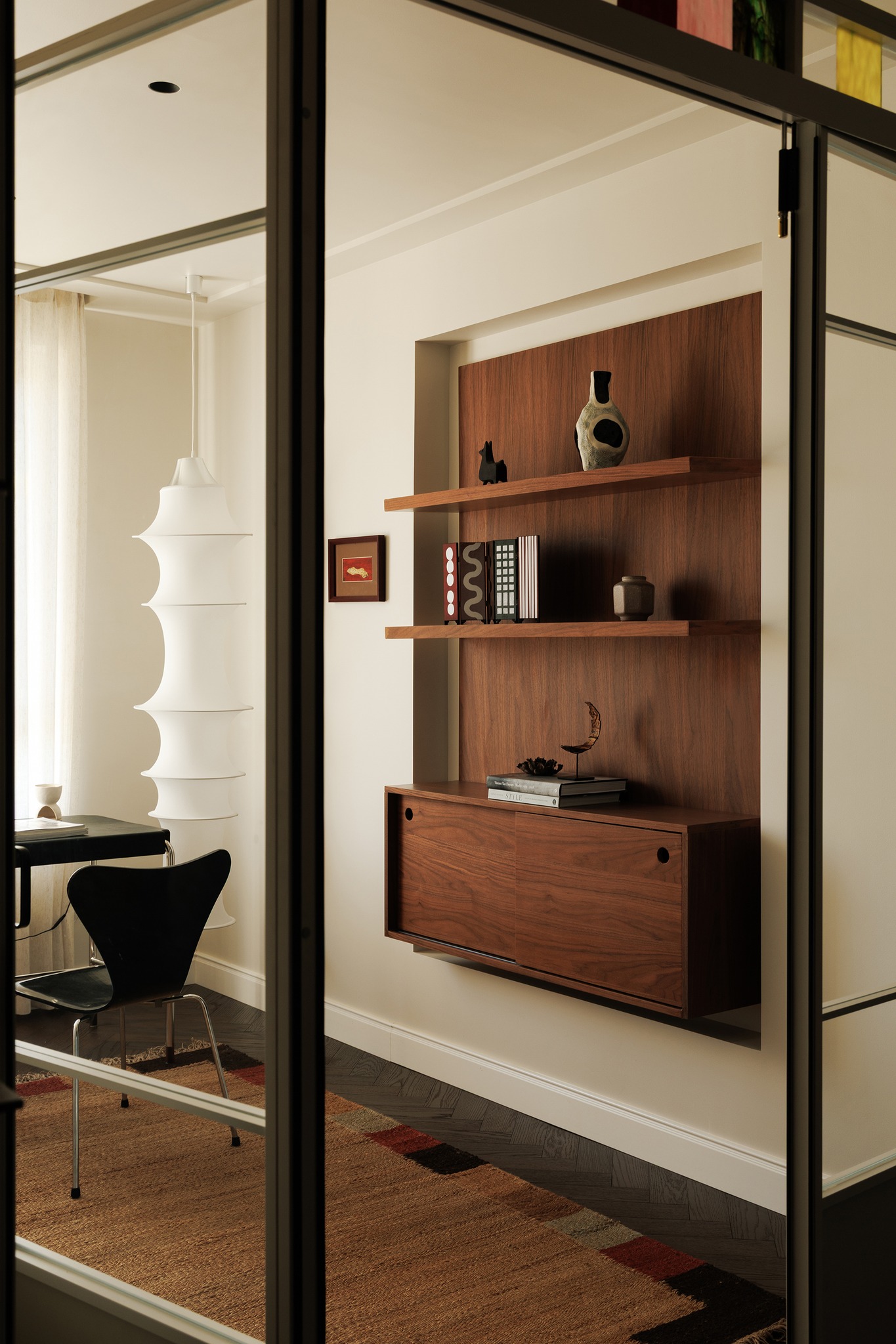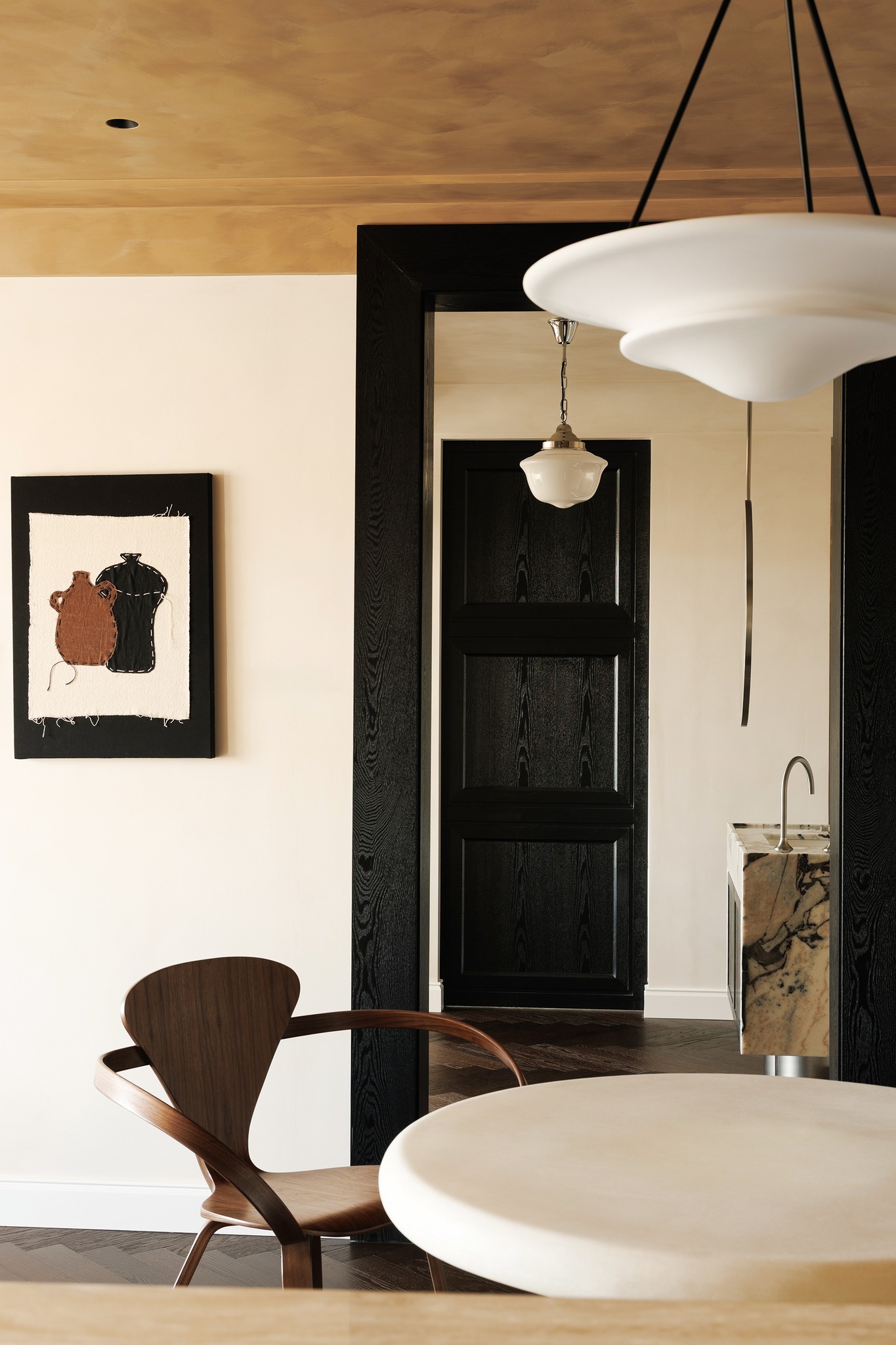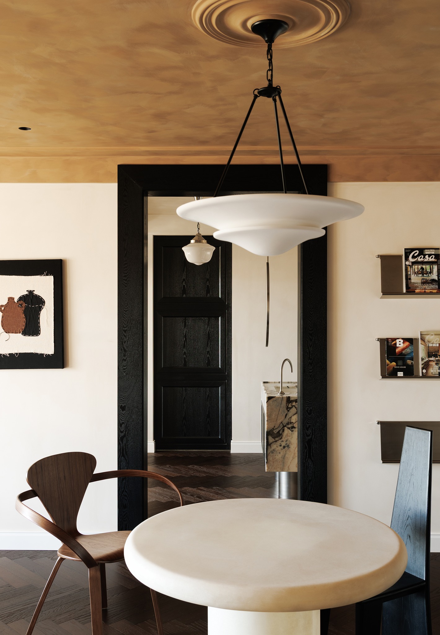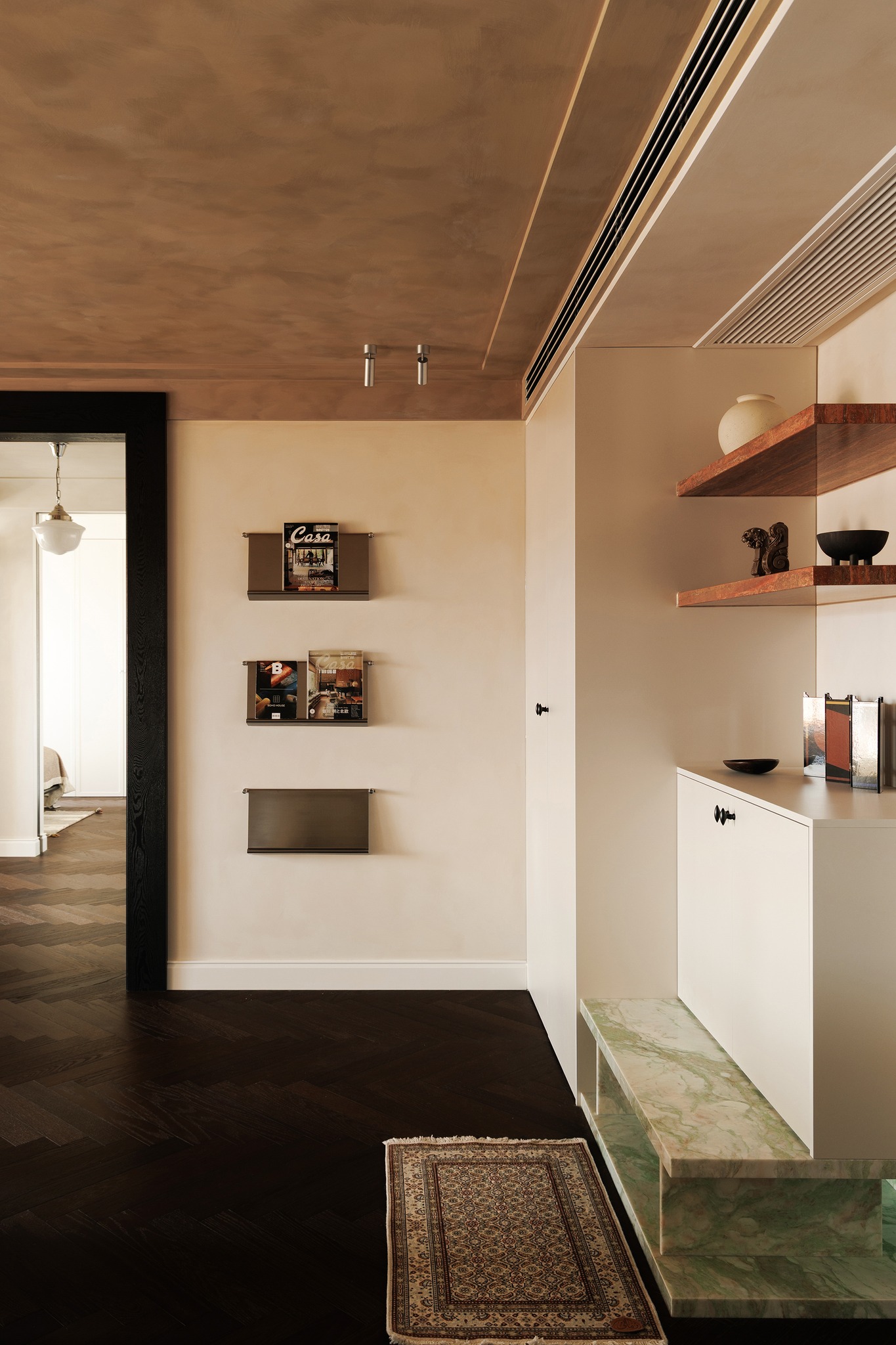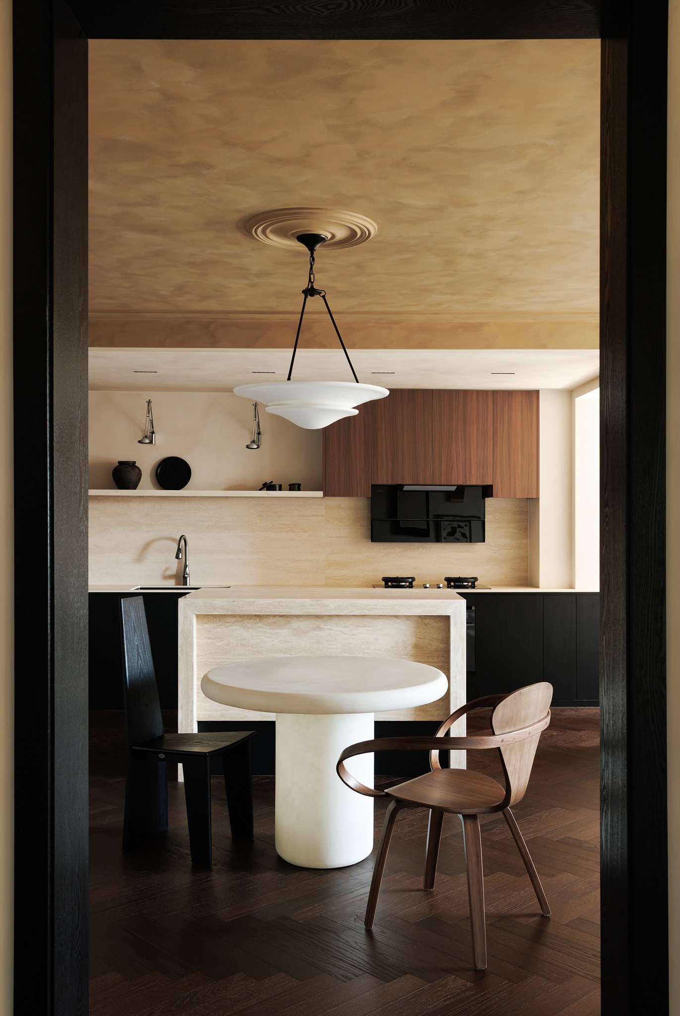 Kịch bản ánh sáng và màu sắc: Tường được xử lý bằng kỹ thuật Lime wash (sơn vôi) thủ công, tạo độ nhám tự nhiên. Trần nhà mang màu sắc tương phản mạnh mẽ, đối thoại với sàn gỗ óc chó phía dưới, tạo nên một bối cảnh đậm chất kịch nghệ và điện ảnh.