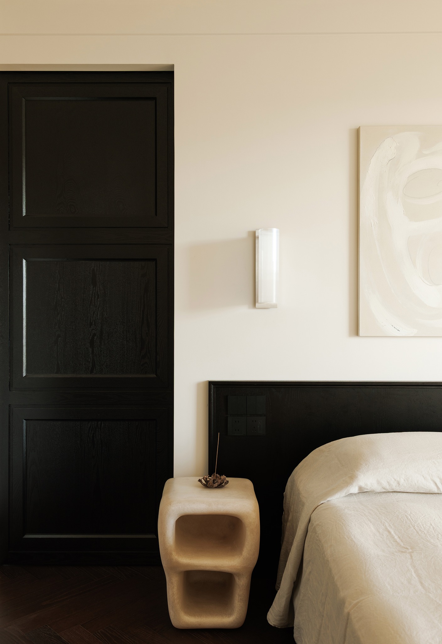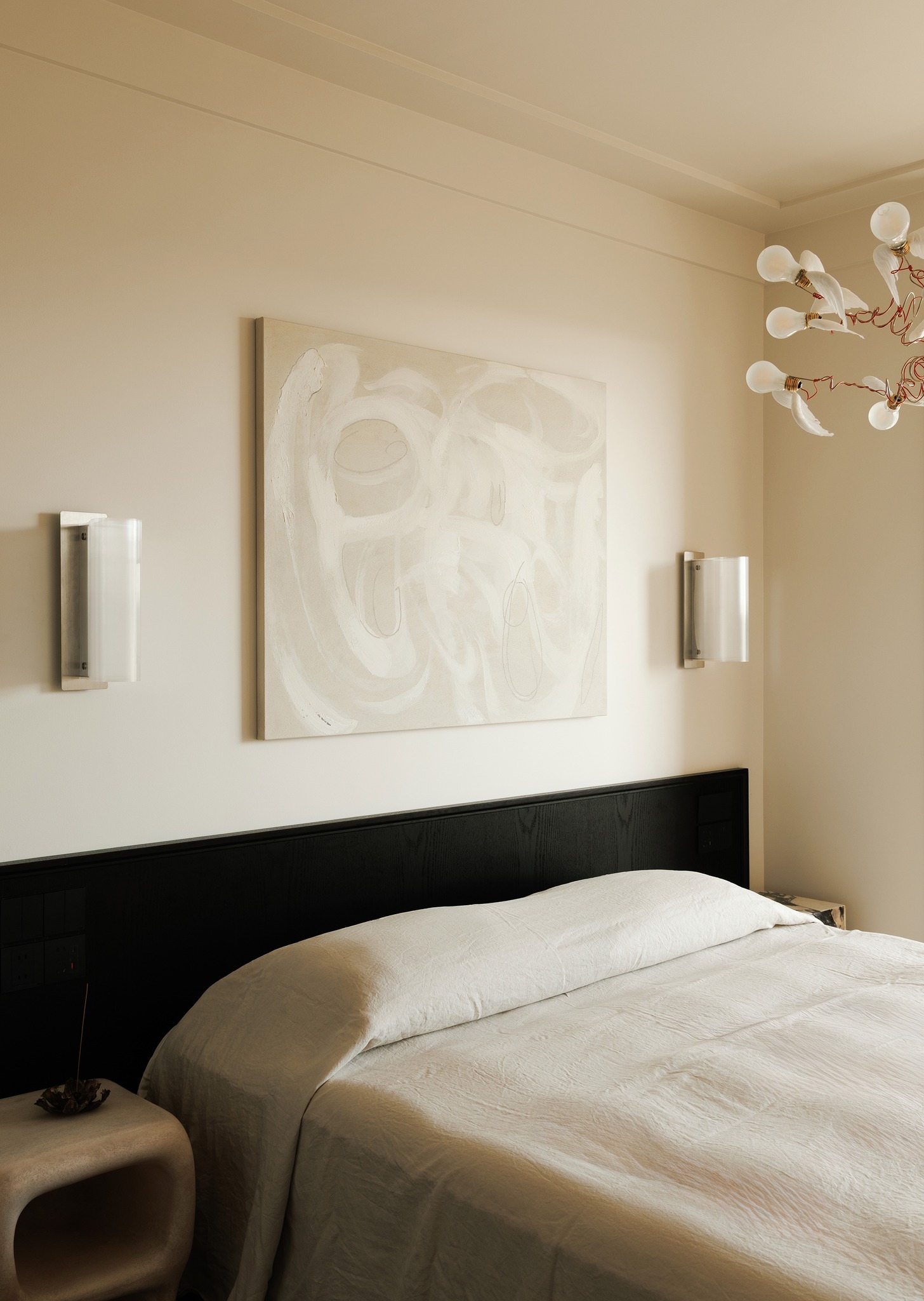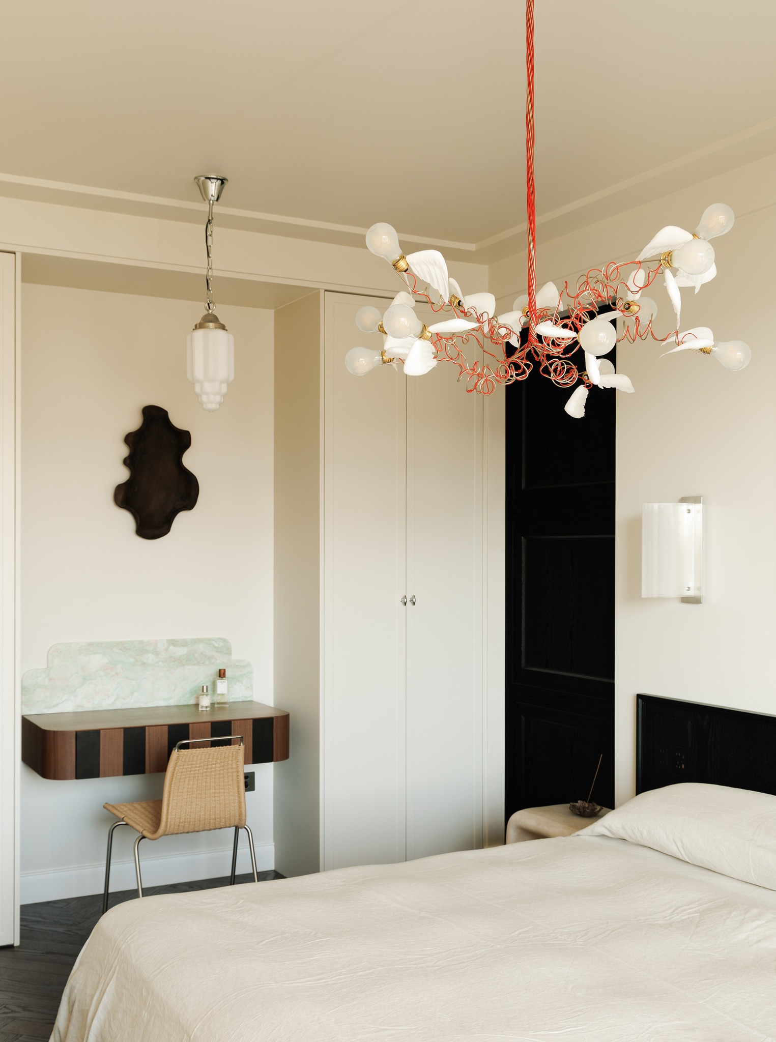 Phòng ngủ chính: Sự va chạm giữa tông màu gỗ và đen, kết hợp với các đường phào chỉ kiểu Pháp và cạnh bo tròn, giúp trung hòa nét góc cạnh của nội thất. Điểm nhấn là chiếc đèn Lucellino với đôi cánh lông vũ, mang lại sự nhẹ nhàng và bay bổng cho không gian nghỉ ngơi.