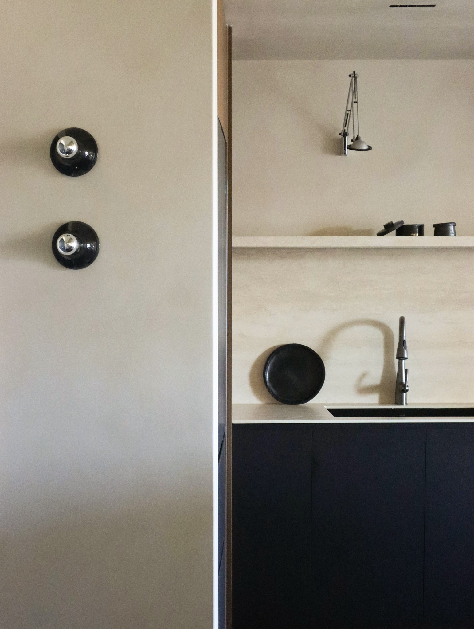 Quy hoạch mặt bằng: Căn hộ được chia tách tự nhiên thành hai khu vực động và tĩnh bởi hệ tường chịu lực. Không gian khách – bếp được mở hoàn toàn, tái kết nối theo một trật tự mới.