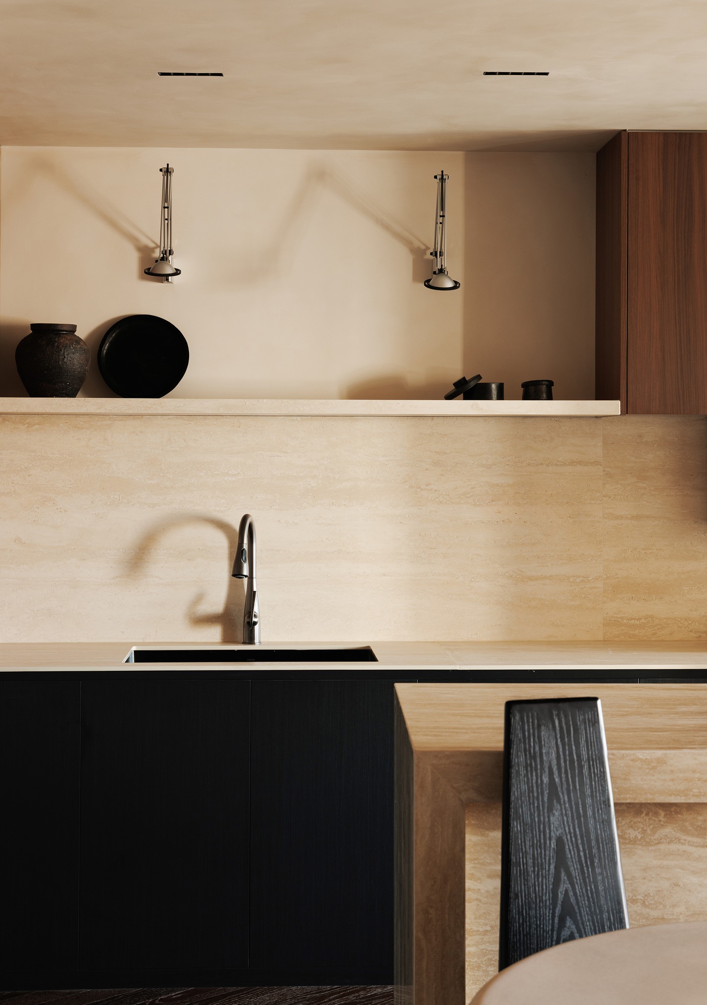 Chất liệu bản nguyên: Đá Travertine (đá lỗ) màu kem được sử dụng diện lớn cho bàn bếp và đảo bếp, mang lại cảm giác ấm áp và nâng cao xúc giác khi nấu nướng.