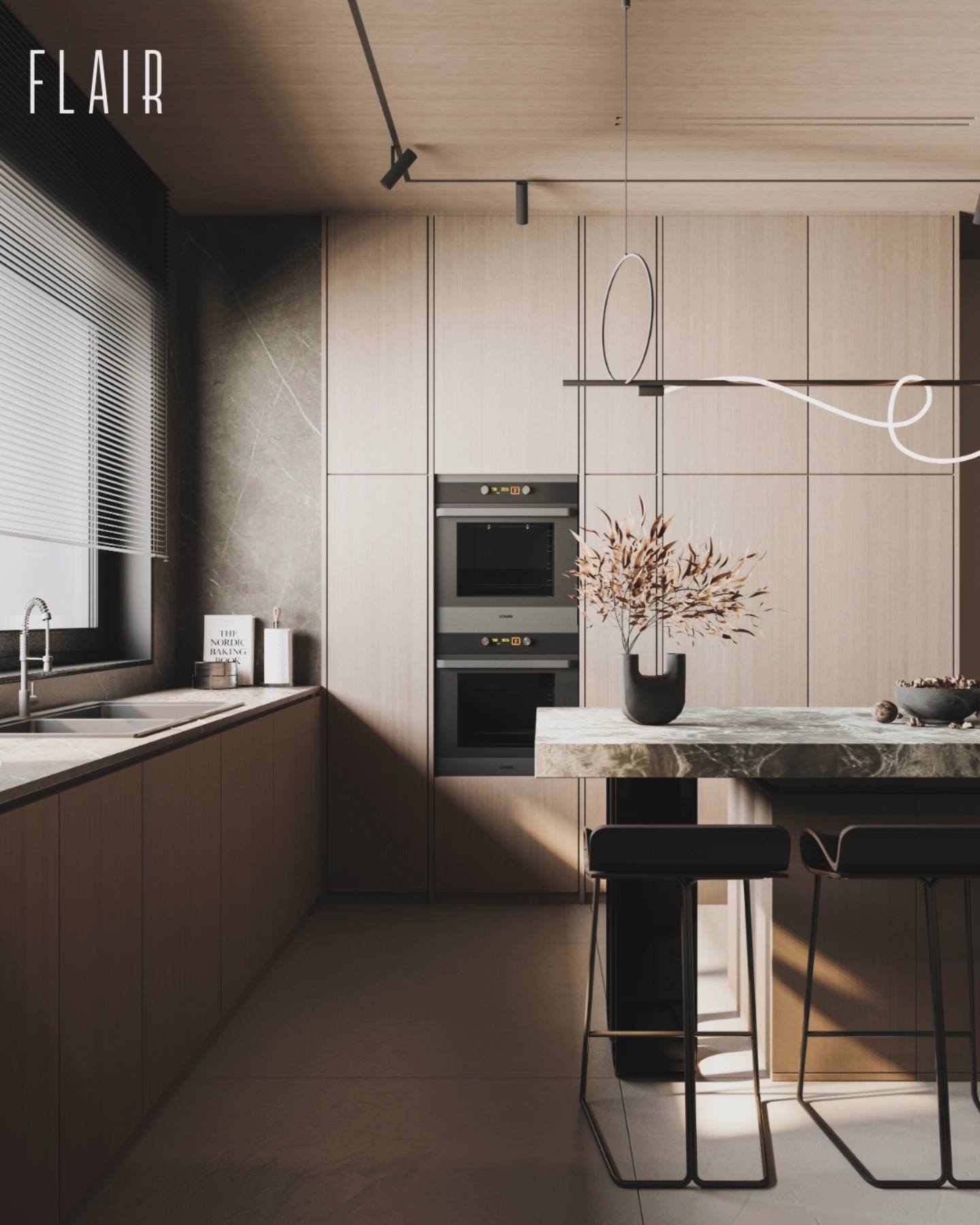 Từ khóa: Thiết kế nội thất bếp tối giản, gỗ sồi tự nhiên trong nội thất, bàn đảo đá marble, ánh sáng kiến trúc bếp, phong cách nội thất ấm cúng.