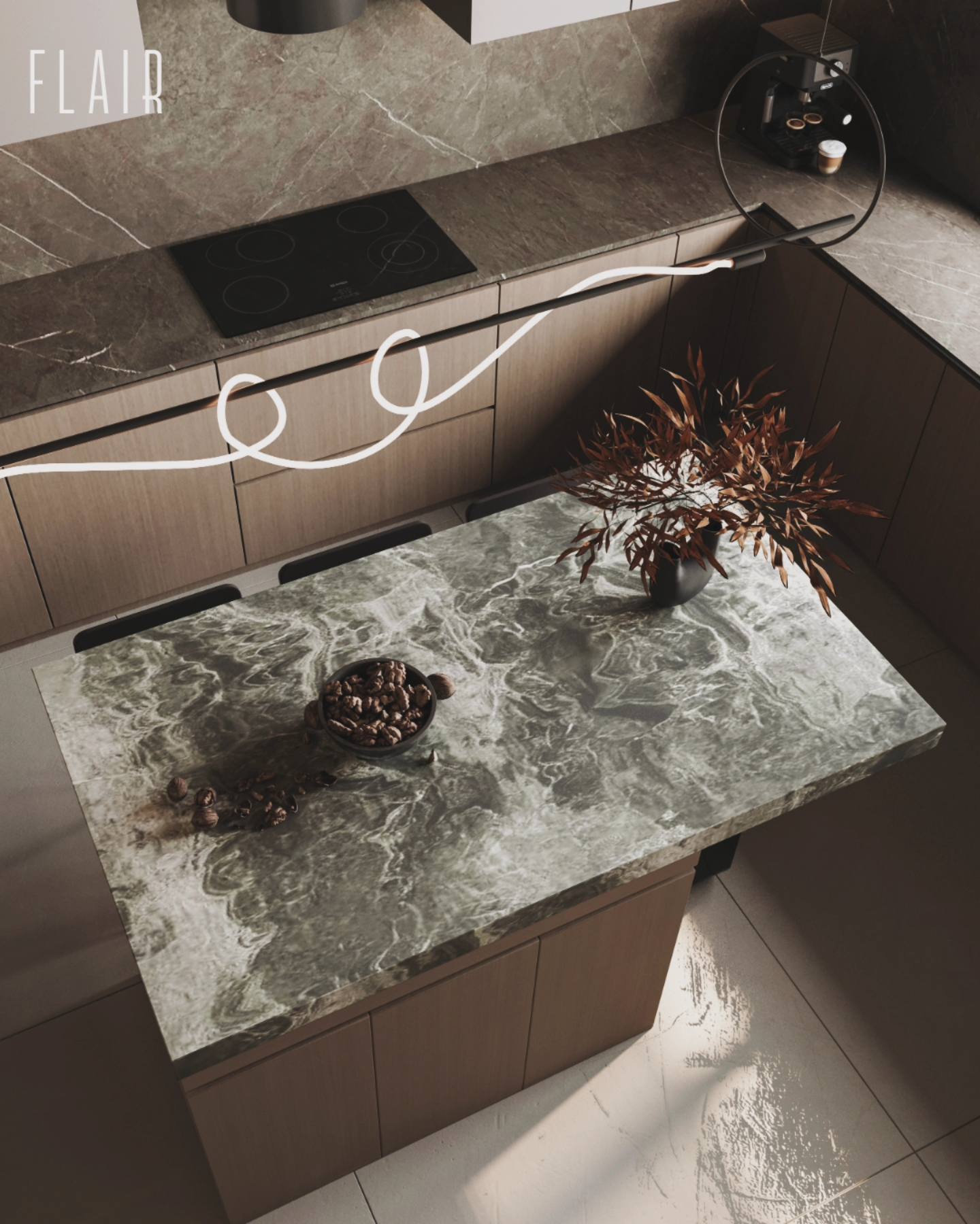 Đảo bếp bằng đá (Stone Island): Đối lập với sự nhẹ nhàng của gỗ, khối đảo bếp bằng đá đóng vai trò là “điểm neo” thị giác. Sức nặng và sự tĩnh tại của đá tự nhiên mang lại cảm giác vững chãi, an định cho toàn bộ khu vực nấu nướng.