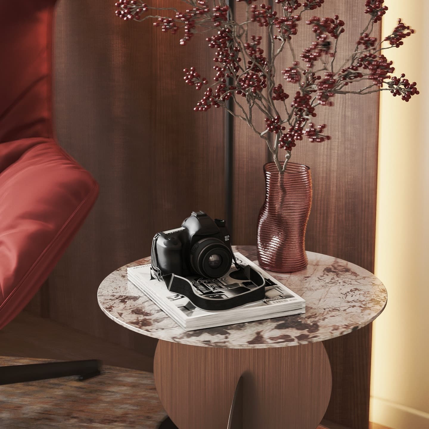 Sự hoàn mỹ của căn hộ nằm ở việc chăm chút cho từng chi tiết nhỏ: từ đèn sàn kiểu dáng đương đại, bình hoa gốm đến các cuốn sách nghệ thuật được sắp đặt có ý đồ. Tầm nhìn được mở rộng tối đa ra khu vực bể bơi và sân vườn bên ngoài qua các góc kính kịch trần, mang lại cảm giác thư thái tuyệt đối.
