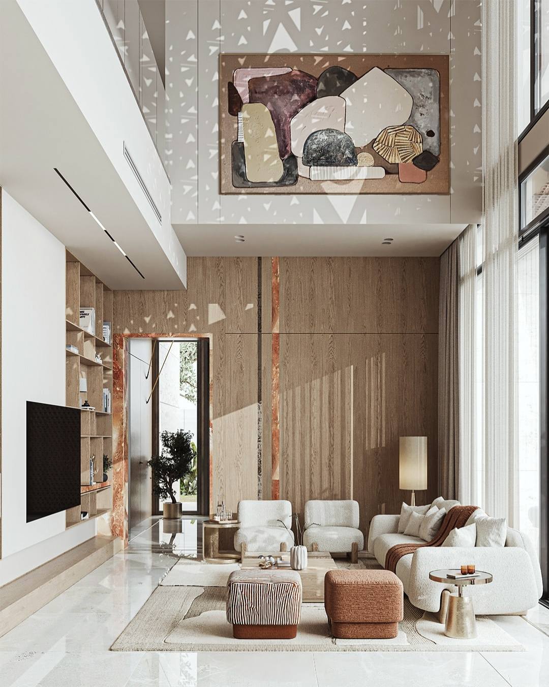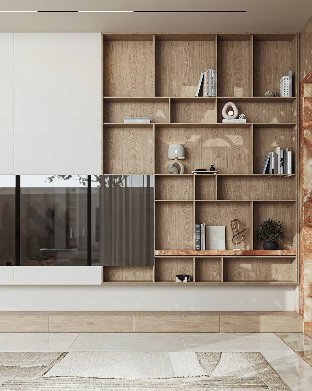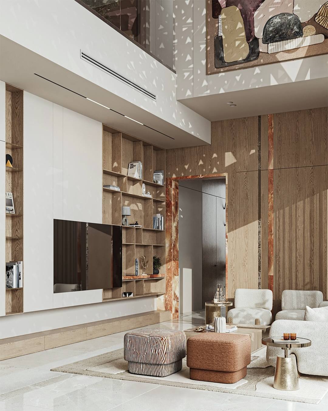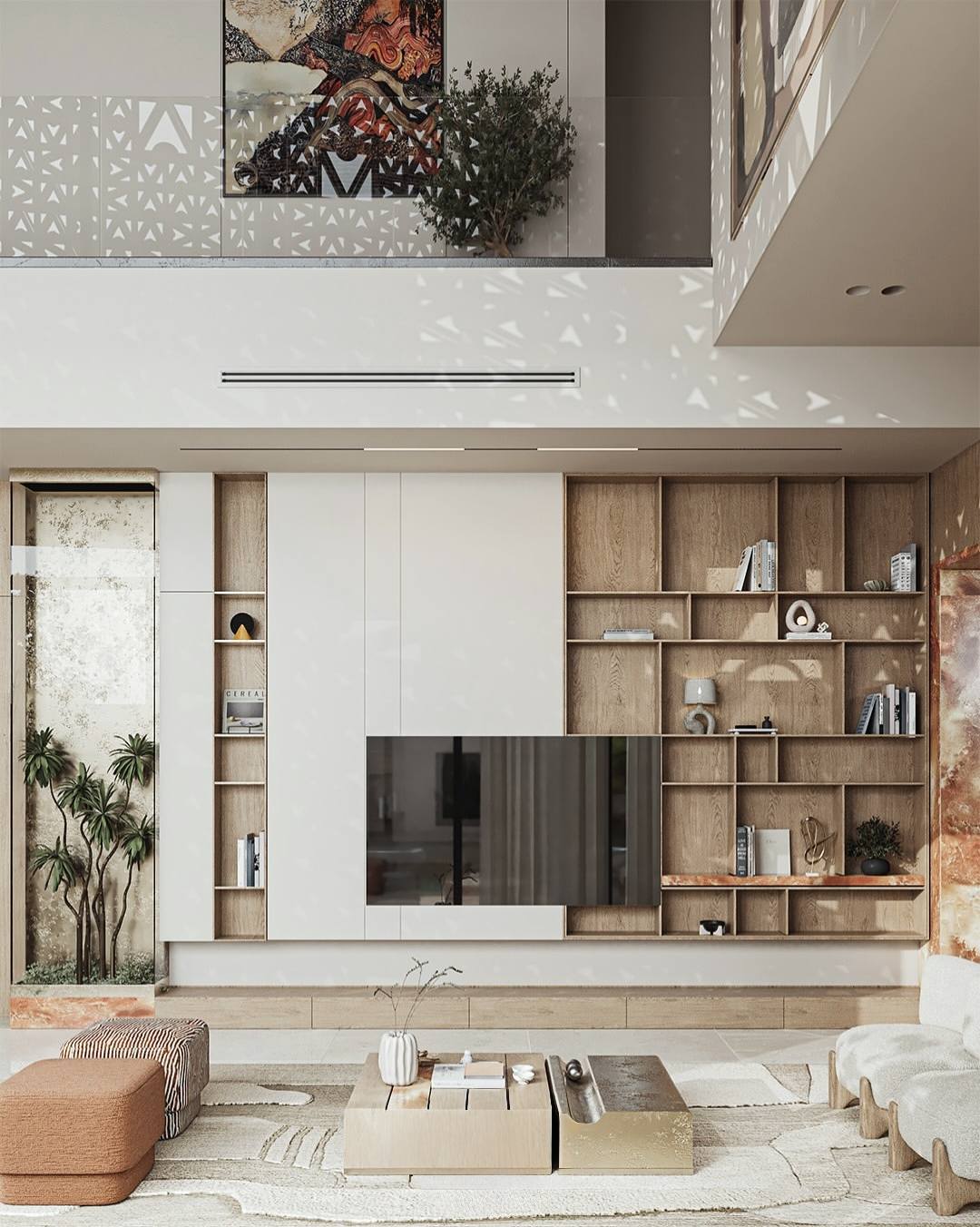 Tại phòng khách, thiết kế tập trung vào sự cân bằng giữa diện phẳng và hình khối. Hệ tủ kịch trần được tích hợp khéo léo giữa các ngăn mở bằng gỗ và mảng tường trắng phẳng phiu, tạo nên một cấu trúc lưu trữ thẩm mỹ và ngăn nắp.