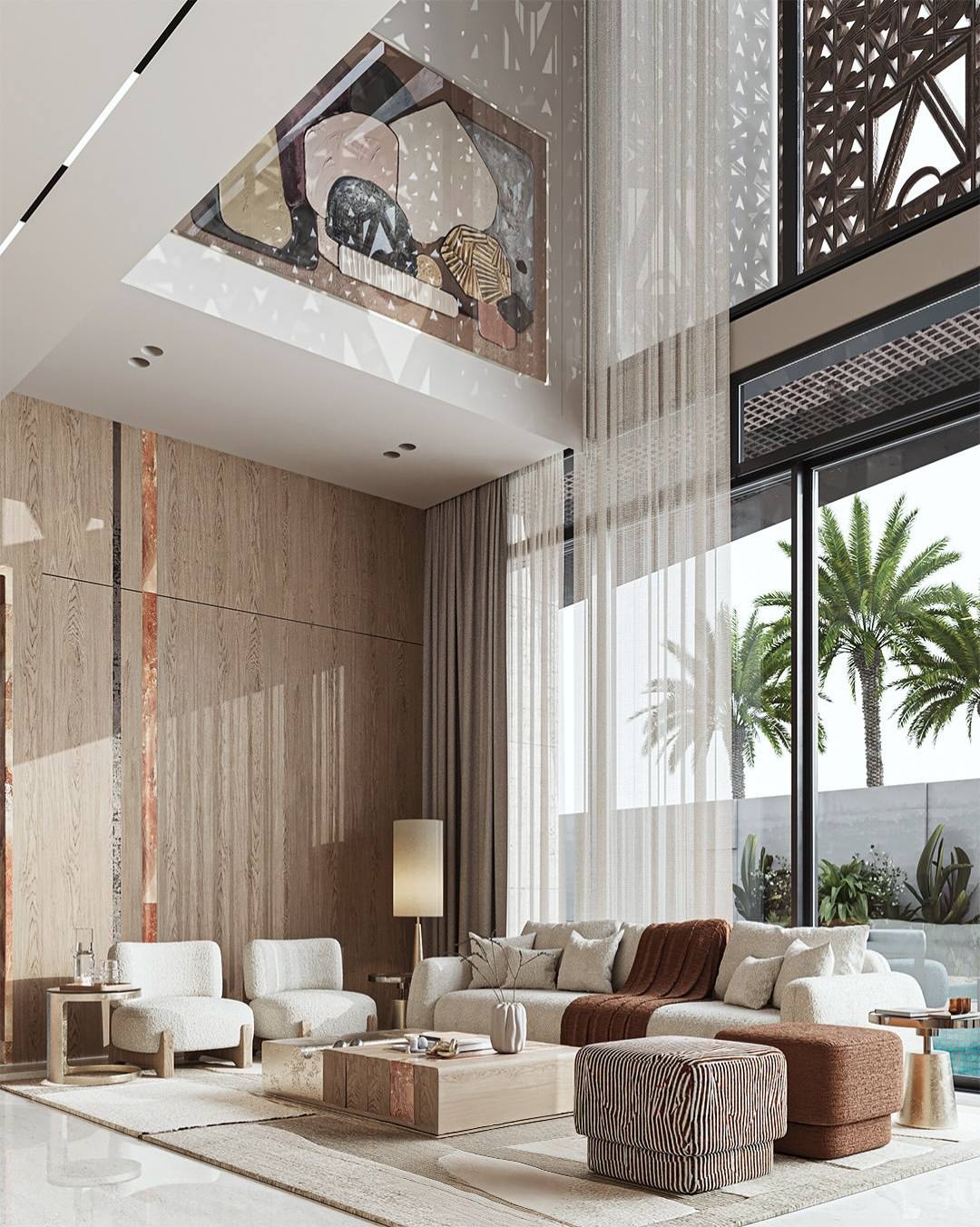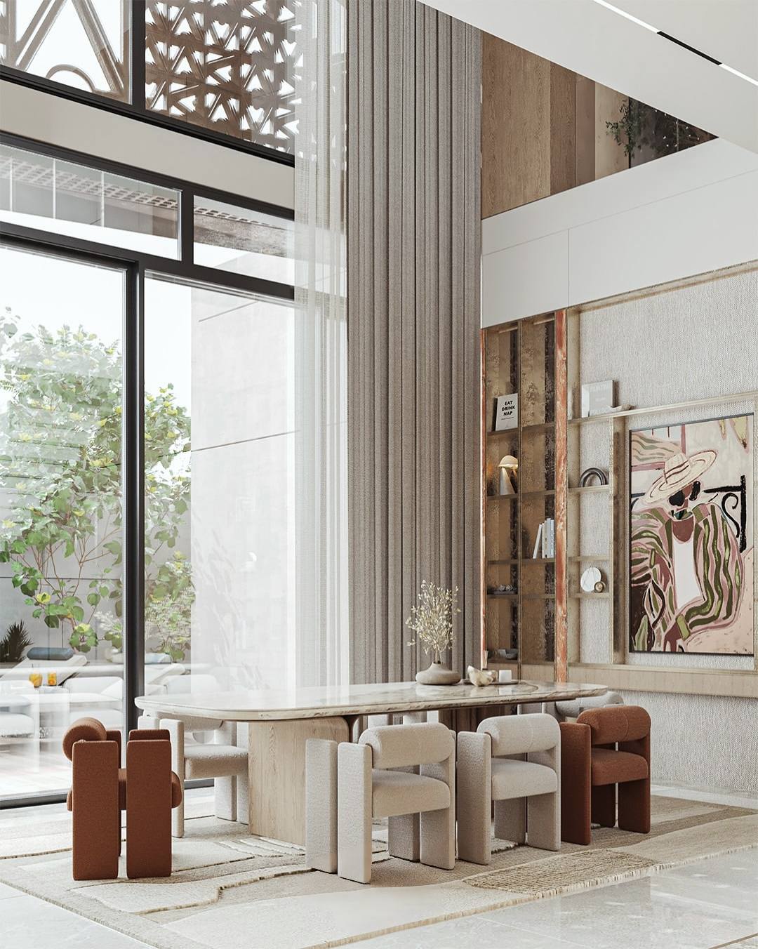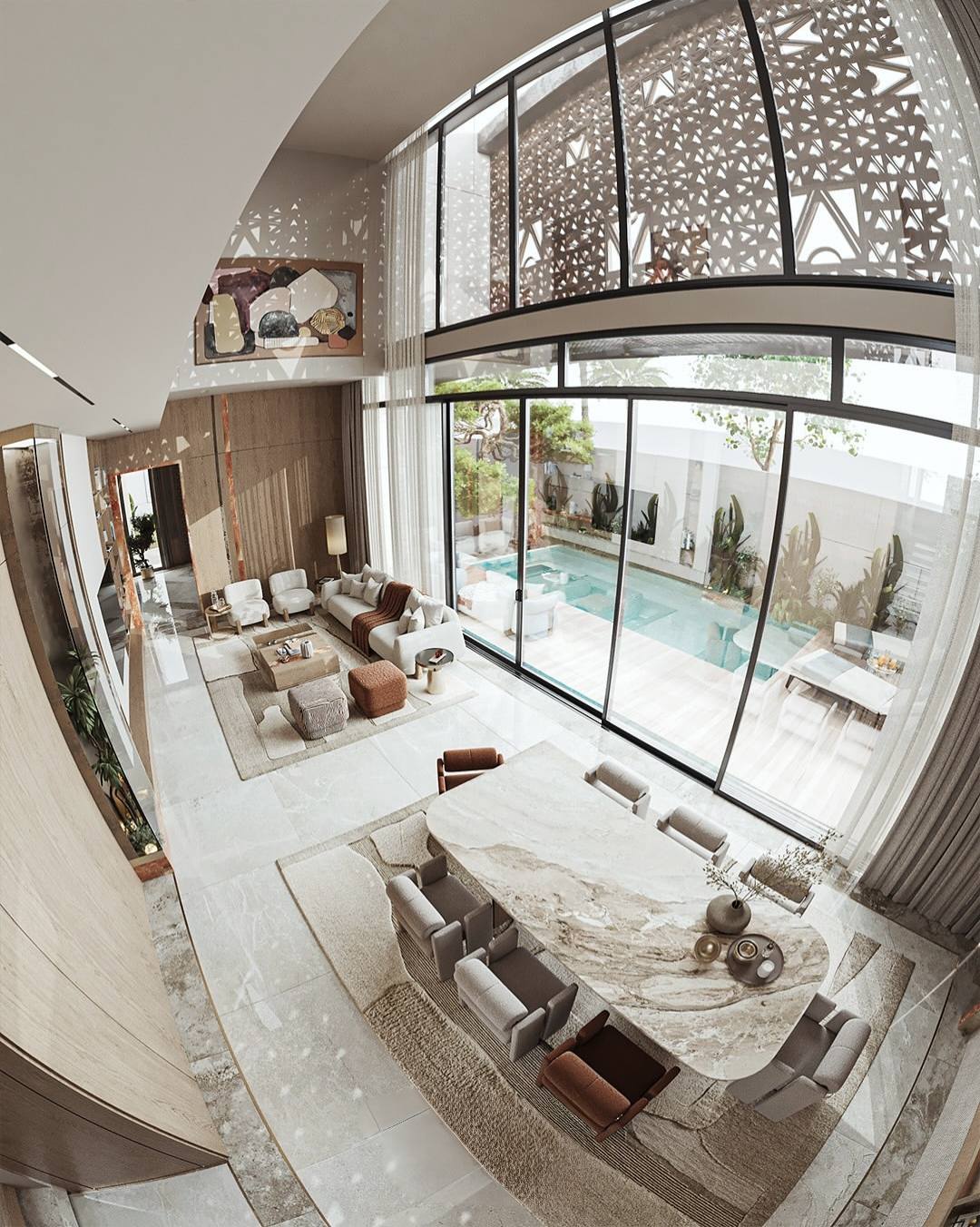 Ánh sáng được xác định là linh hồn của không gian thông tầng này. Với hệ cửa kính cao từ sàn đến trần, ánh nắng tự nhiên được tận dụng tối đa, làm mờ đi ranh giới giữa bên trong và bên ngoài.