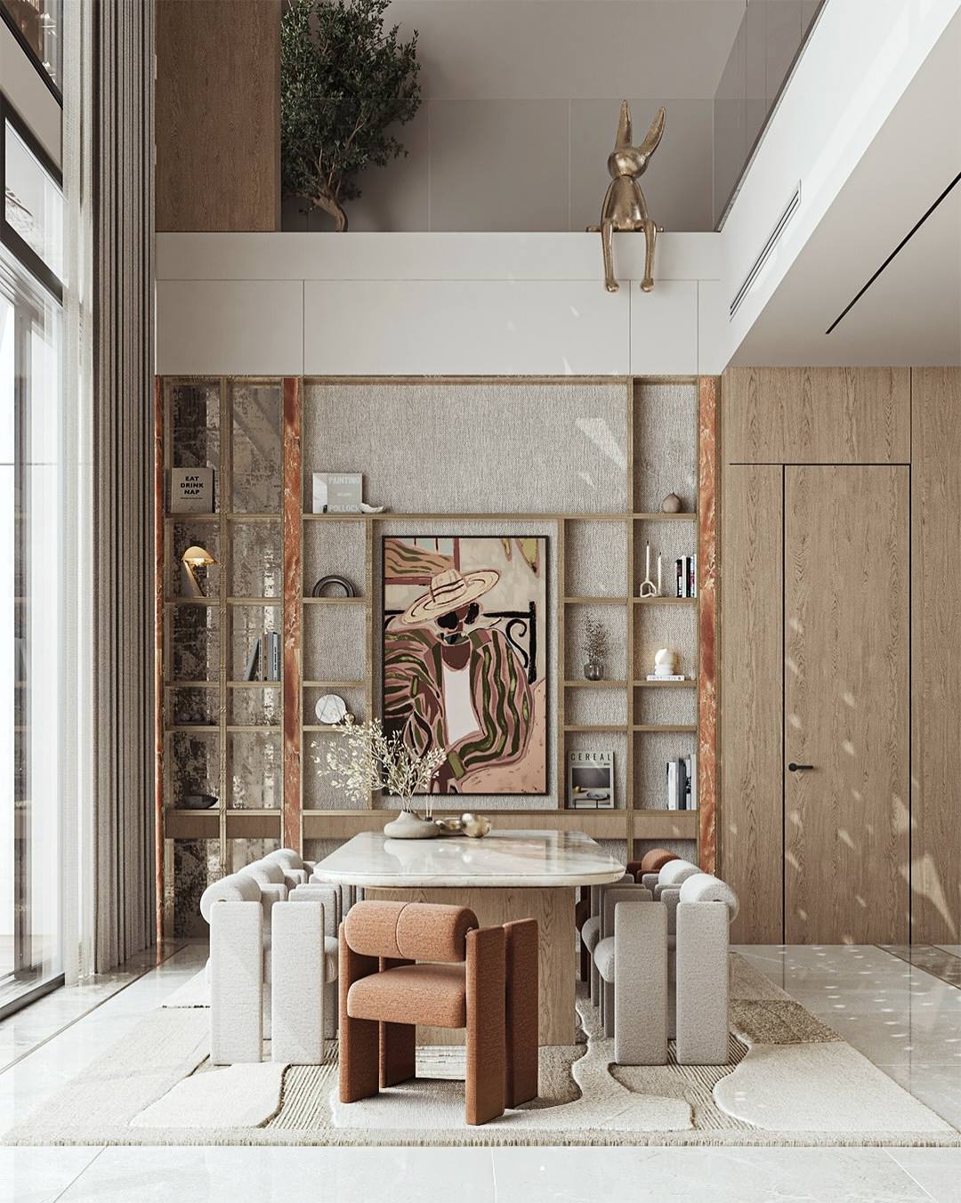 Khu vực ăn uống được thiết kế liên thông với phòng khách, nổi bật với chiếc bàn đá marble lớn có vân mây uốn lượn tự nhiên. Phía sau, các kệ sách âm tường và những bức tượng điêu khắc tinh nghịch trên gờ tường tạo nên một không gian văn hóa đầy cảm hứng.