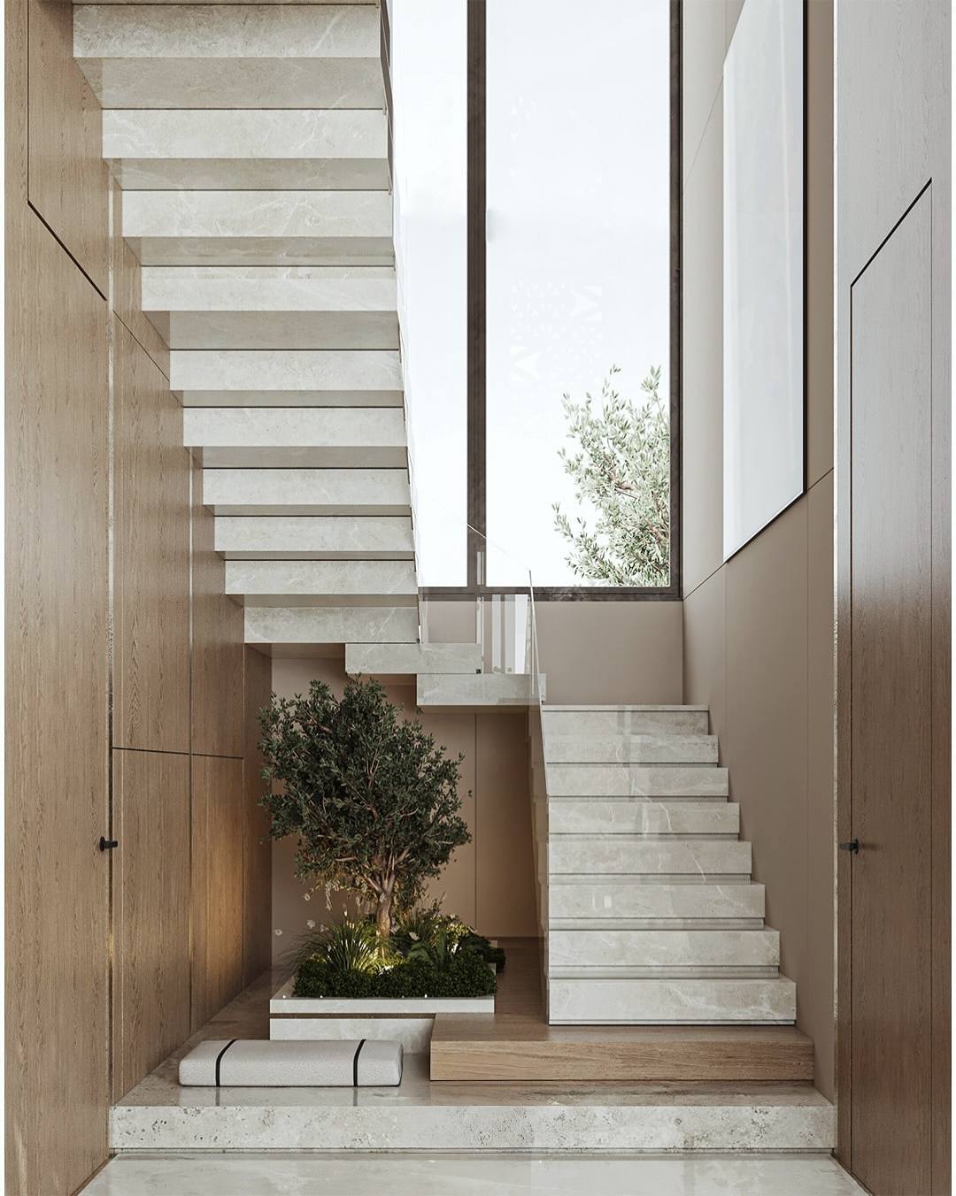 Sự hiện diện của thiên nhiên được đưa vào một cách tinh tế qua các bồn cây xanh dưới chân cầu thang đá cẩm thạch trắng. Cầu thang được thiết kế theo dạng bậc đá nguyên khối không tay vịn kết hợp vách kính trong suốt, tạo nên vẻ đẹp thanh thoát, nhẹ nhàng như đang trôi lơ lửng trong không gian.