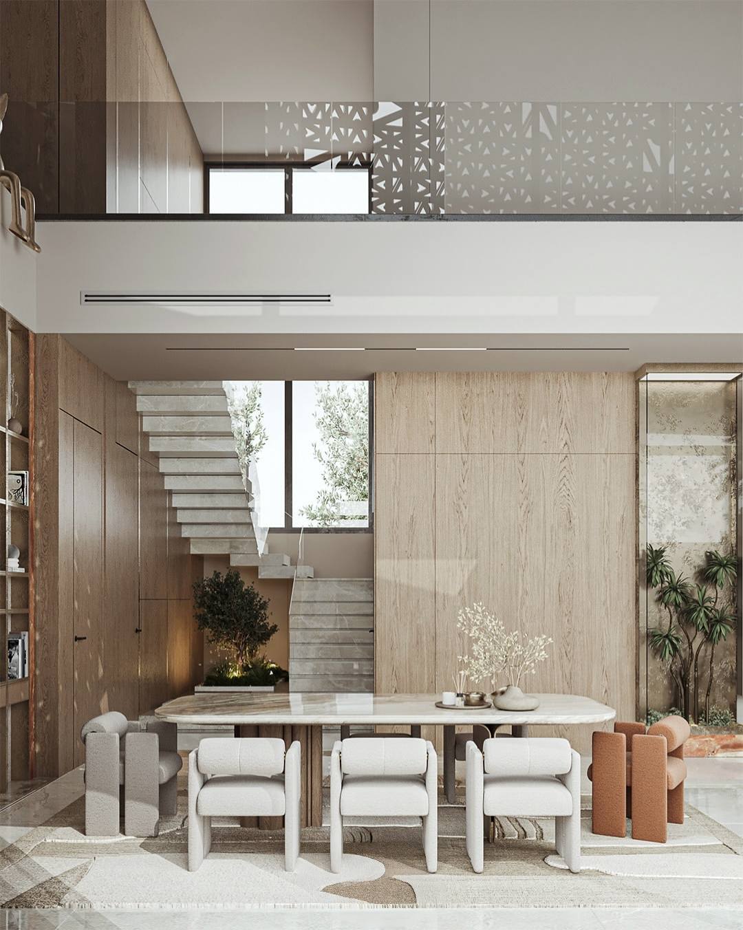 Một chi tiết kiến trúc đắt giá nằm ở việc sử dụng các tấm lưới CNC ở tầng trên. Khi ánh sáng xuyên qua, chúng tạo ra những bóng đổ họa tiết hình học biến ảo trên diện tường gỗ và các bức tranh trừu tượng treo cao, biến không gian thành một tác phẩm sắp đặt ánh sáng sống động thay đổi theo thời gian trong ngày.