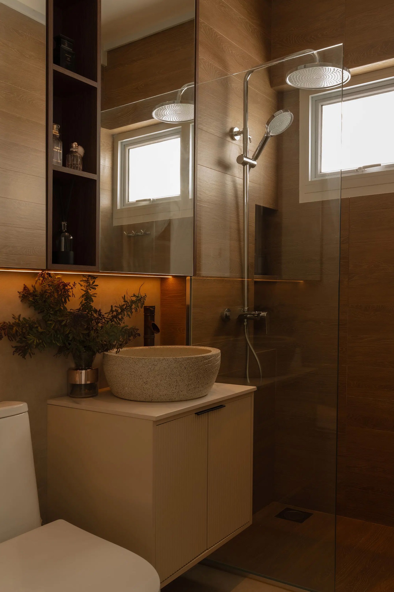 Đan xen vào đó là các tông màu nâu ấm (warm browns) từ gỗ và các chất liệu hữu cơ, mang lại sự vững chãi và chiều sâu kiến trúc. Sự phối hợp này không tạo ra những cú sốc về thị giác mà dẫn dắt cảm xúc người cư ngụ vào một trạng thái tĩnh tại, tách biệt hoàn toàn với những ồn ã của thế giới bên ngoài.
