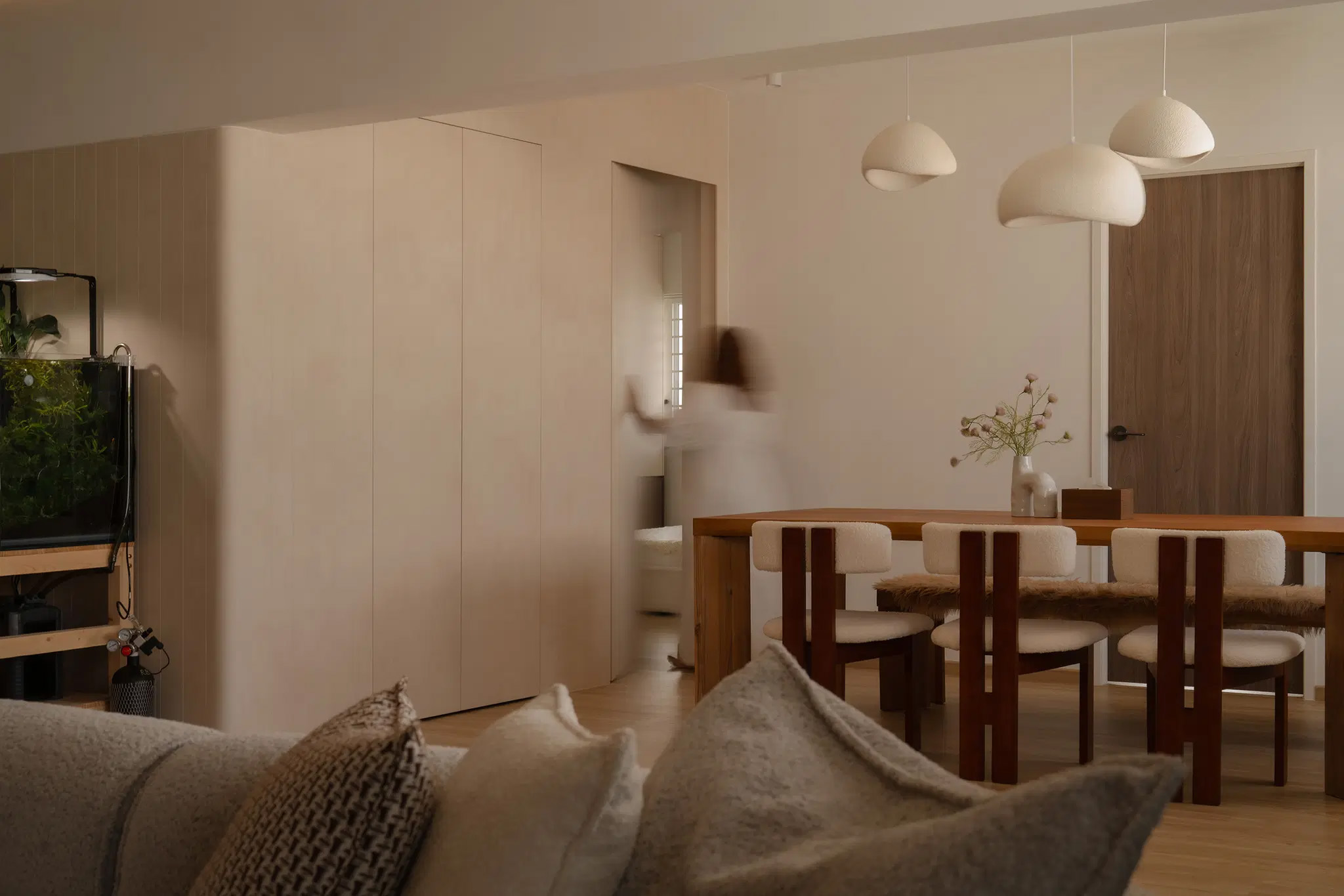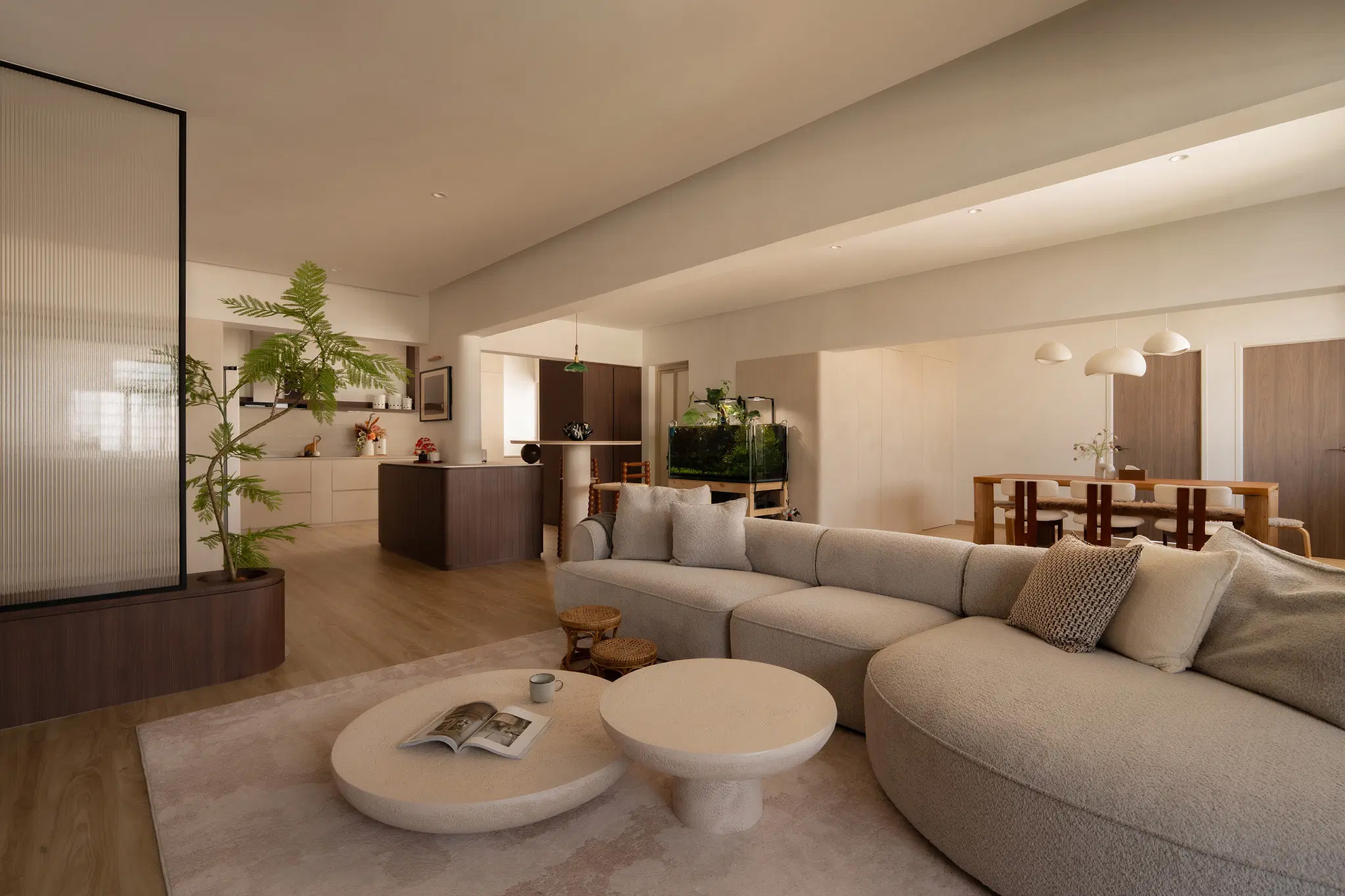 Từ khóa: Thiết kế nội thất tông màu kem, không gian sống tĩnh lặng, nghệ thuật sắp đặt chất liệu, nội thất gia đình hiện đại ấm cúng, phong cách tối giản sang trọng.