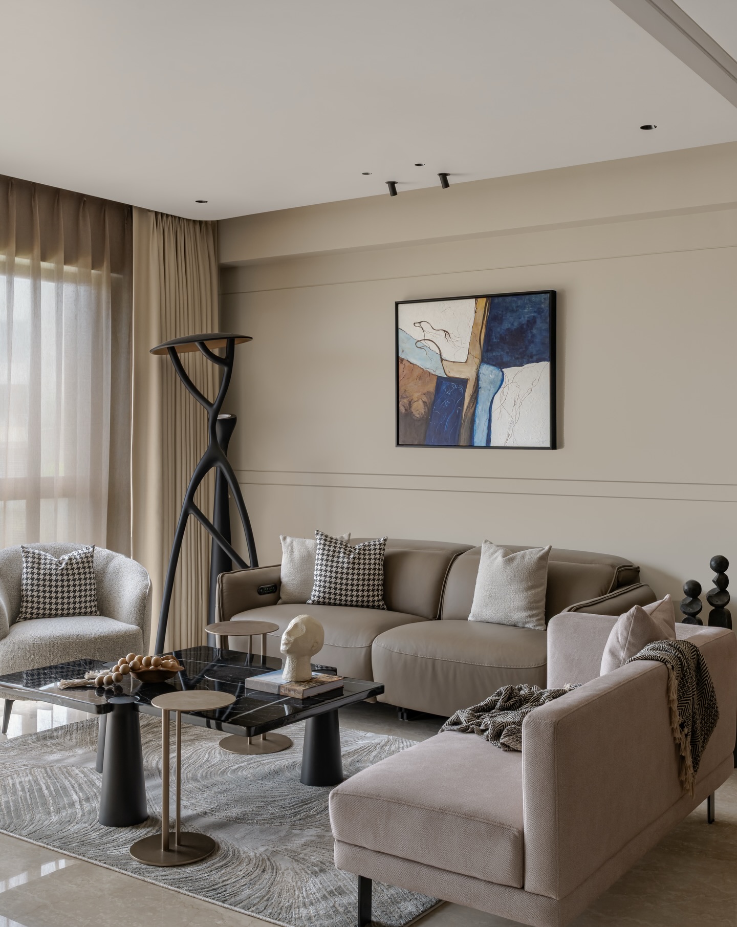 Chiều sâu từ chất cảm: Những lớp kết cấu đan xen nhẹ nhàng từ vải bọc nội thất đến các bề mặt hoàn thiện mang lại chiều sâu cho phông nền trung tính. Đồng thời, những tác phẩm nghệ thuật, đồ lưu niệm và phụ kiện trang trí được tuyển chọn kỹ lưỡng đã khéo léo đưa những điểm nhấn màu sắc và cá tính riêng vào không gian.