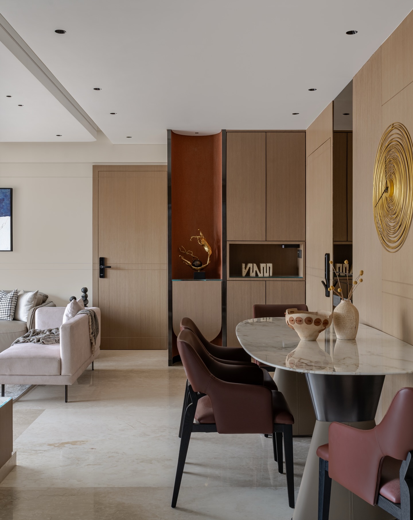 Ngôn ngữ thiết kế của căn hộ được xây dựng dựa trên một bảng màu be đồng nhất và xuyên suốt: