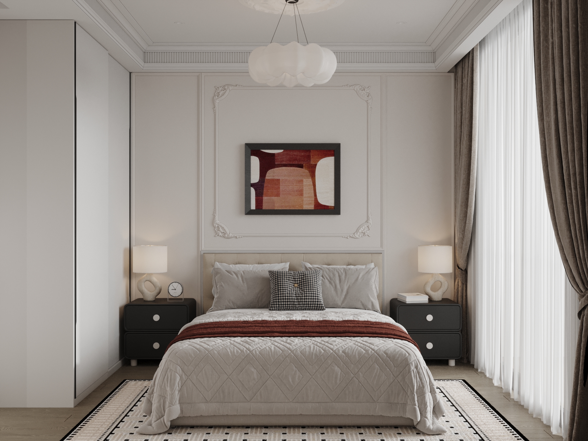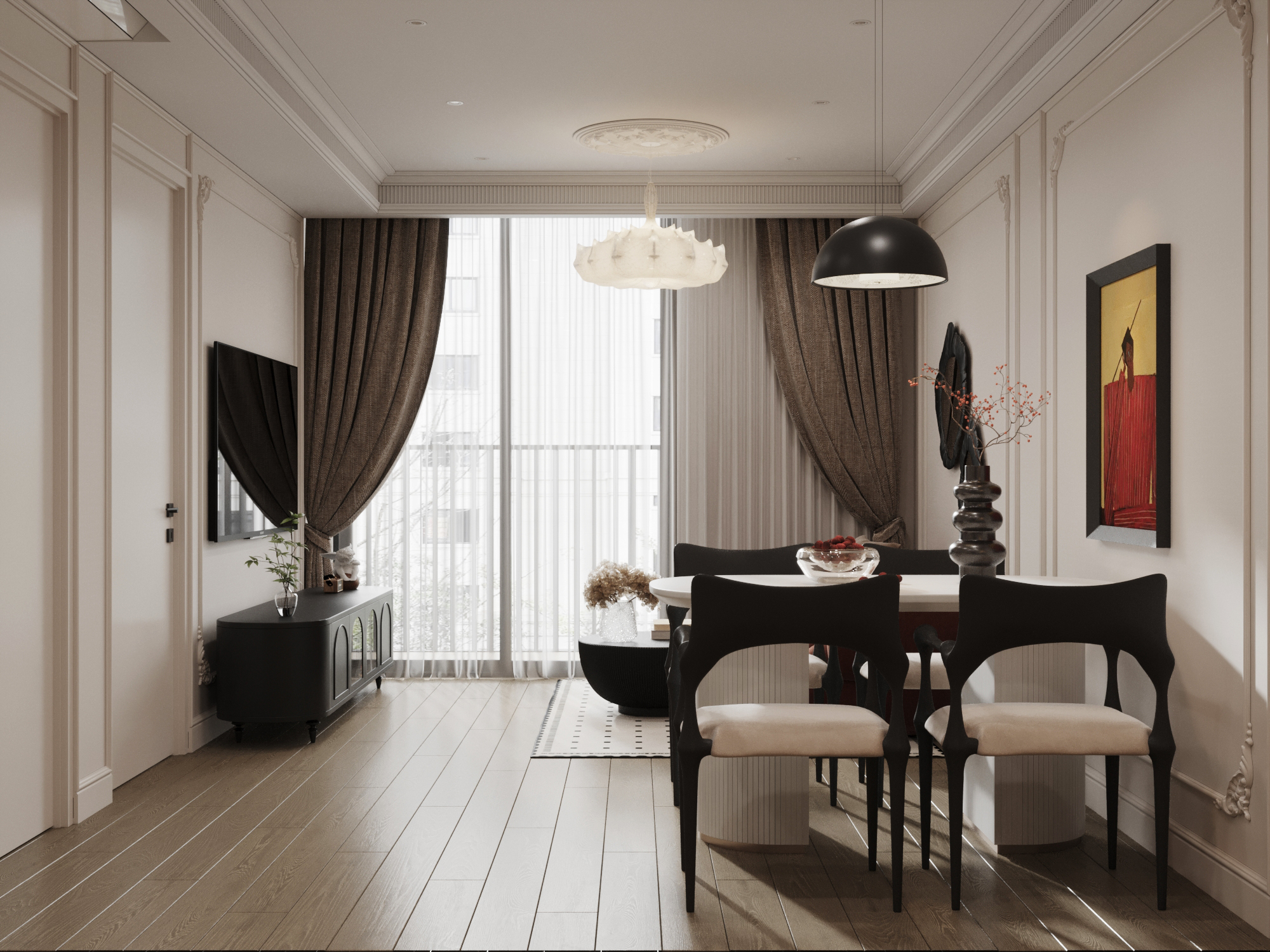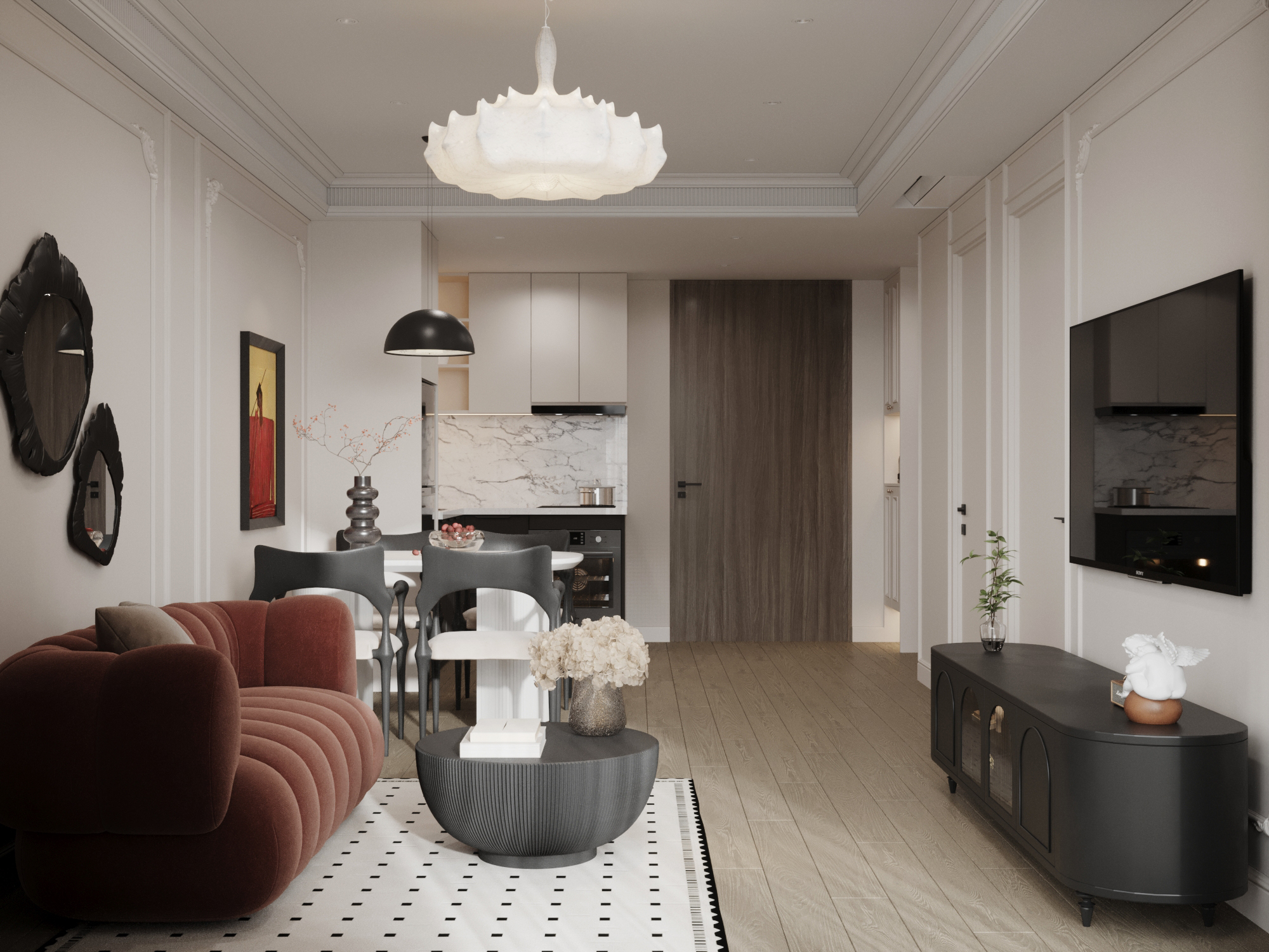 Parisian Chic (Phong cách Paris) không đơn thuần là một lối thiết kế, nó là hiện thân của vẻ đẹp “không cần cố gắng” (effortless beauty) – tựa như thần thái của một quý cô Pháp: mái tóc rối nhẹ nhàng, son đỏ quyến rũ và sự tự tin không thể sao chép. Cốt lõi của phong cách này bắt nguồn từ sự trân trọng tuyệt đối với di sản kiến trúc: giữ lại nguyên vẹn những đường phào chỉ thạch cao cầu kỳ, trần nhà cao thoáng đãng và đặc biệt là sàn gỗ xương cá (Herringbone) trứ danh như một phông nền lịch sử hào hoa.