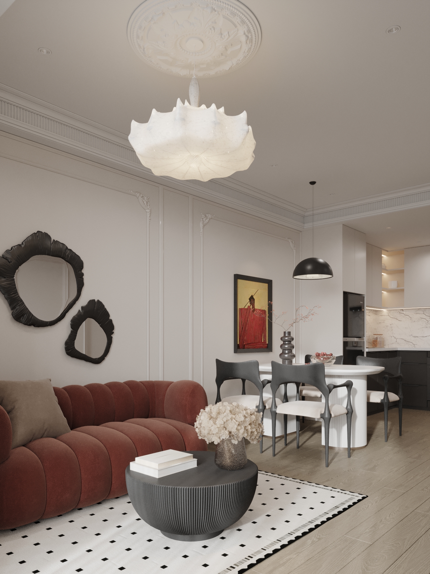 Thế nhưng, chất “thơ” lãng mạn lại bùng nổ chính ở cách “mix & match” nội thất đầy ngẫu hứng và táo bạo. Trong không gian Parisian Chic, ranh giới thời gian dường như bị xóa nhòa: một chiếc sofa nhung hiện đại có thể đứng kiêu hãnh bên cạnh lò sưởi đá cẩm thạch cổ điển; một bức tranh trừu tượng cỡ lớn lại tìm thấy sự hòa hợp kỳ lạ với chiếc gương mạ vàng nhuốm màu thời gian. Không chạy theo sự hoàn hảo bóng bẩy hay hào nhoáng, phong cách này tôn vinh những món đồ có “hồn”, có câu chuyện và đậm chất nghệ thuật, kiến tạo nên một không gian sống phóng khoáng, kiêu kỳ và sang trọng một cách đầy tự nhiên.