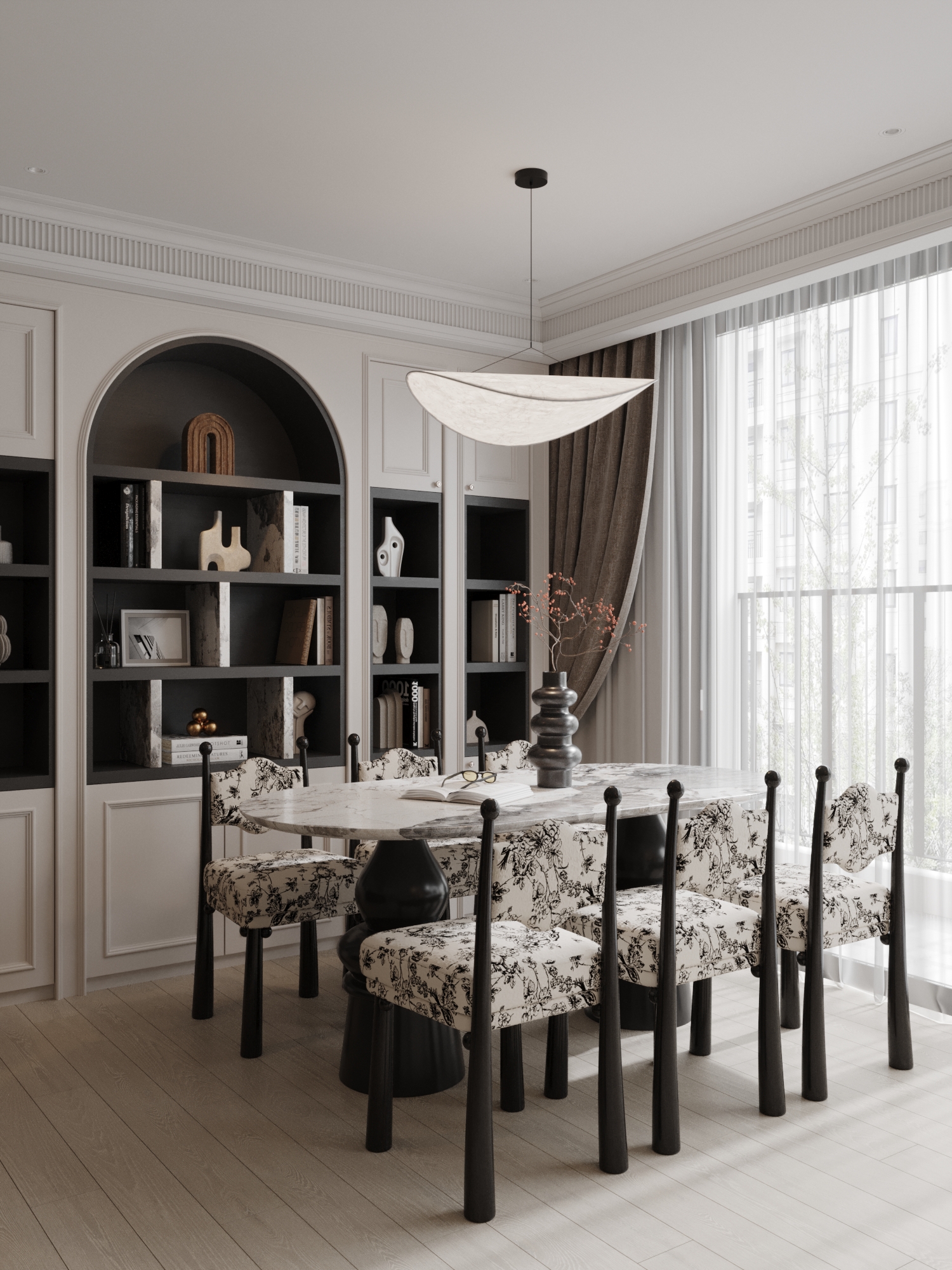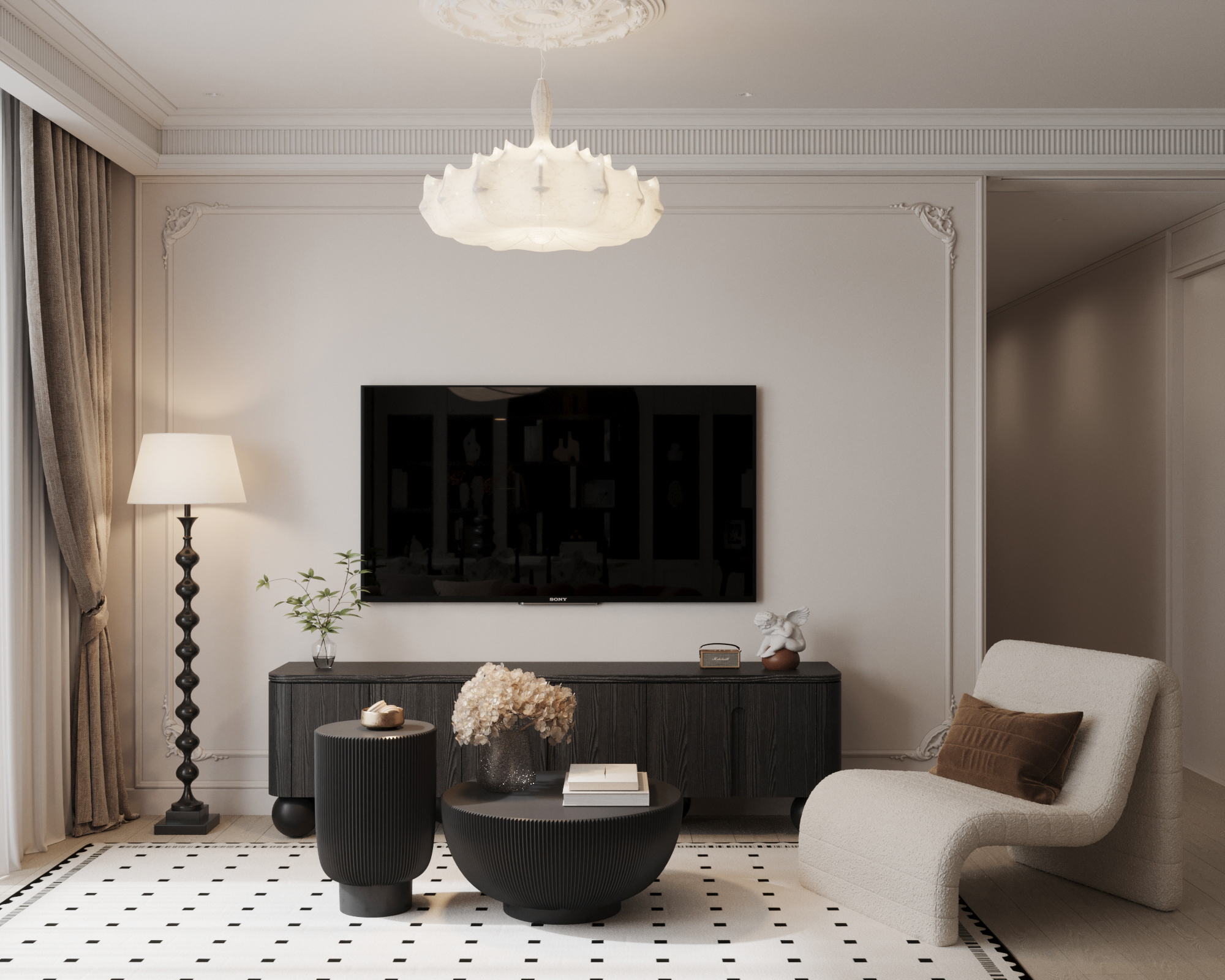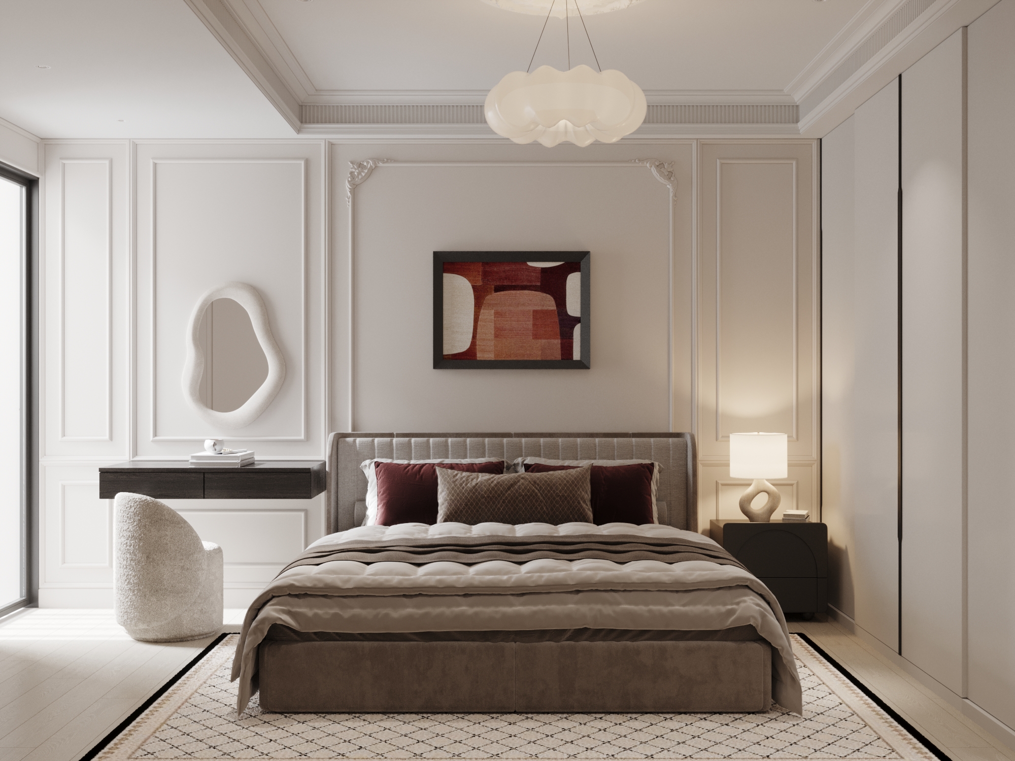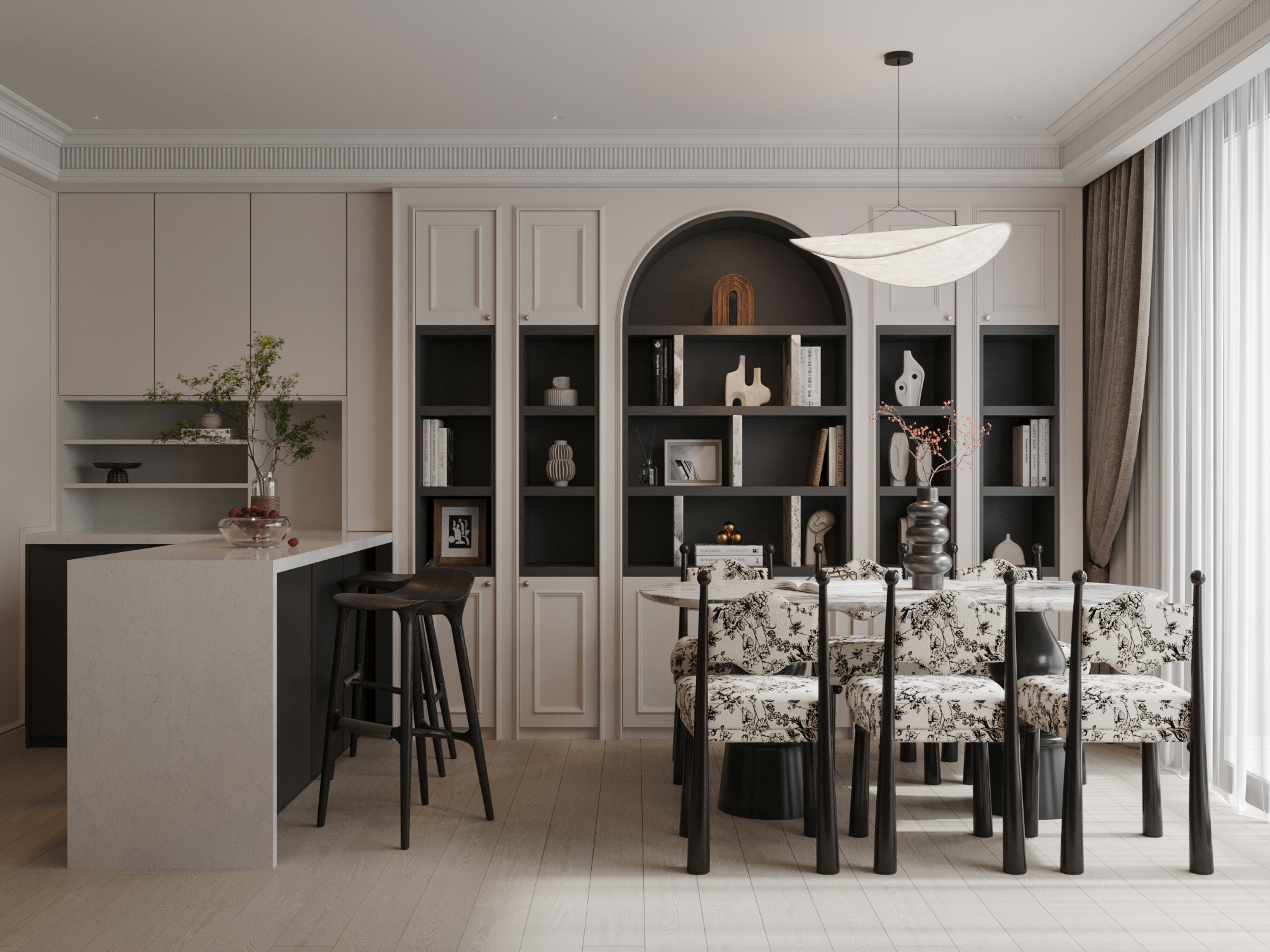 Linh hồn của không gian nằm ở cuộc đối thoại đầy mê hoặc giữa quá khứ và hiện tại. Đó là nơi những đường phào chỉ thạch cao cầu kỳ và trần nhà cao vút (high ceilings) của kiến trúc cổ điển lùi lại làm phông nền, nhường sân khấu cho những món nội thất hiện đại đầy cá tính tỏa sáng. Tại đây, ánh sáng tự nhiên không chỉ đơn thuần là công năng, mà là một chất liệu nghệ thuật: nó vuốt ve mặt sàn gỗ xương cá (Herringbone) trứ danh và phản chiếu lấp lánh trên những chiếc gương cổ mạ vàng nhuốm màu thời gian.