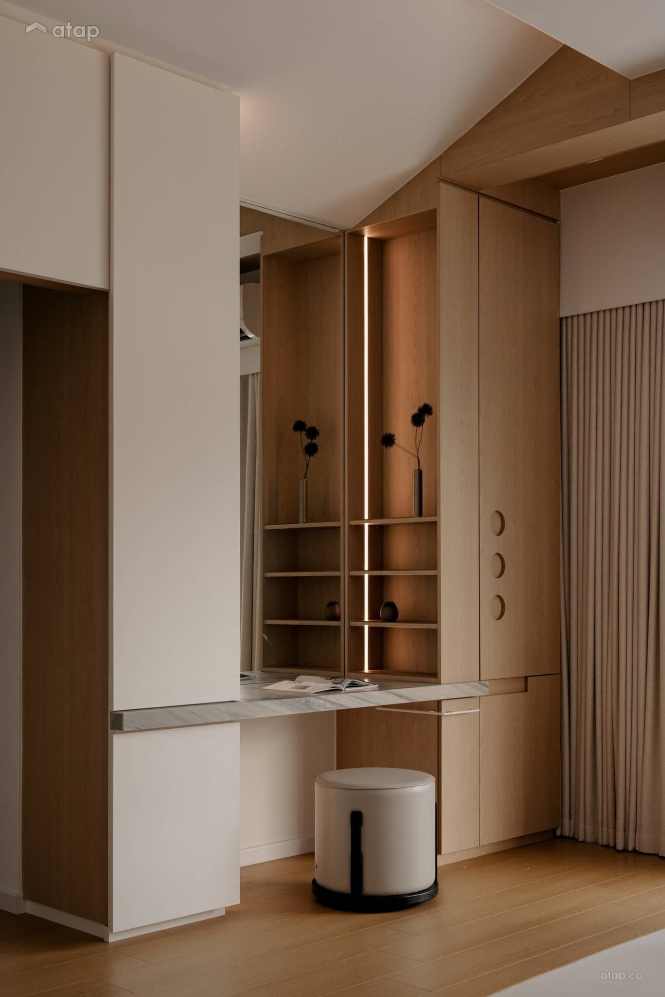 Tối ưu hóa công năng: Góc trang điểm nhỏ gọn và hệ tủ quần áo kịch trần màu sáng được tích hợp khéo léo, giải quyết triệt để bài toán lưu trữ mà vẫn giữ được sự thoáng đãng tối đa cho căn phòng.