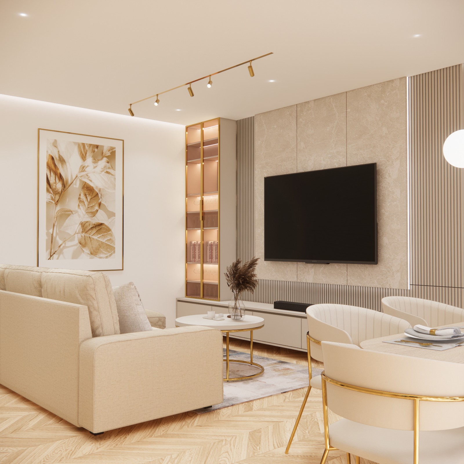 Từ khóa: Thiết kế phòng khách liền bếp sang trọng, nội thất đảo bếp hiện đại, chi tiết vàng kim trong kiến trúc, không gian sống màu sắc nhất quán, thiết kế sảnh đón căn hộ cao cấp.