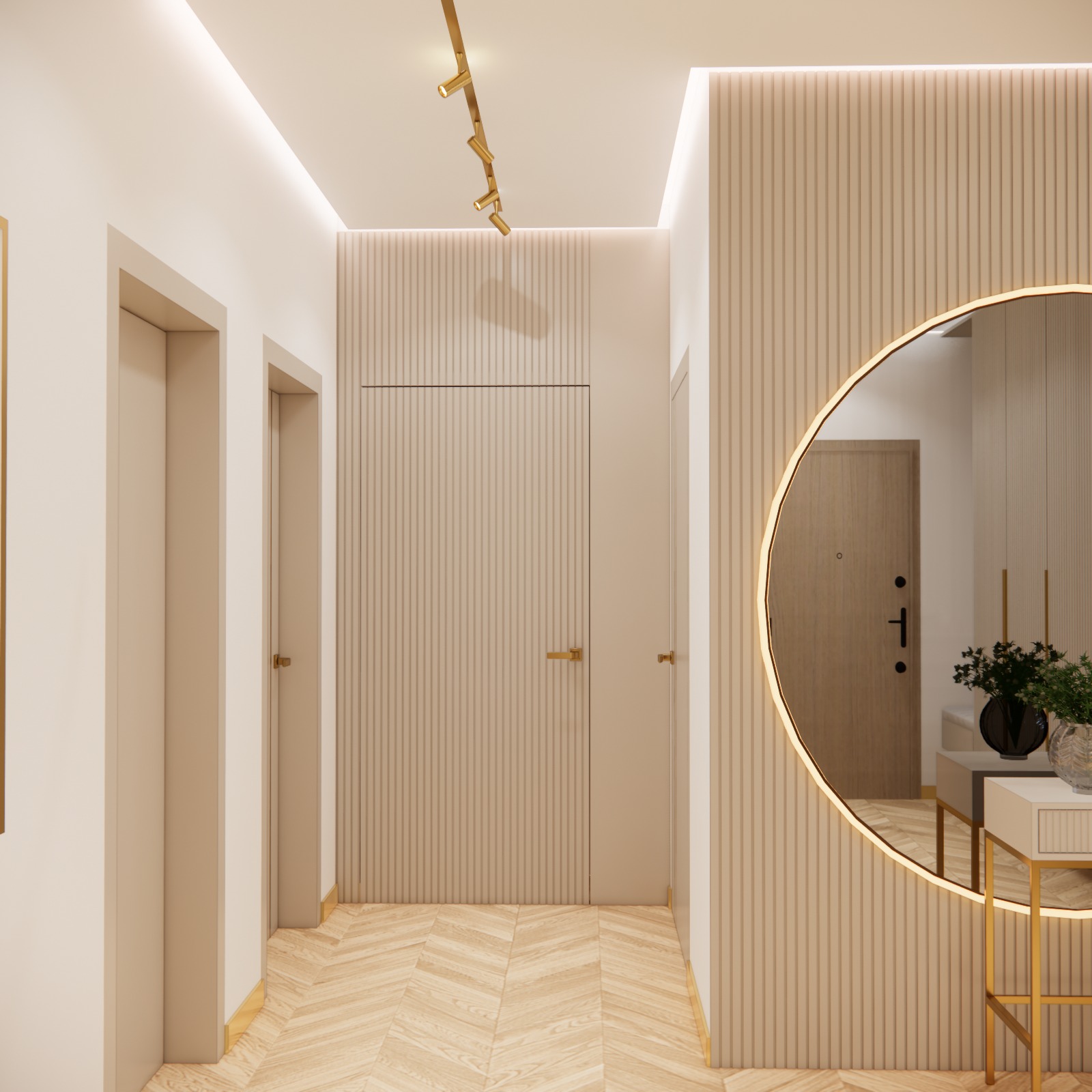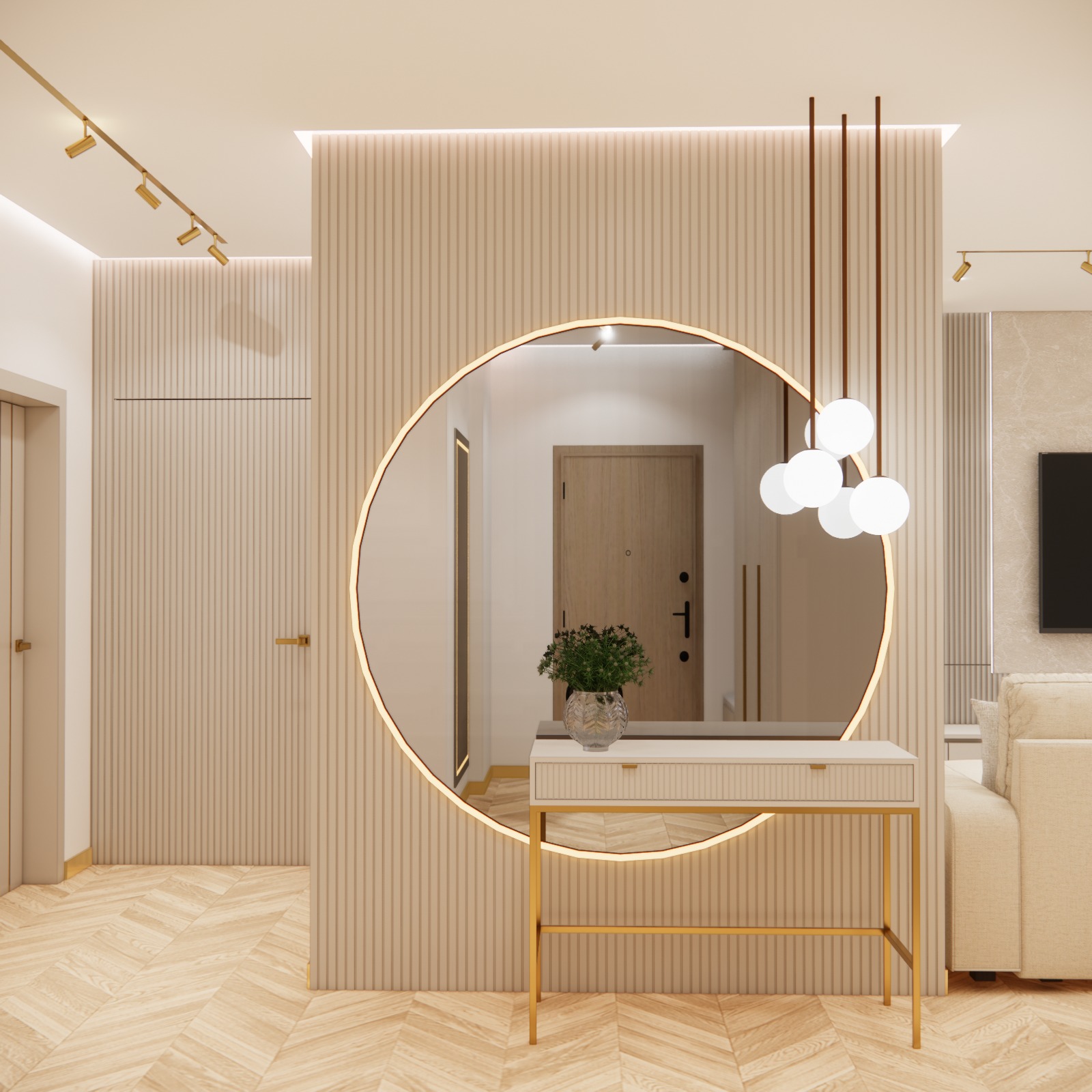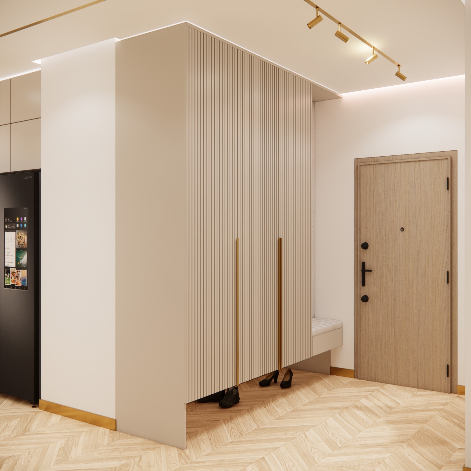 Sảnh đón (Hall): Được thiết kế với tư cách là không gian đại diện, sảnh đón không chỉ đề cao sự tiện nghi qua hệ tủ lưu trữ thông minh mà còn gây ấn tượng bởi ngôn ngữ thiết kế chỉn chu, dẫn dắt cảm xúc của khách ngay từ bước chân đầu tiên vào nhà.