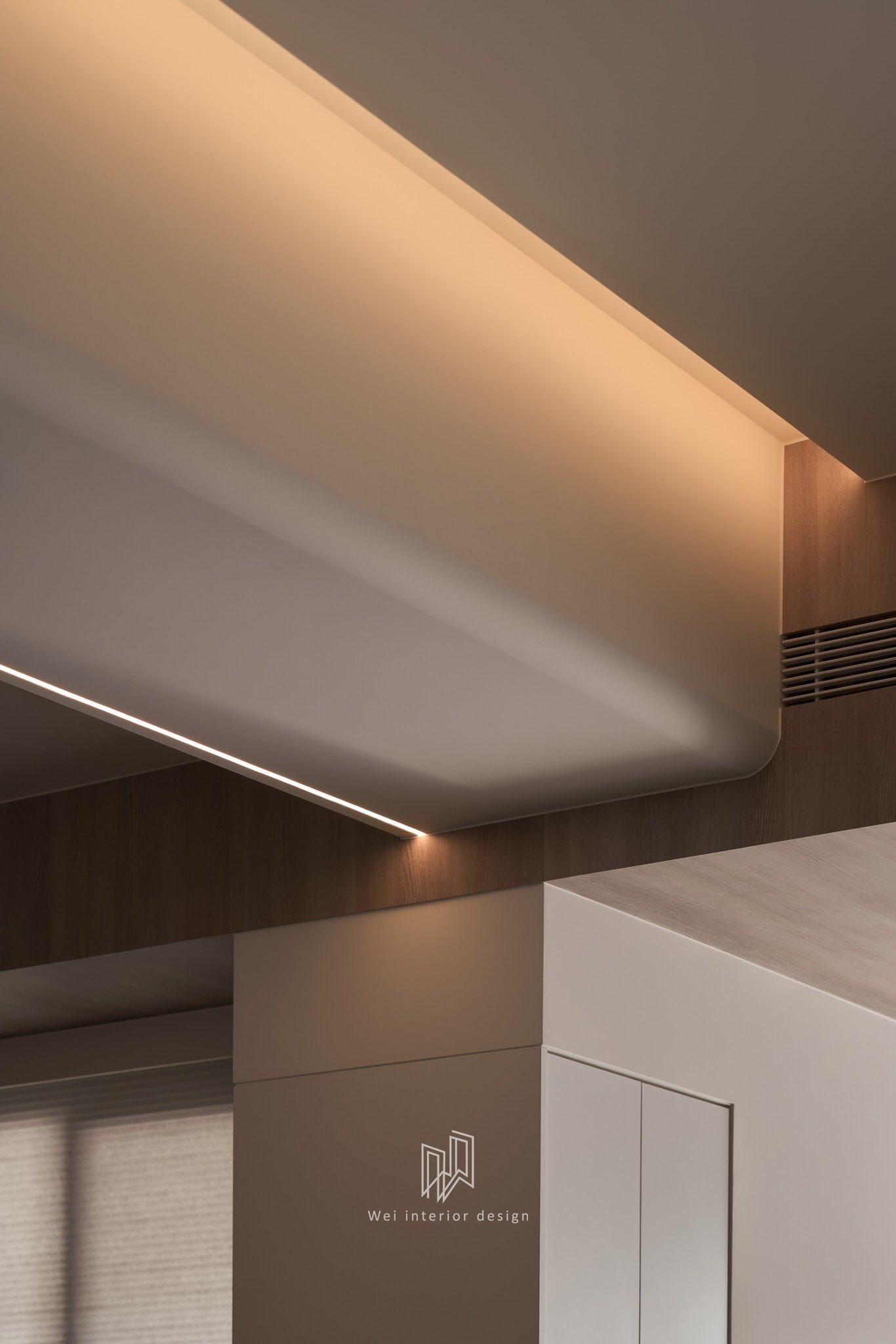 Hệ đèn LED âm (Aluminum Profile Light): Những dải đèn LED chạy dọc theo các khối kiến trúc tạo nên những đường dẫn ánh sáng hiện đại, giúp tôn vinh các đường nét của đồ gỗ và sơn hiệu ứng.