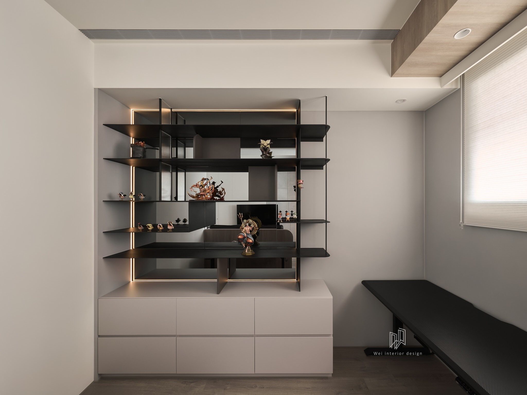 Sự cân bằng: Ánh sáng len lỏi qua các khe sắt và kính sọc, tạo nên những khoảng sáng tối đan xen, mang lại cảm giác bình yên và chiều sâu cho một căn hộ diện tích nhỏ.