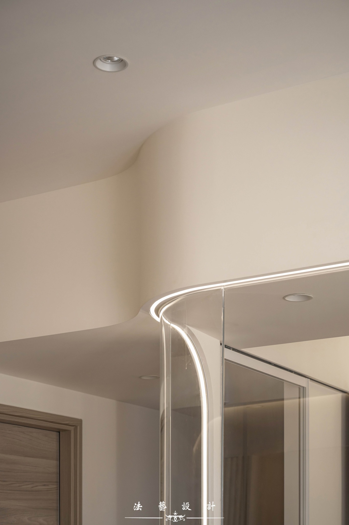 Phòng làm việc được bao bọc bởi hệ vách kính uốn cong mềm mại, kết hợp cùng chất liệu vân gỗ ấm áp: