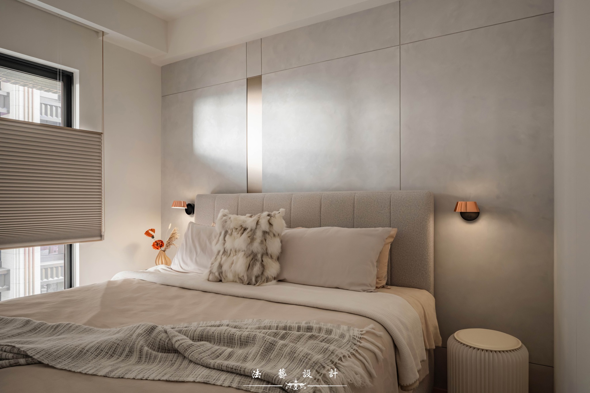 Phòng ngủ chính: Bức tường được đẩy lùi nhẹ nhàng ra ngoài, mang lại một không gian lưu thông rộng rãi và thong dong hơn. Tủ kệ lưu trữ được tích hợp vô hình, giữ cho căn phòng luôn gọn gàng và cân bằng.