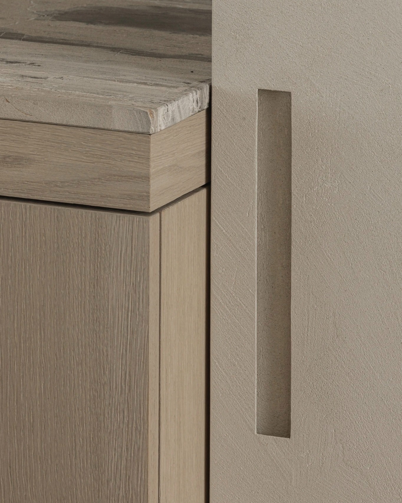 Hơi ấm chở che của gỗ: Chất liệu gỗ tự nhiên timber được lồng ghép vô cùng khéo léo để trung hòa sự lạnh lẽo của đá. Những đường vân gỗ uyển chuyển mang lại nhiệt độ ấm áp, tạo nên một lớp vỏ bọc an toàn và thân thuộc.